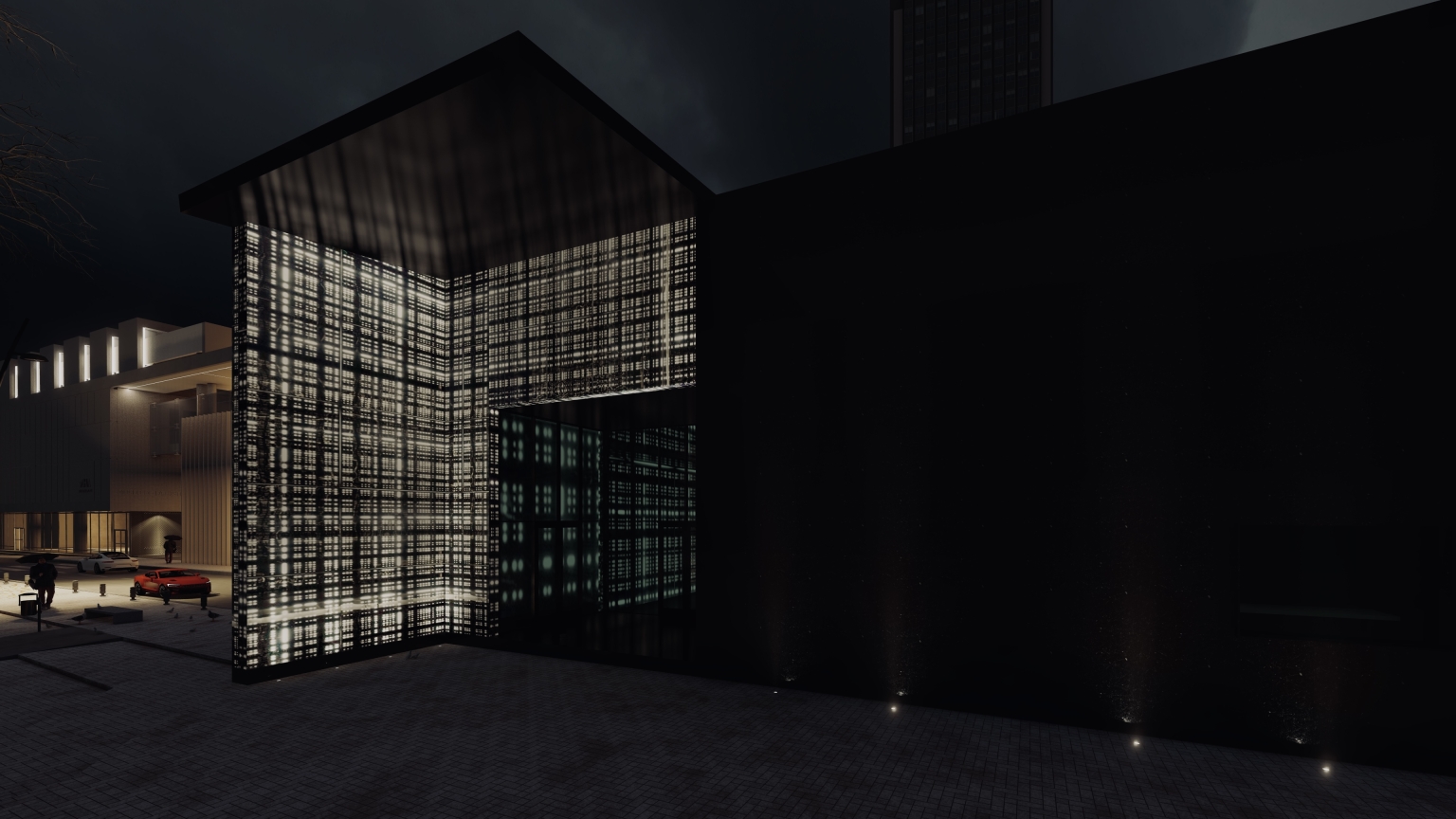 The reception area exudes a dark atmosphere, inviting visitors into a journey of discovery. Subtle, ambient lighting guides visitors through the space. Patterns of light lead them into the main gallery, where an organic glass sculpture is suspended above a pool of water.