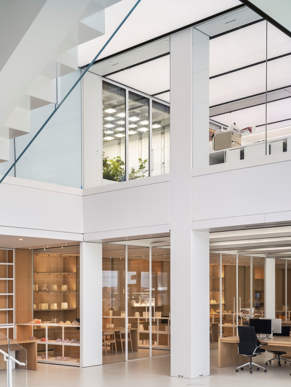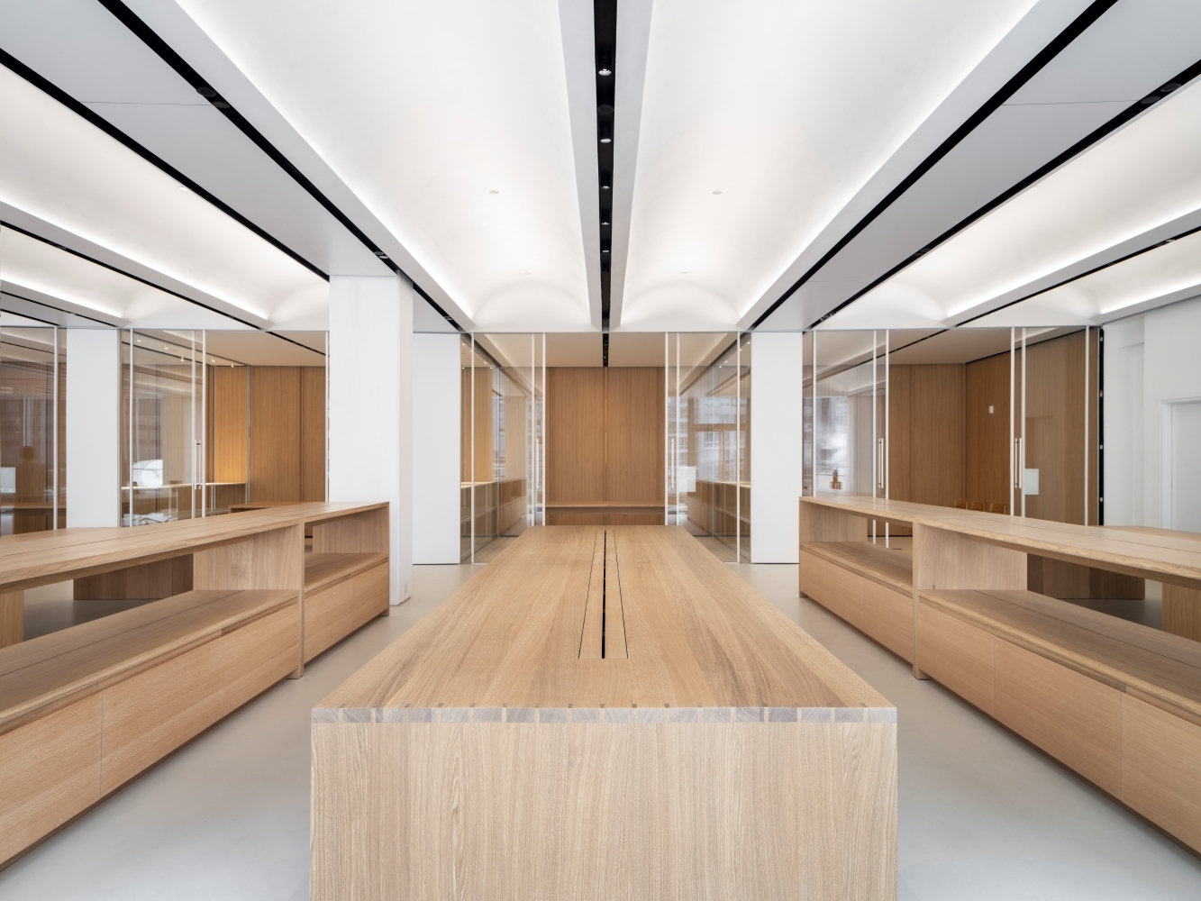 The warmth of enclosed offices accentuated by wood cabinetry, is celebrated with 3000K concealed linear uplights and mini trackheads adding focus on showcased items. Between offices, small heads with snoots eliminate harsh reflections while illuminating artwork within clear volumes, enhancing the visual identity of the transparent boundaries and preserving a continuous flow between spaces.