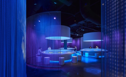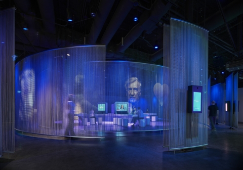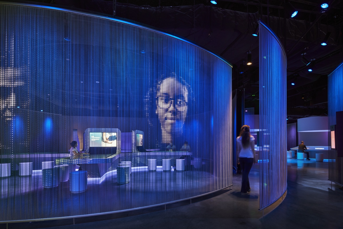 From project onset, the lighting design team participated in coordination and material selection meetings that culminated in the concept of color-changing lighting with a translucent metal coil “veil” that acts as a cohesive partition element to define exhibition spaces and a display surface to project AV content. Integration with other elements in the exhibit was of critical importance, requiring close collaboration to achieve successful lighting details within a tight 18-month schedule.