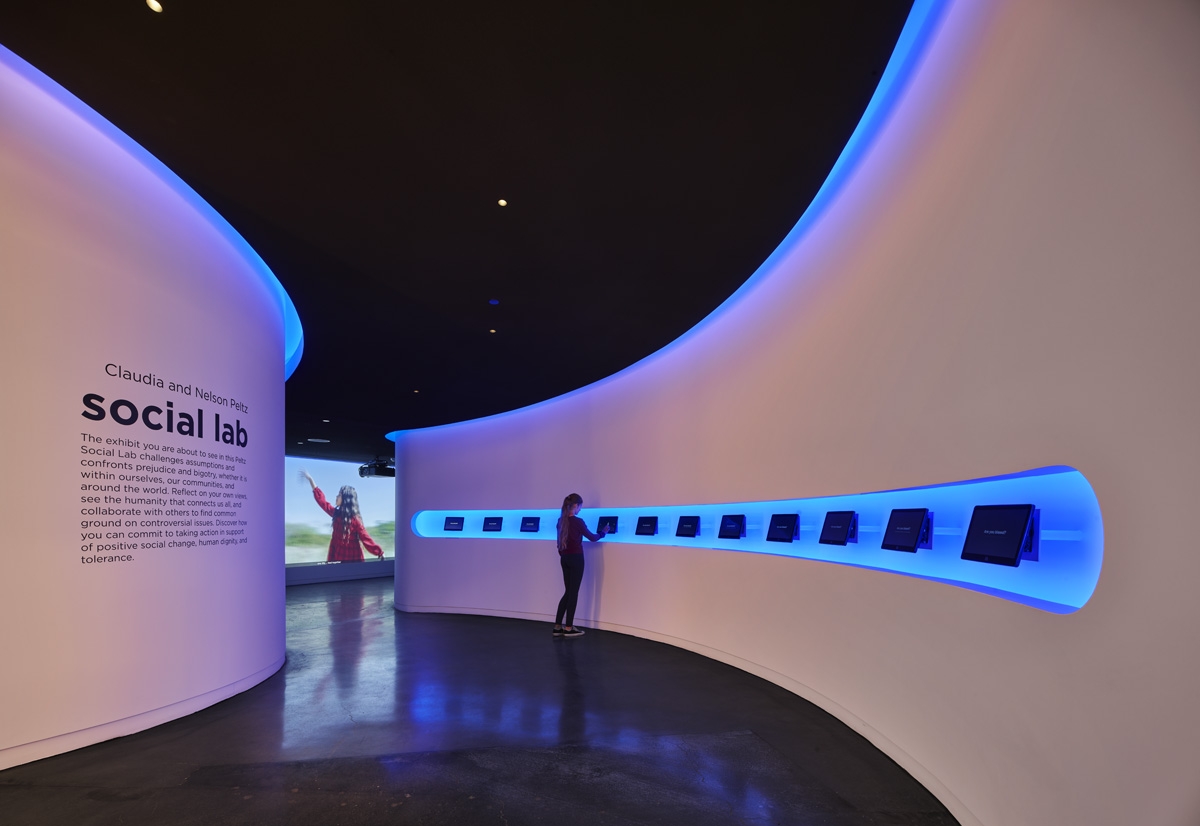 Entry DescriptionThe Museum of Tolerance Social Lab was created to promote a sense of unity in an increasingly diverse society, providing an immersive and interactive space for visitors to confront difficult social issues. A balanced lighting approach was necessary to promote compositional harmony in the exhibit, setting the tone while keeping the focus on the AV content, and tying together 15 distinct exhibits while catering to their individual lighting needs.