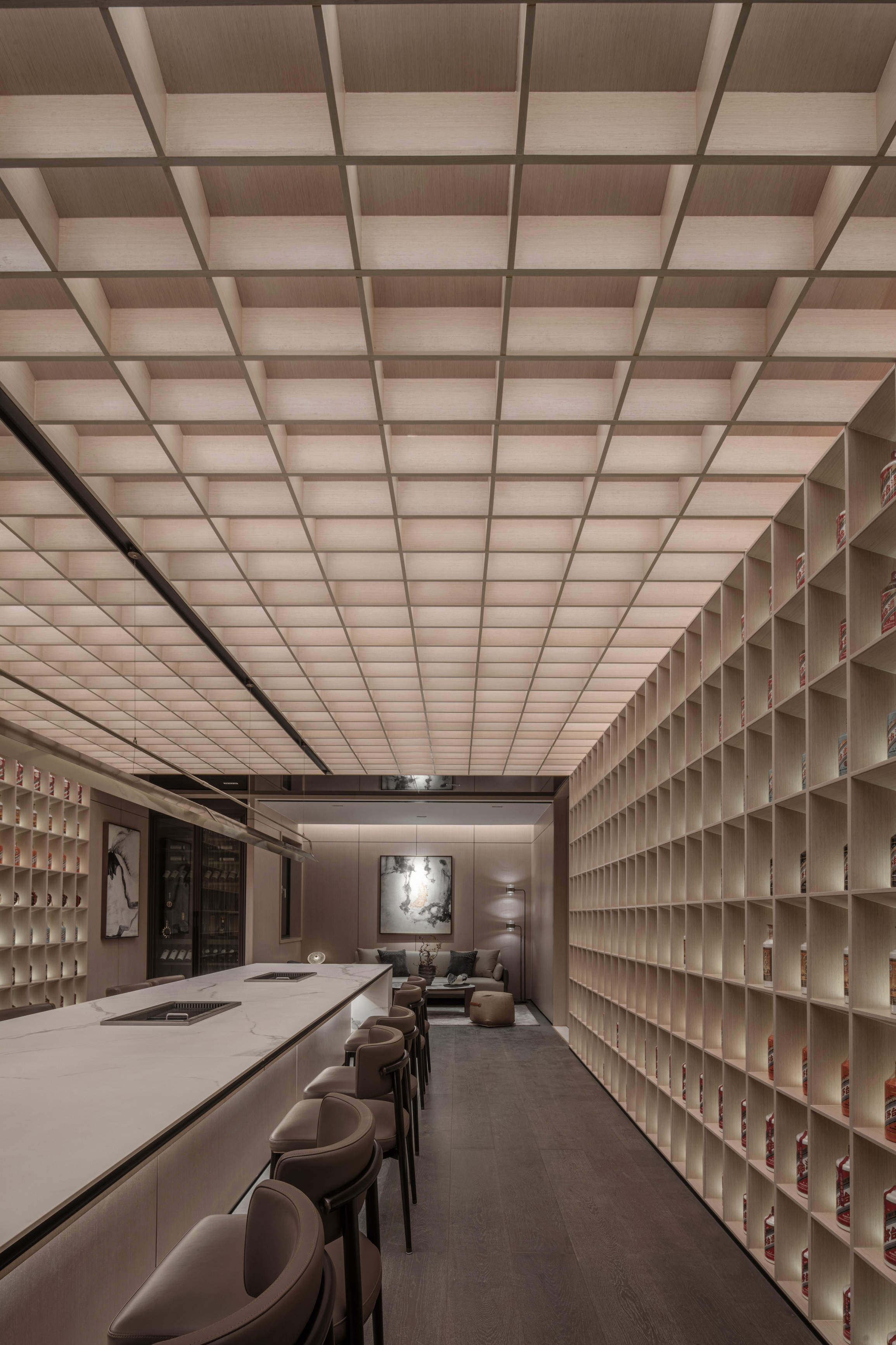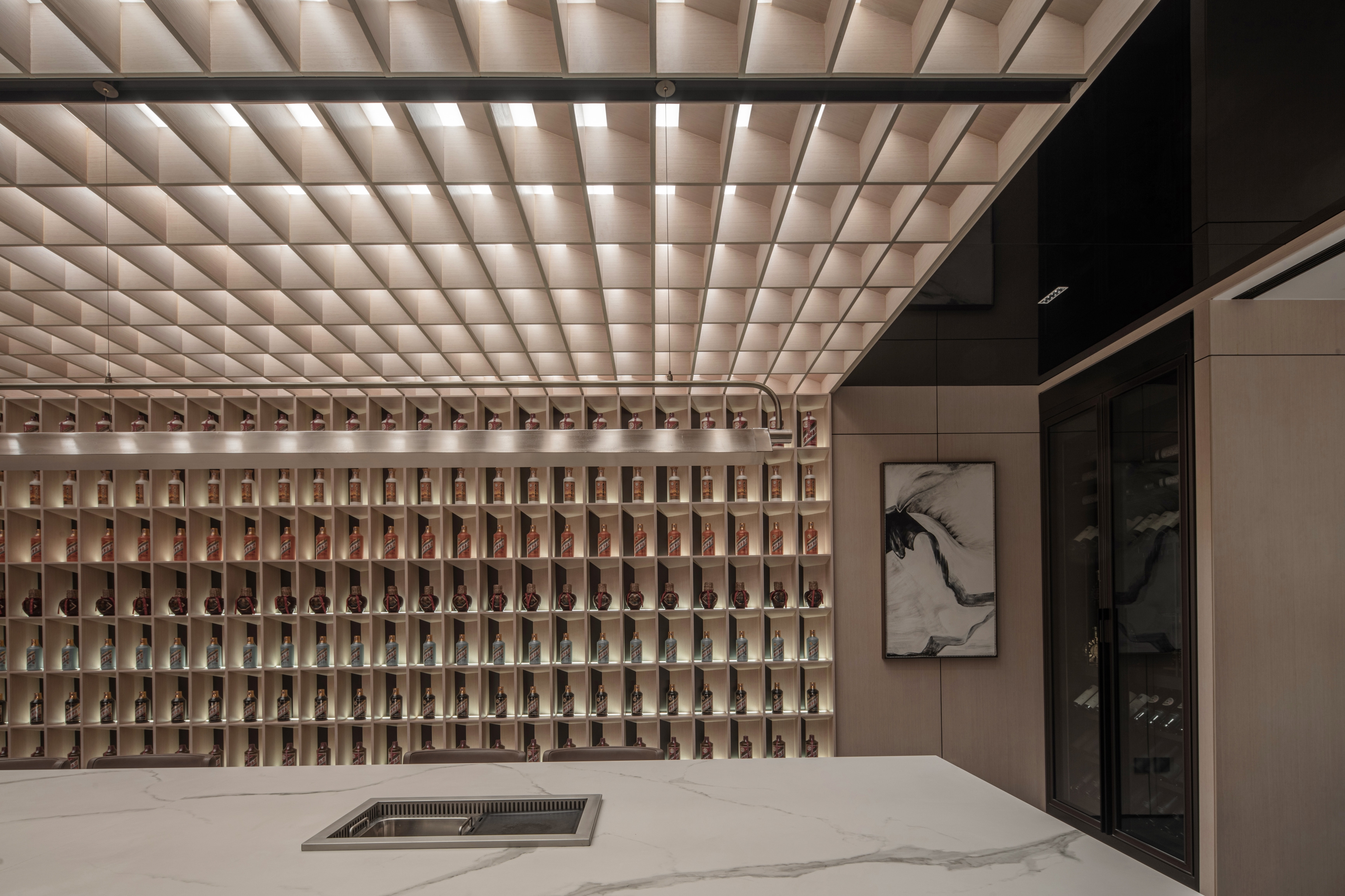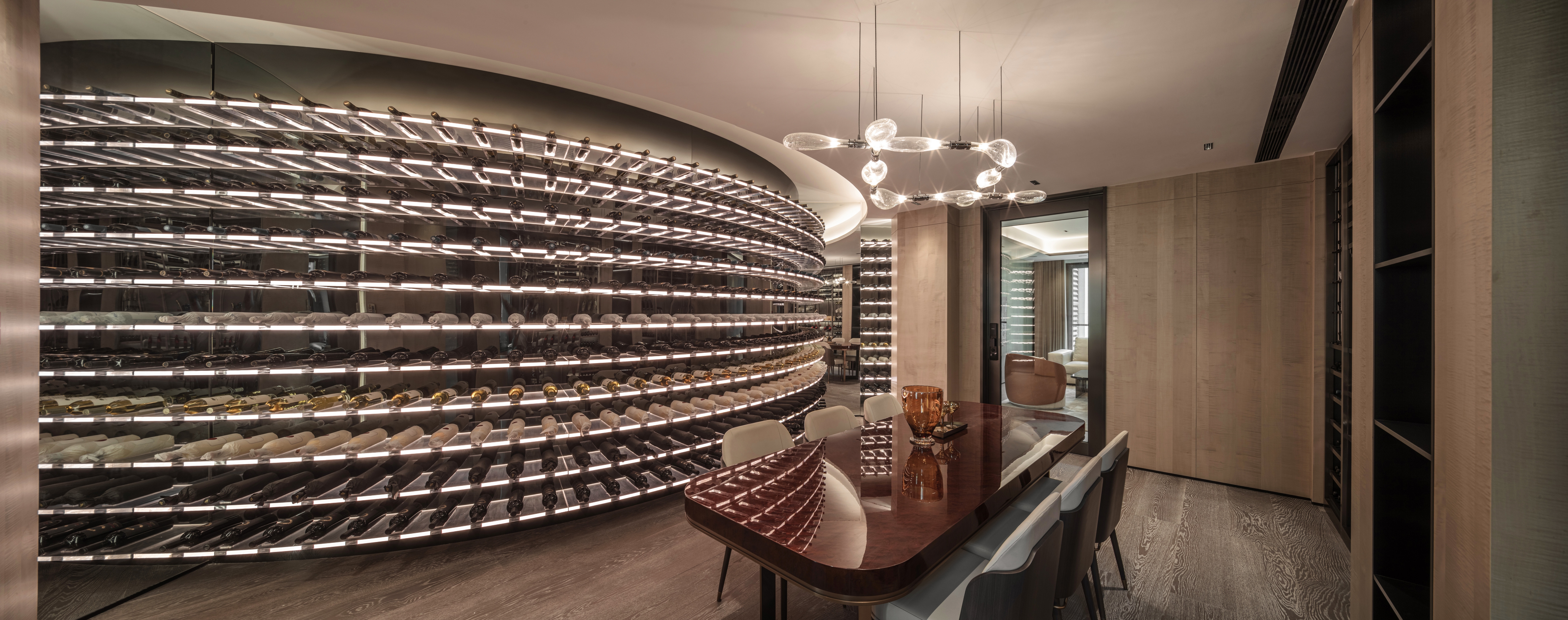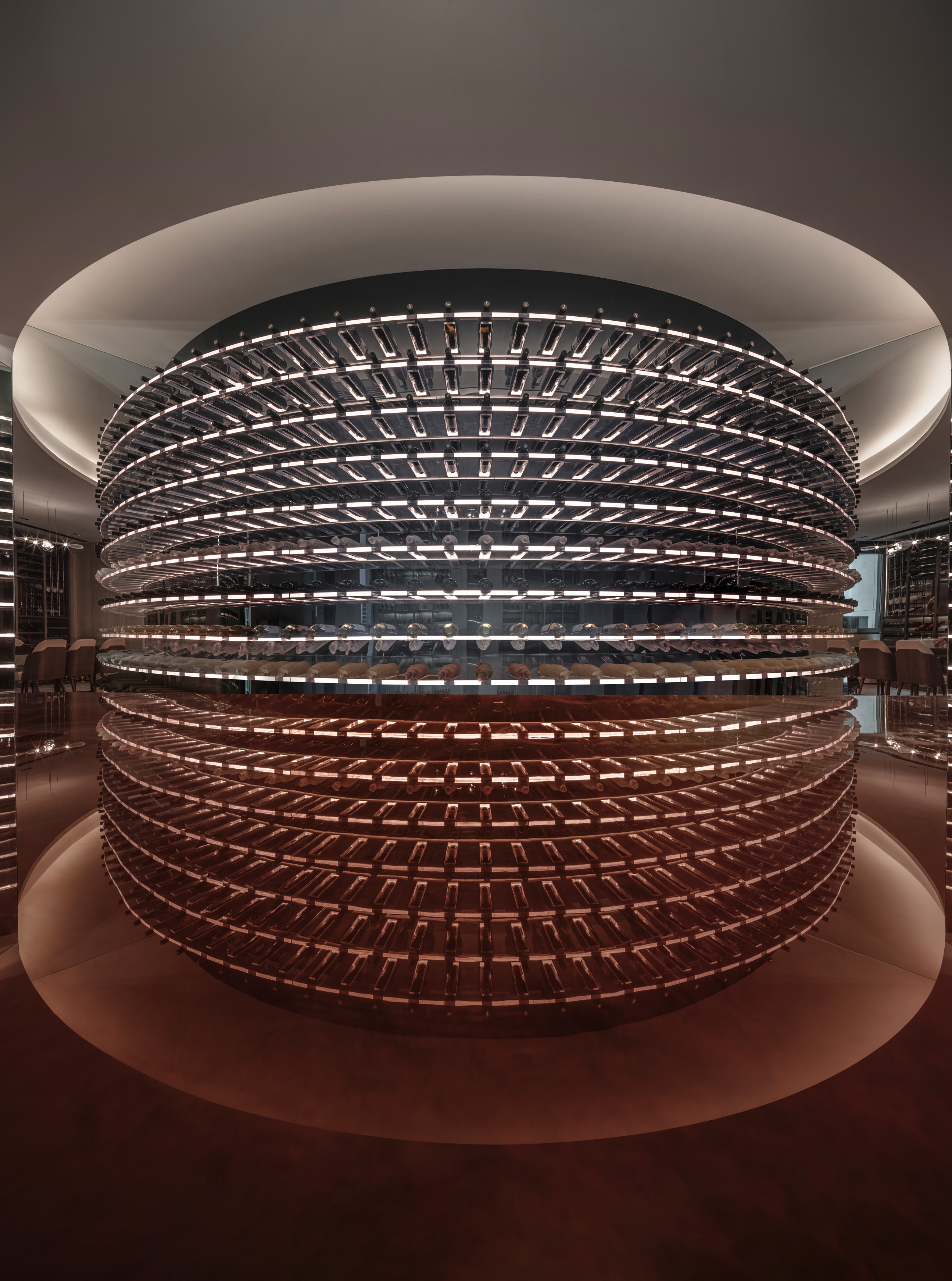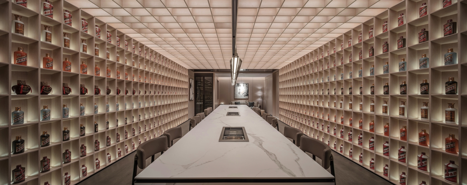 The circle symbolizes completeness and harmony, reflecting the Chinese philosophical concept of "unity of heaven and humanity." In this design, the circle is not only a revered totem but its application in lighting design also explores the connection between space and emotional needs. For instance, the wine cellar and dining area use circular and tiered lighting designs to provide uniform and comfortable illumination, emphasizing continuity and harmony in the space.