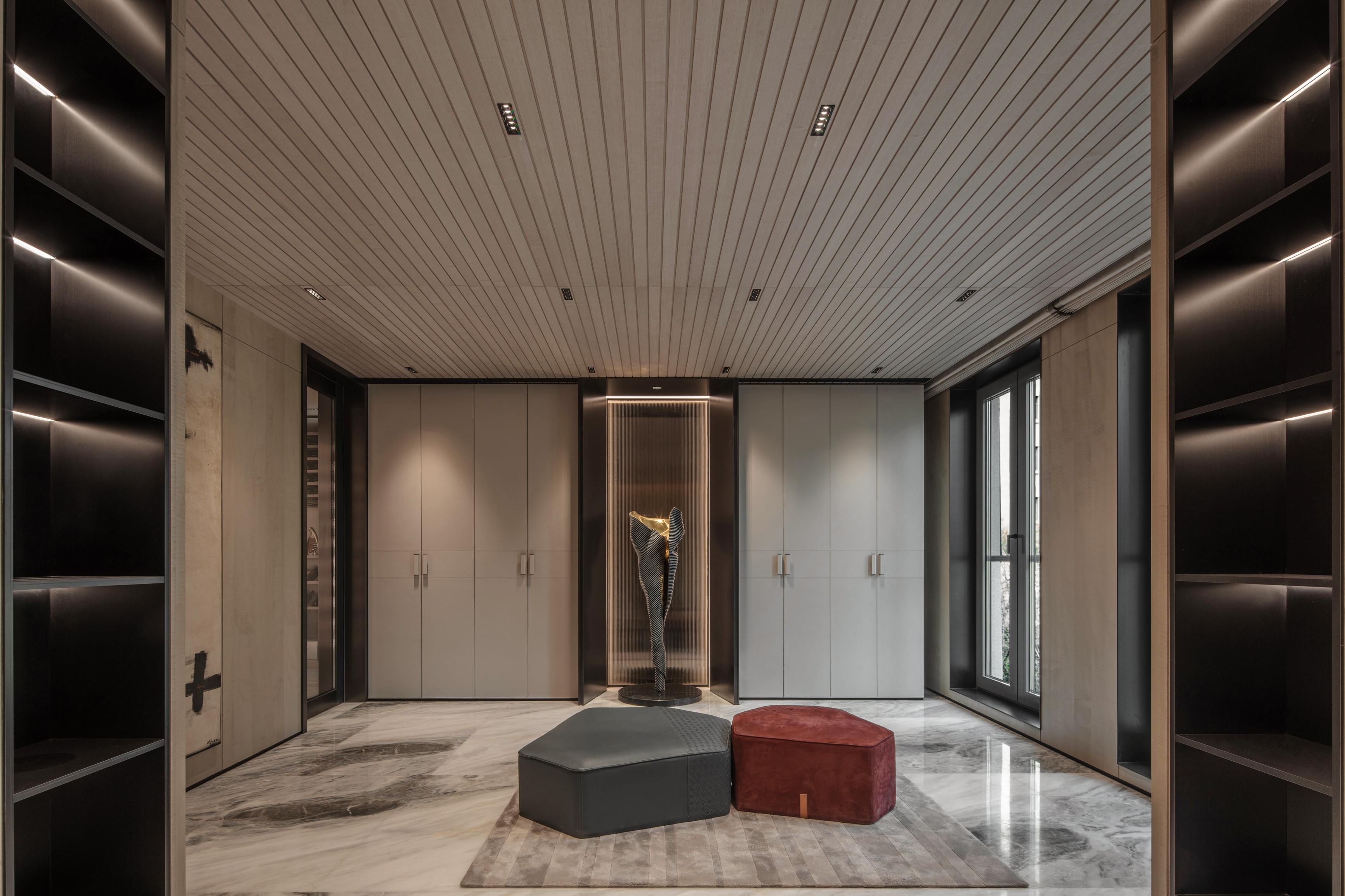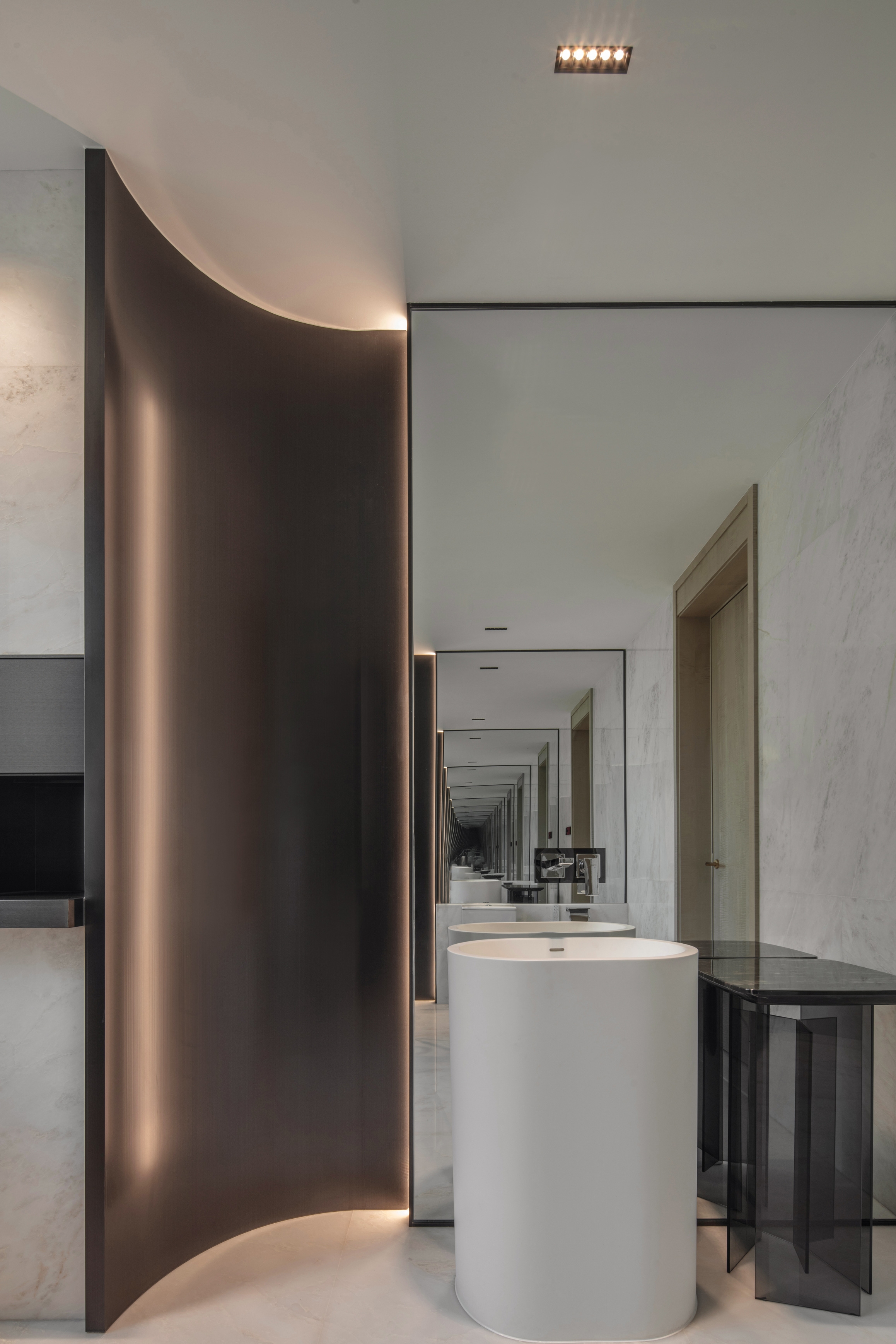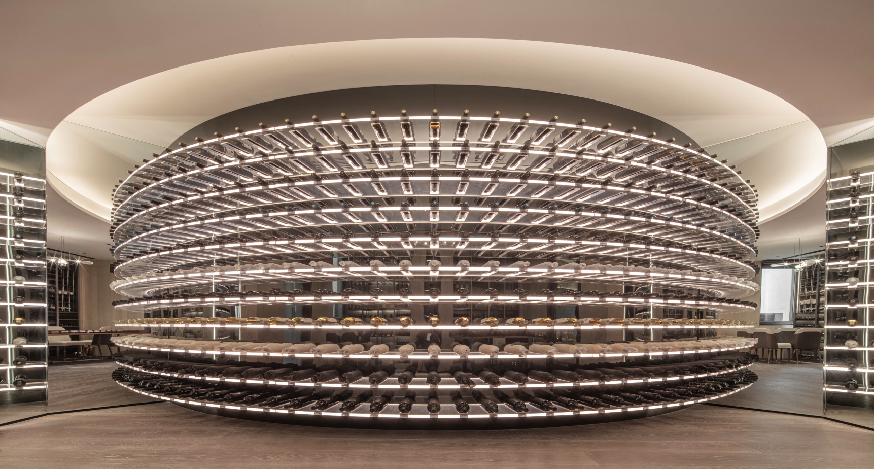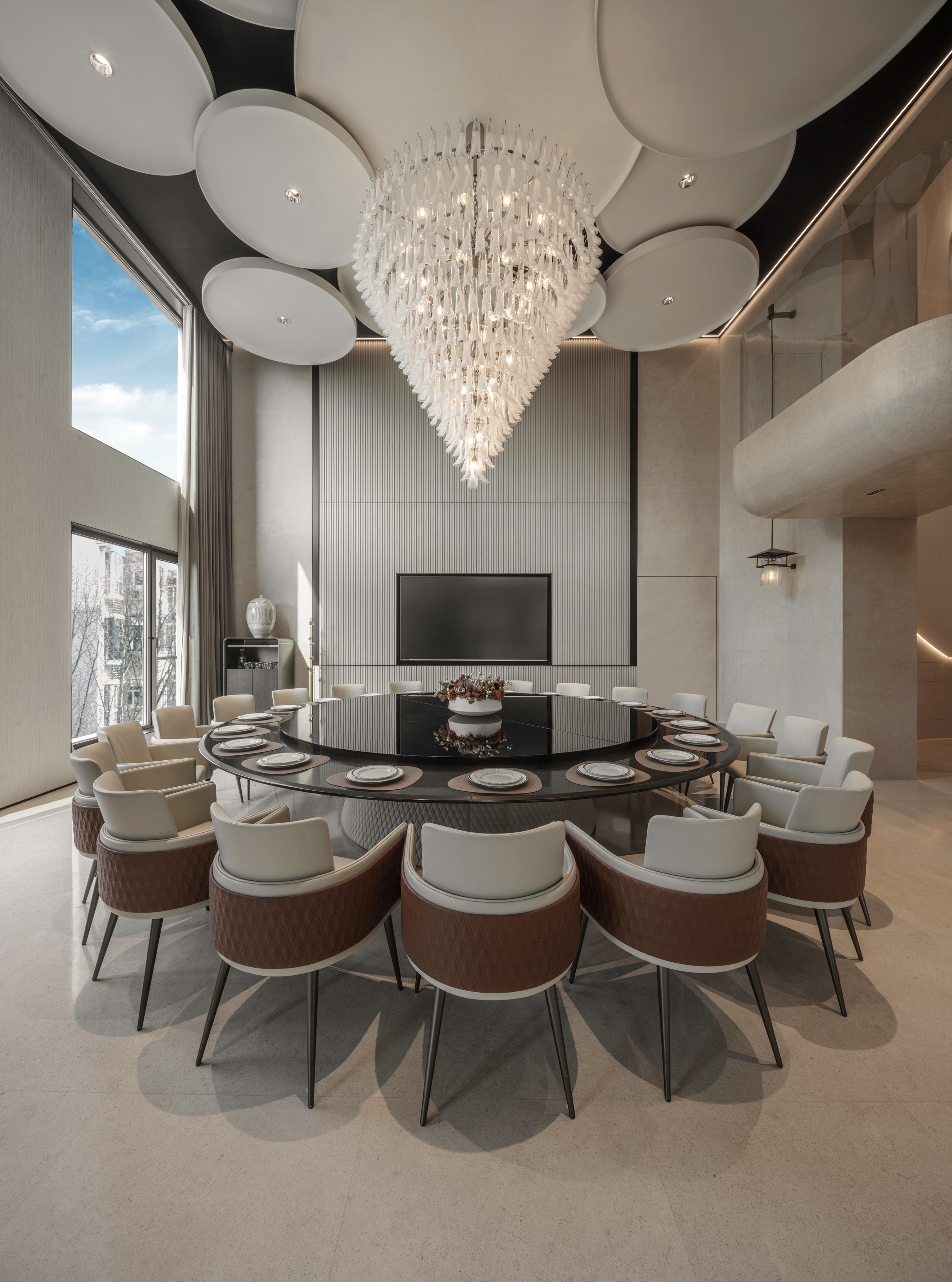 The circle symbolizes completeness and harmony, reflecting the Chinese philosophical concept of "unity of heaven and humanity." In this design, the circle is not only a revered totem but its application in lighting design also explores the connection between space and emotional needs. For instance, the wine cellar and dining area use circular and tiered lighting designs to provide uniform and comfortable illumination, emphasizing continuity and harmony in the space.
