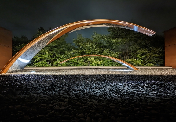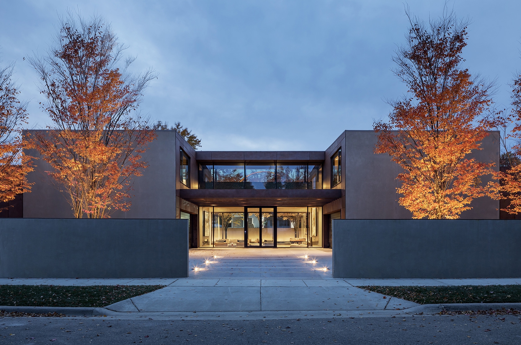 In the evening continuous exterior wall illumination expands the indoor space to the outdoors. Foliage and sculpture capture the uplight creating focal interest and yields a pleasant barrier to the surrounding.