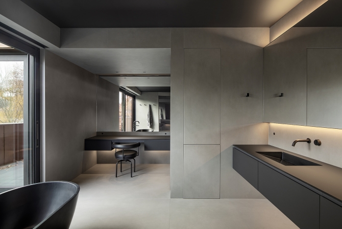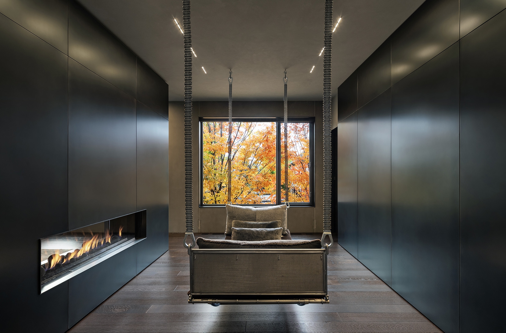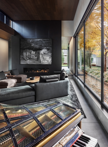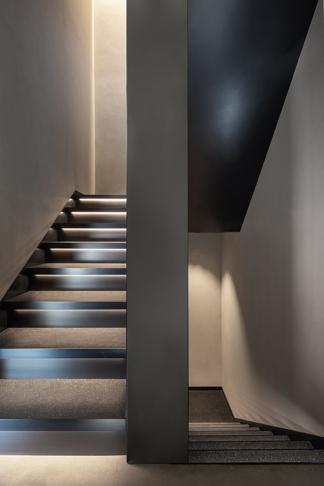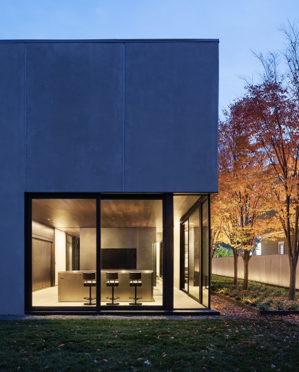 The grey, dark steel, plaster and concrete presented a challenge to balance highlight and shadow within the interior space. To support the architecture’s clean geometry, lighting took on an invisible form utilizing miniature low glare recessed fixtures and concealed architectural coves. 2700K light softened the bold concrete and steel materials in this domestic setting.