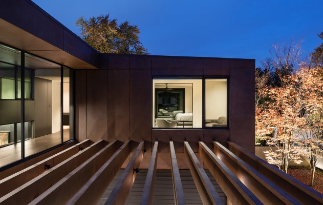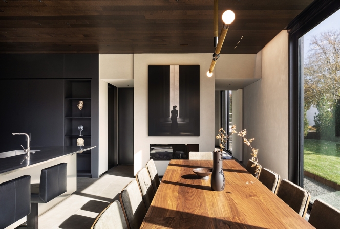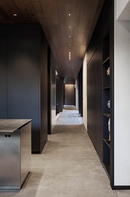 Set back from the road, this house presents a subdued material palette of weathered-steel, unpainted plaster, and polished concrete.