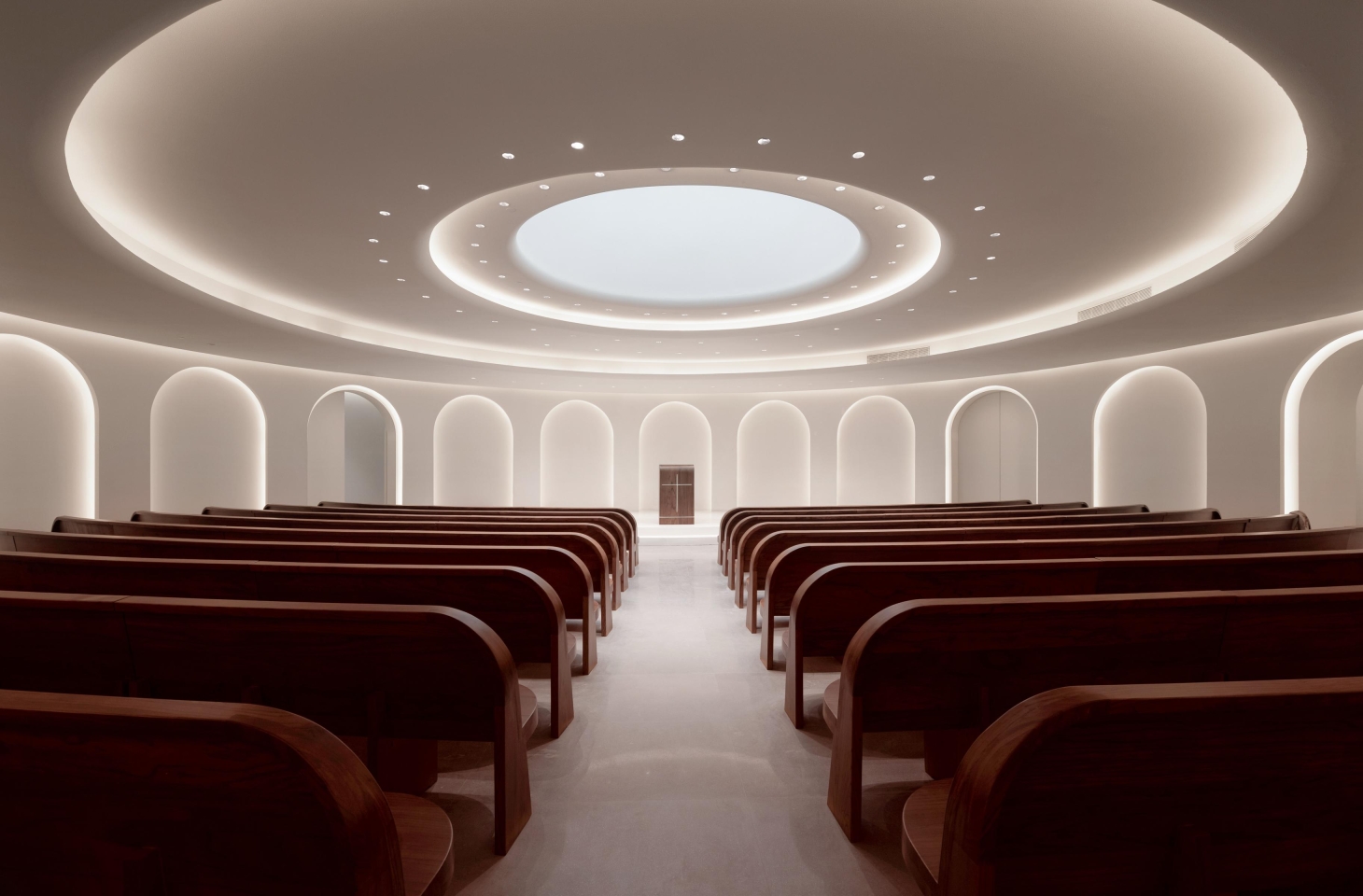 Sustainability ApproachLights are placed on the ceiling of the temple. Combined with the shape of the ceiling, spotlights are densely and sparsely arranged radially from the cross to the outside. The brightness is adjusted from the inside to the outside through the DALI dimming system.