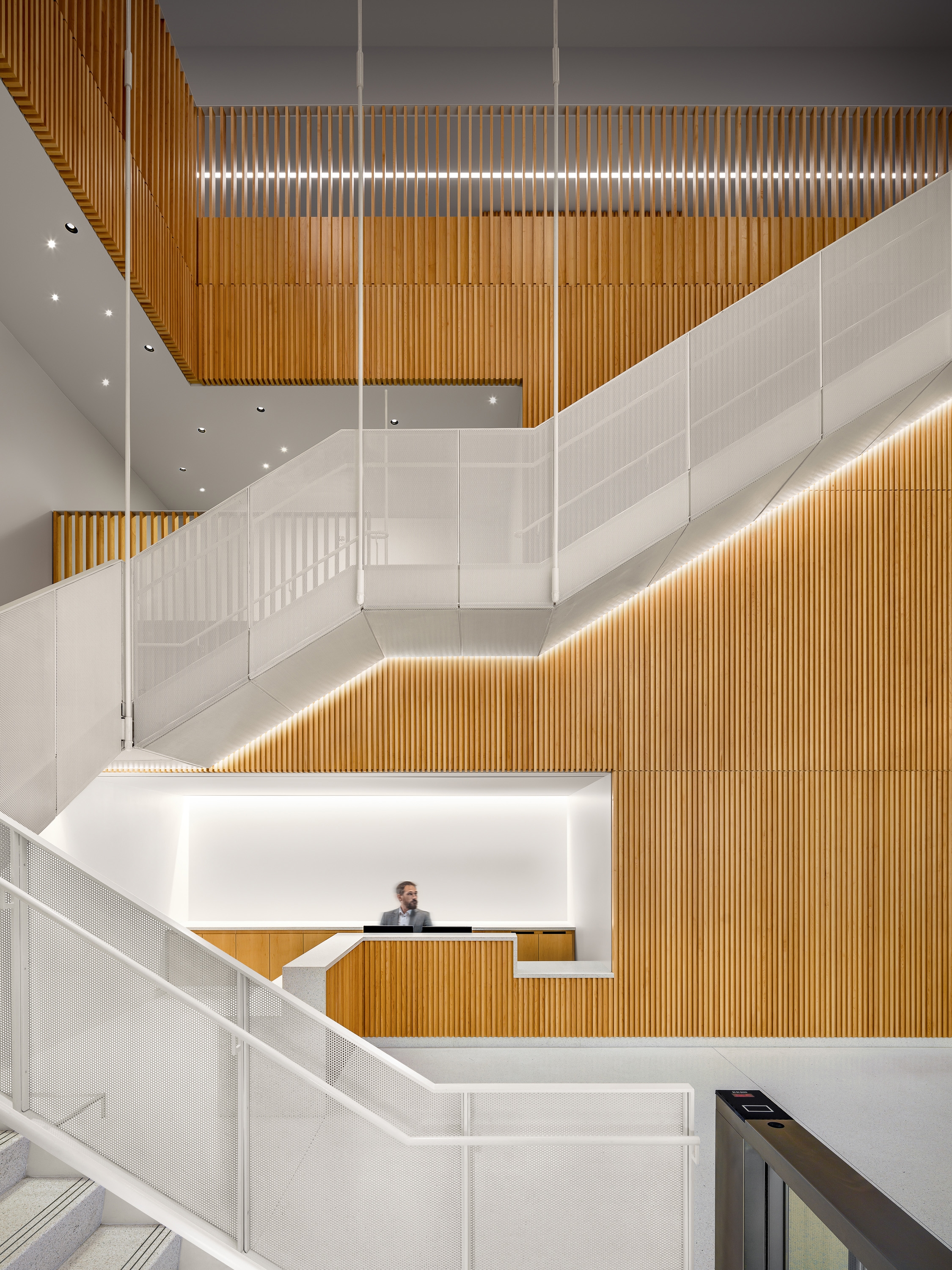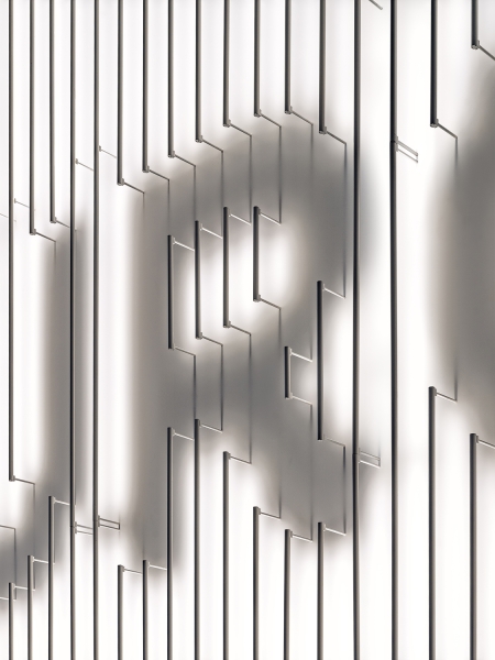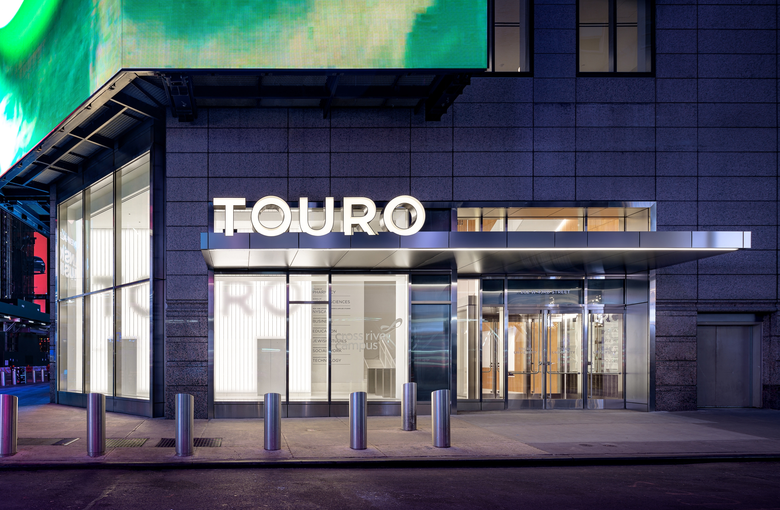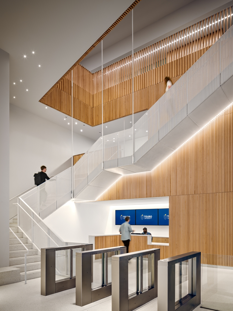 Entry DescriptionTouro University's new eleven-story flagship campus located in the heart of Times Square needed a bold and dignified presence. Inspired by a performance where a soloist danced within a follow spot of shadow on an illuminated stage, Touro's lighting design employs continuous cylindrical ribbons of 3,500K-light to stencil the university’s name in complete shadow on a brightly illuminated 27-foot-tall identity wall. Existing nighttime levels in the immediate area ranged from 200 to 650 lux, far exceeding typical exterior levels of 10 to 50 lux. To compete with the bright, animated LED signs that skin the outside of every building, our strategy brightly illuminates the interior space with 98+ CRI static white LEDs that face a matte-white wall and its reflected light fills the lobby with luminosity. Mockups and modeling confirmed the design concept. Custom stand-offs disappear into the wall while doubling as wireways terminating at remote programmable drivers. Concealed continuous LED wall grazers highlight a three-level maple wood slatted wall. Miniature adjustable LED downlights create a starlight pattern adding sparkle to the rectilinear architecture. By employing a high contrast ratio of light and shadow, Touro stands out in counterpoint to the attention seeking lighting beyond. The campus’s visual identity is a distinctive new lighting feature to the area’s nightscape.