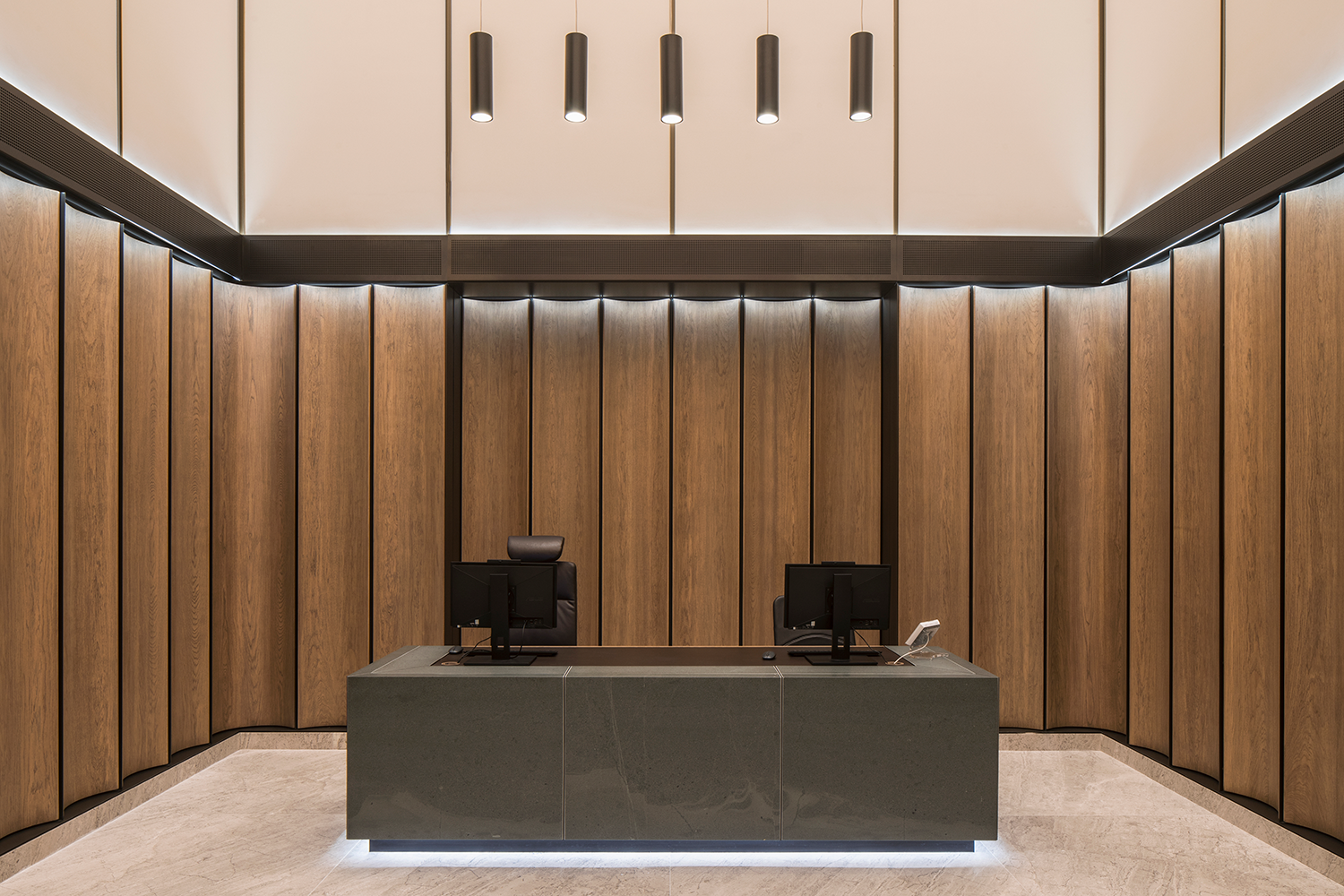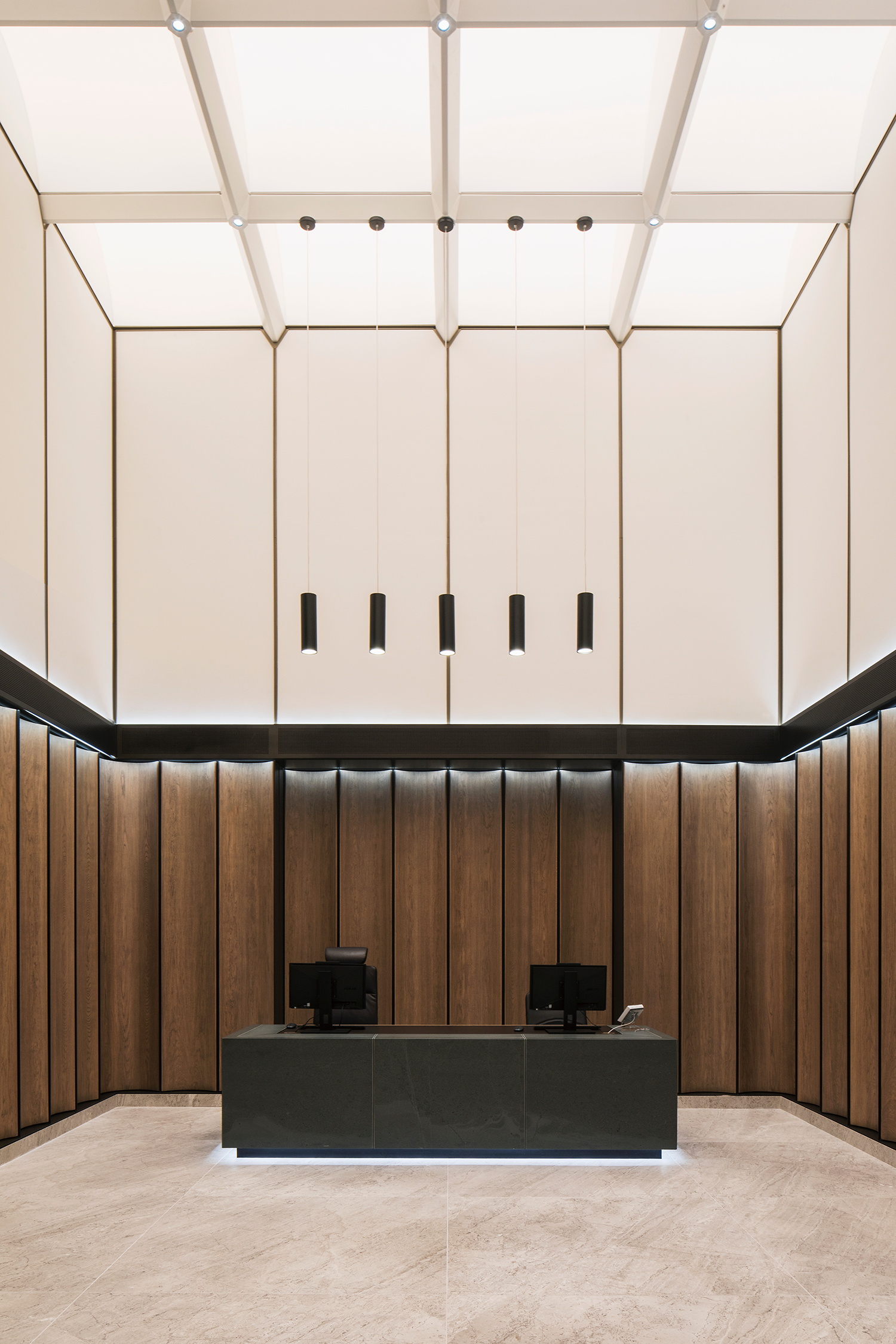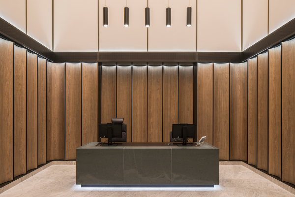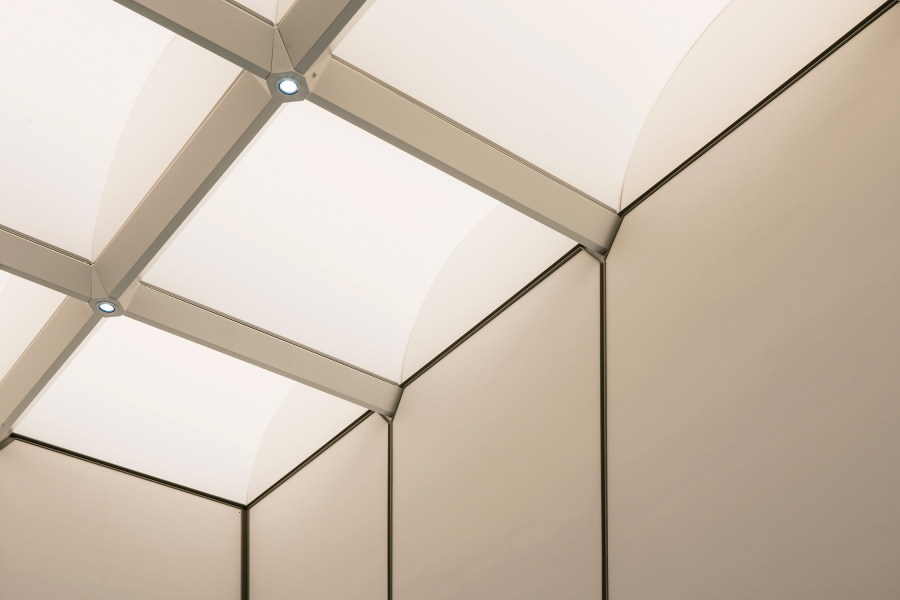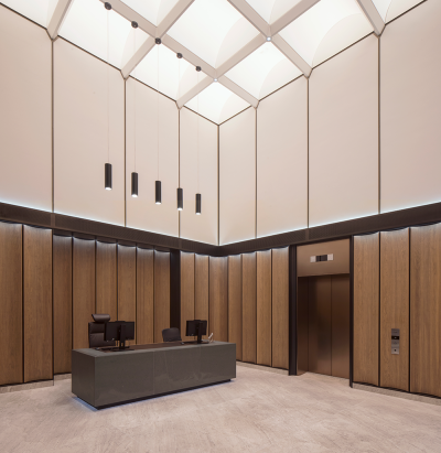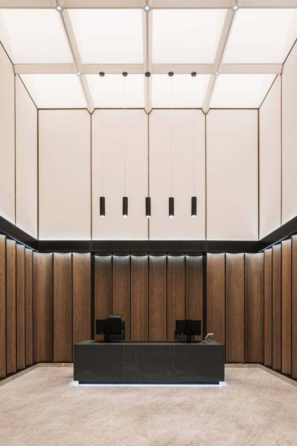 In the double-height reception that follows, the gaze is instantly drawn upwards to a spectacular backlit vaulted ceiling. Seamlessly engineered to appear as one single composition of light, the ceiling features 24 LED modules that work harmoniously and simulate daylight by transitioning through warm and cool colour temperatures. The vaulted soffit is curved due to way that the backlit fabric is deftly tapered across each segment. This subtle yet impactful detail creates a nuanced quality of light, which emulates the effect of daylight.