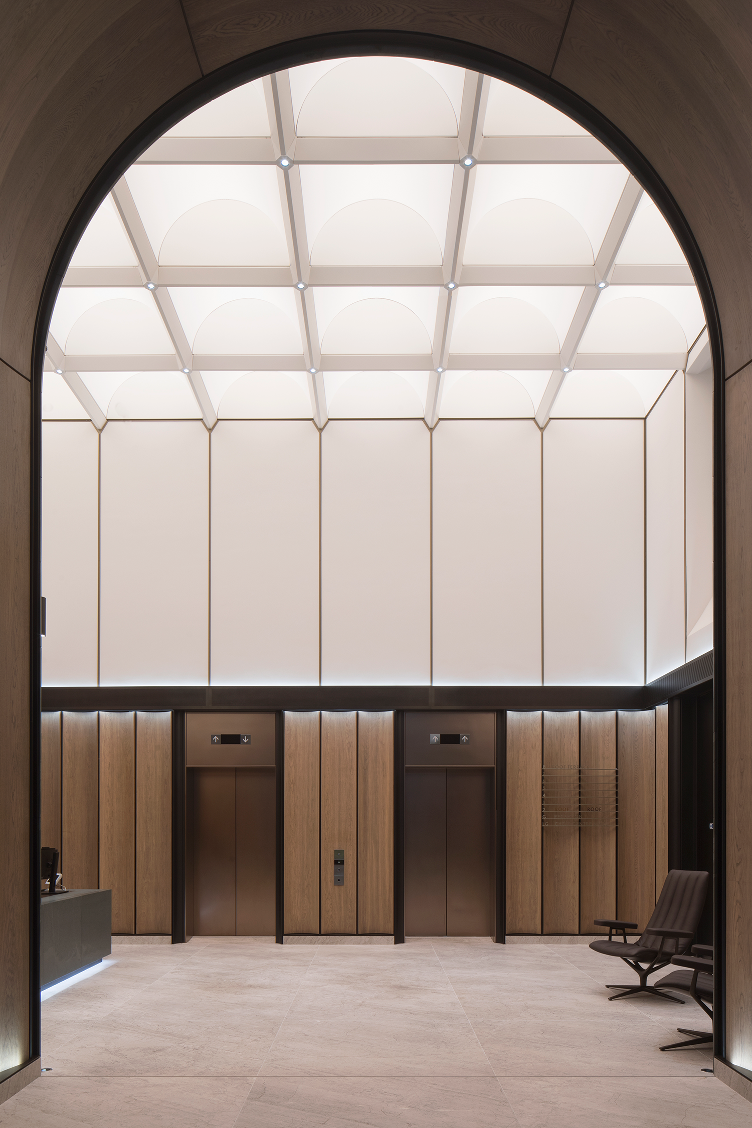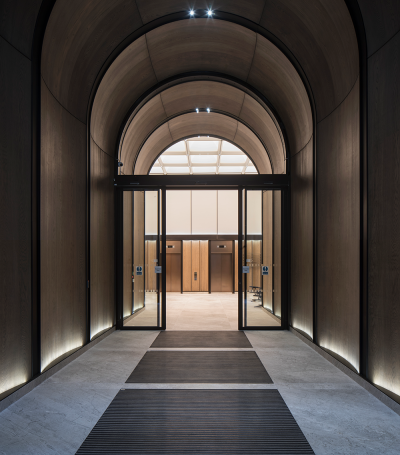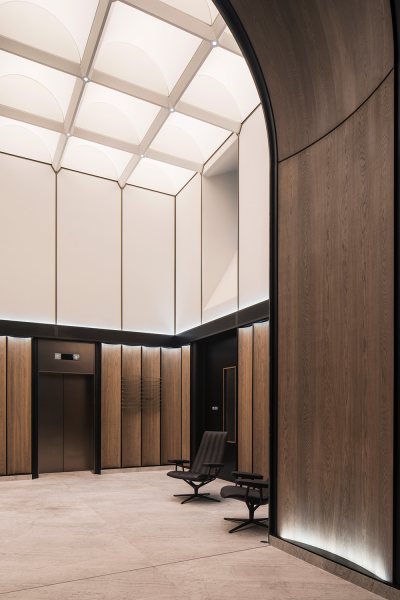 At the entranceway to The Burlian, the development's new high-end workplace proposition, concealed lighting elevates the materials with minimal visual impact. An arch of stone frames the threshold and reveals a walkway of wood panels and bronze-finished archways. Here, spotlights embedded in the arches form a gentle layer of ambient light above, and diffuse lines of light wash the oak panelling at a lower level to highlight the curvature of the wood.