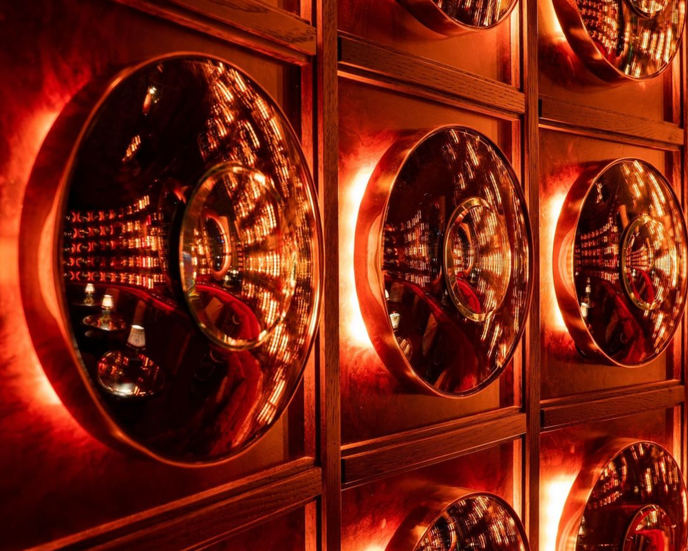 NYX is an intimate and inviting space, rich in detail and texture. From the small brass domed lights on the ceiling to the custom convex mirror light discs on the walls, every element is thoughtfully designed. The dynamic lighting control system sets the perfect mood, overcoming the spatial and lighting challenges to fully embody the spirit of the goddess of the night.