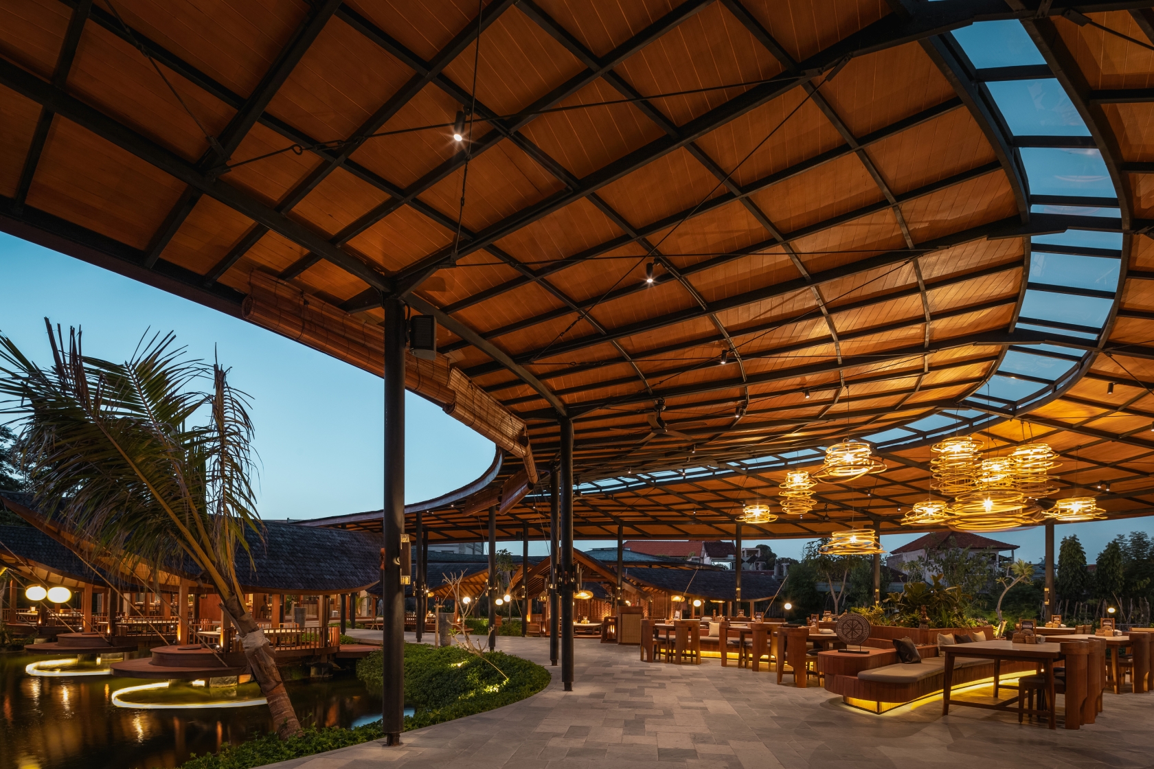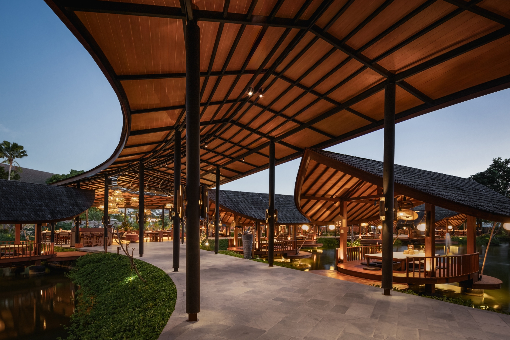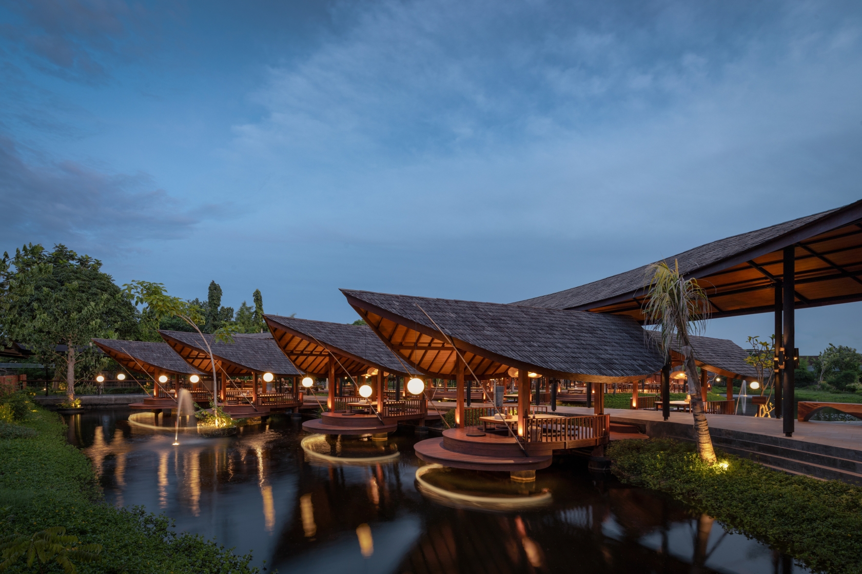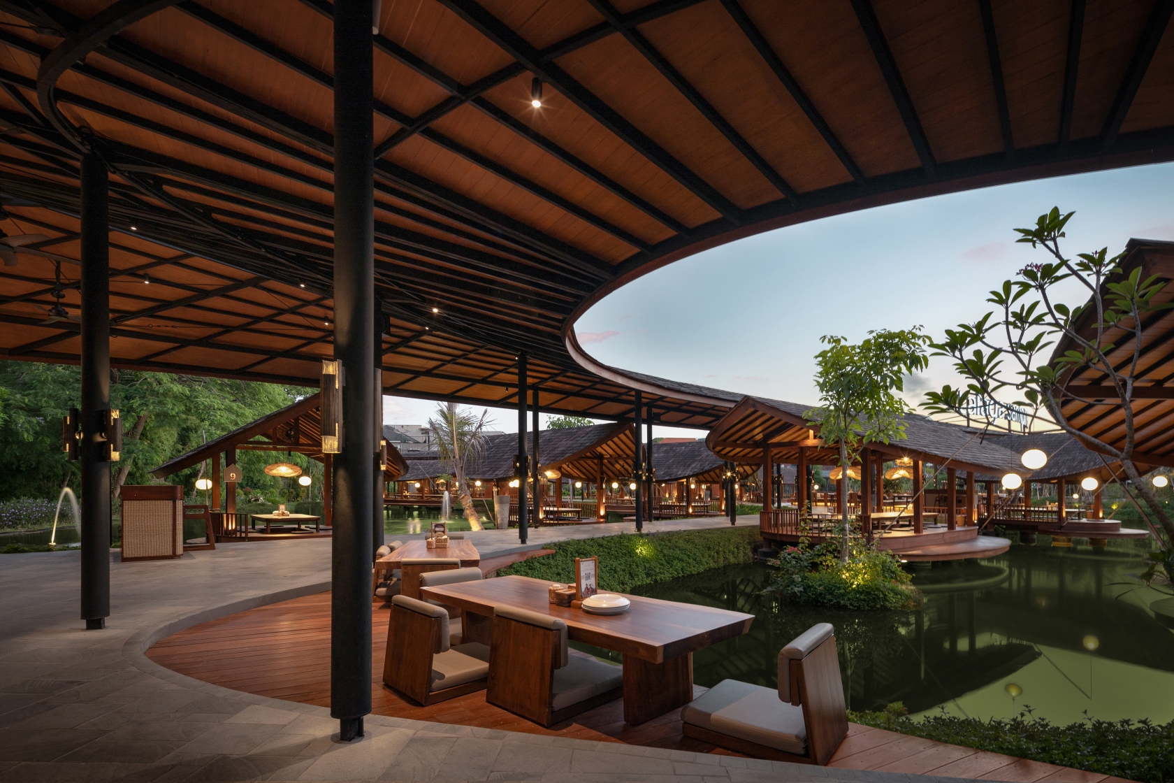 Along this "river," spacious dining areas rest on its bends with open-air Saung nestled along its path—reminiscent of traditional riverside settlements. This novel design approach provides the main dining areas with direct access to the water's edge, allowing guests to feed fish and bask in the tranquil waterscape. Each Saung Hut has its own moonlight ball from resin and indirect neon flex light with IP67 to provide the reflected and floated feeling above the lake.