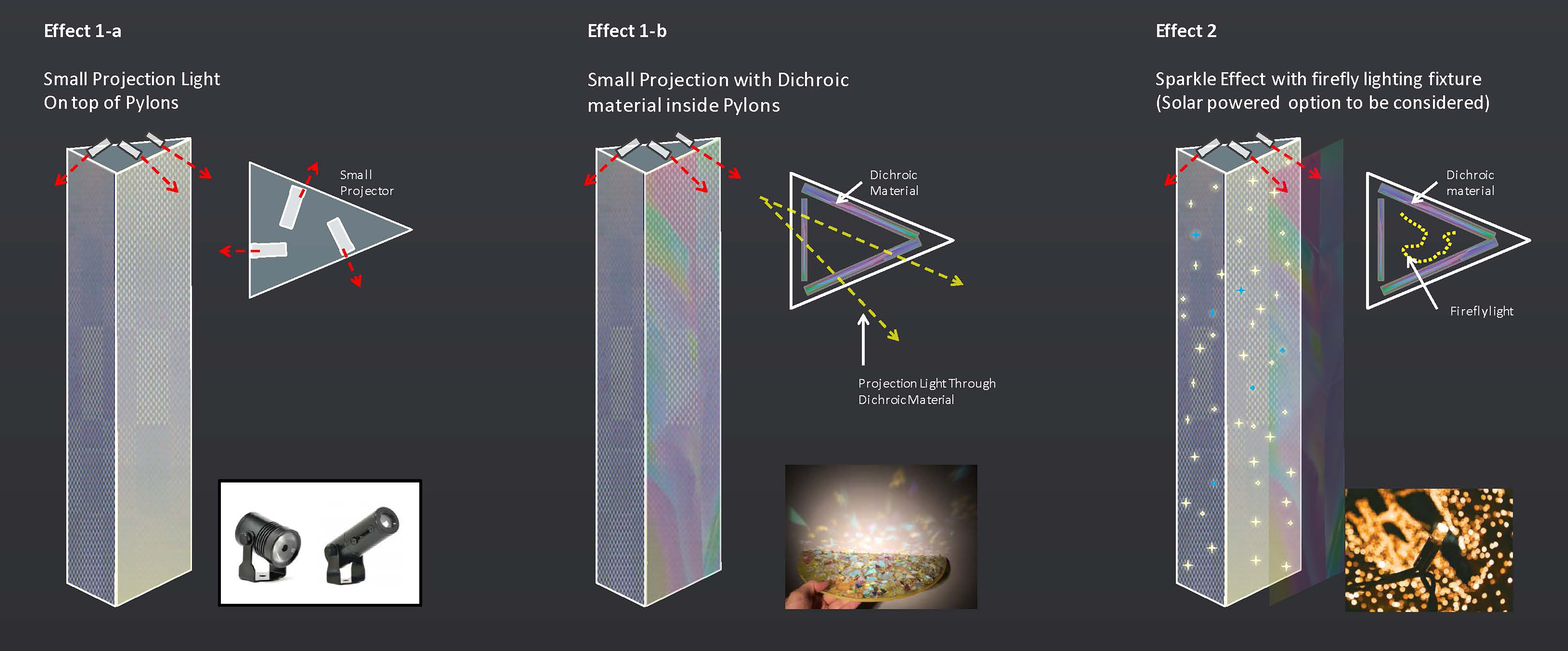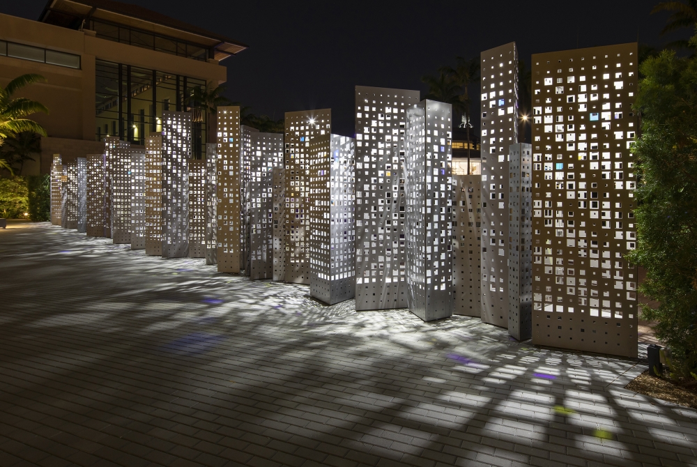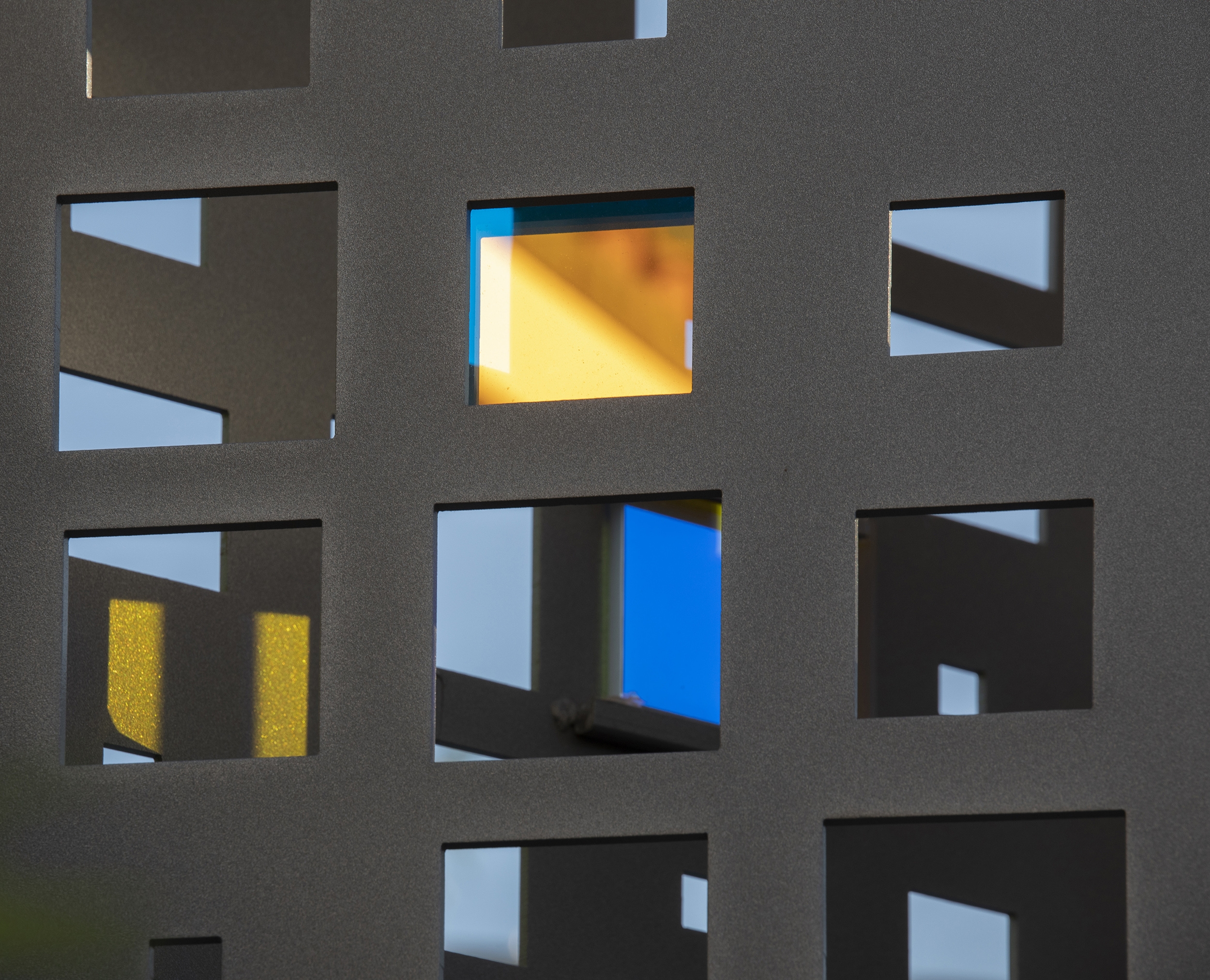 The lighting design team worked closely with the artist to develop the sculptural screen element, referencing studies of local sun cycles to determine the material, size of the openings, pattern, and placement of dichroic glass to produce the desired effect during the daytime: a dynamic display of shadows and subtle dichroic colors that celebrate the path of the sun and the seasonal changes from equinox to solstice.