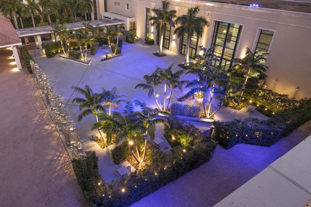 The architectural lighting of the courtyard is emitted by overhead-mounted, shielded color-changing luminaires. A dynamic lighting control system provides the flexibility to transform the space from a tranquil setting to a vibrant themed environment depending on the program, occupancy, timeclock, and curfew, with each luminaire zoned individually for lower energy consumption.