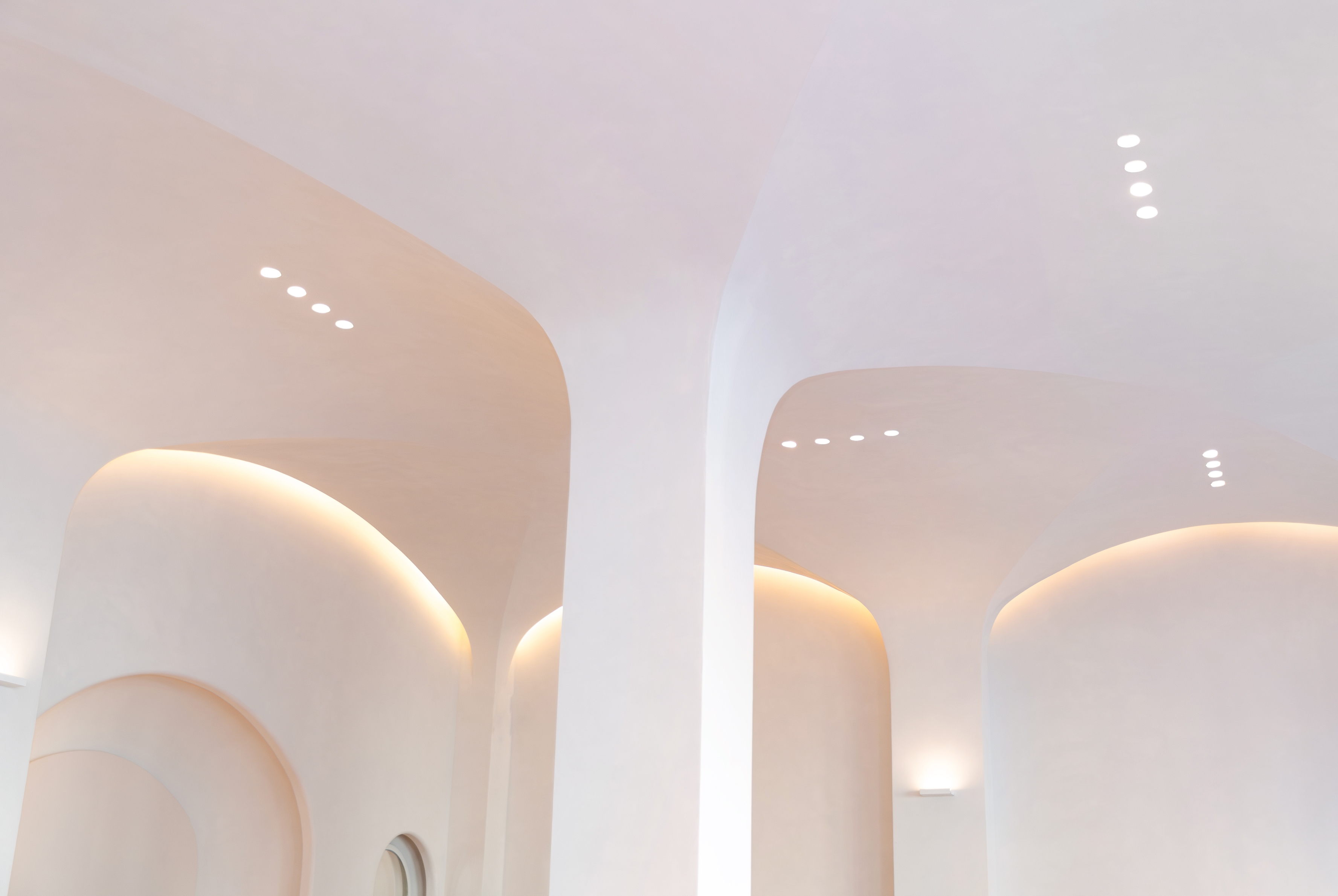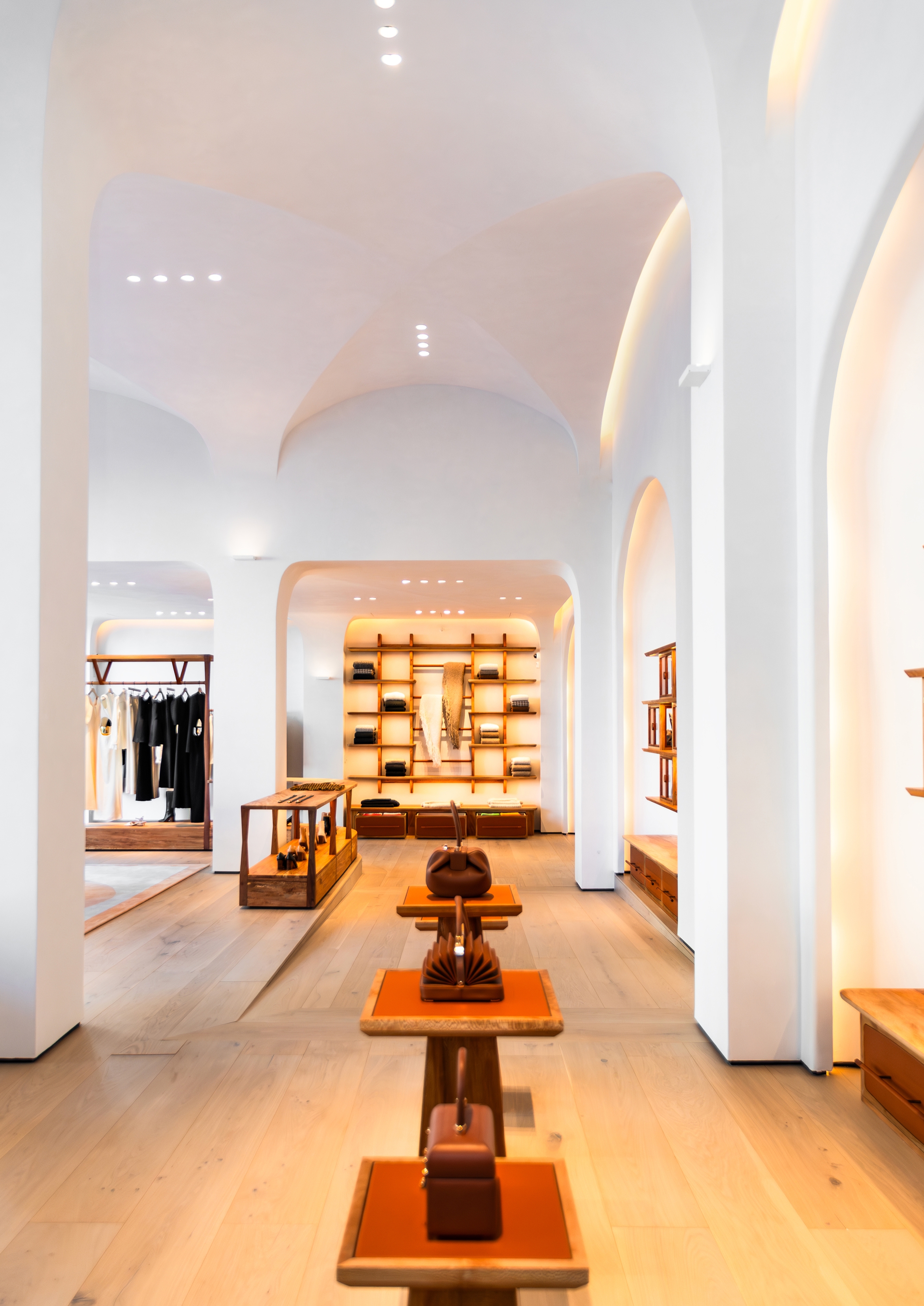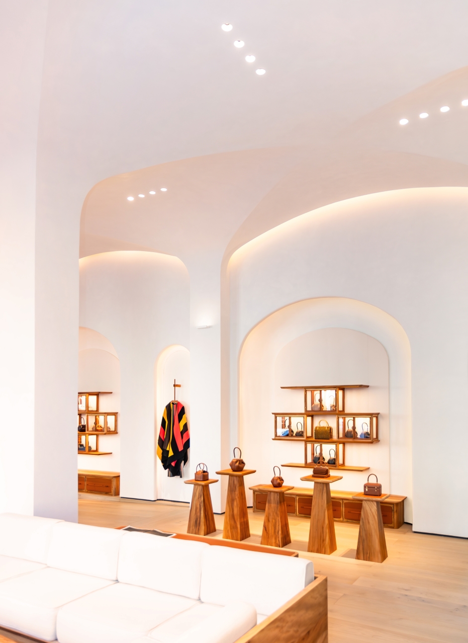 The boutique's vaulted architecture is softly uplighted via wall-mounted architectural sconces. An architectural slit at the ceiling/wall transition houses HVAC and lighting, providing soft illumination that delineates the architectural curves. Monopoints on extended stems drop below the architectural slits and provide accent illumination onto merchandise near the storefront. Trimless recessed lighting arranged in quadruplets follow the flat portions of the quadripartite vaulted ceiling and highlight merchandise within the main spaces and perimeter walls.