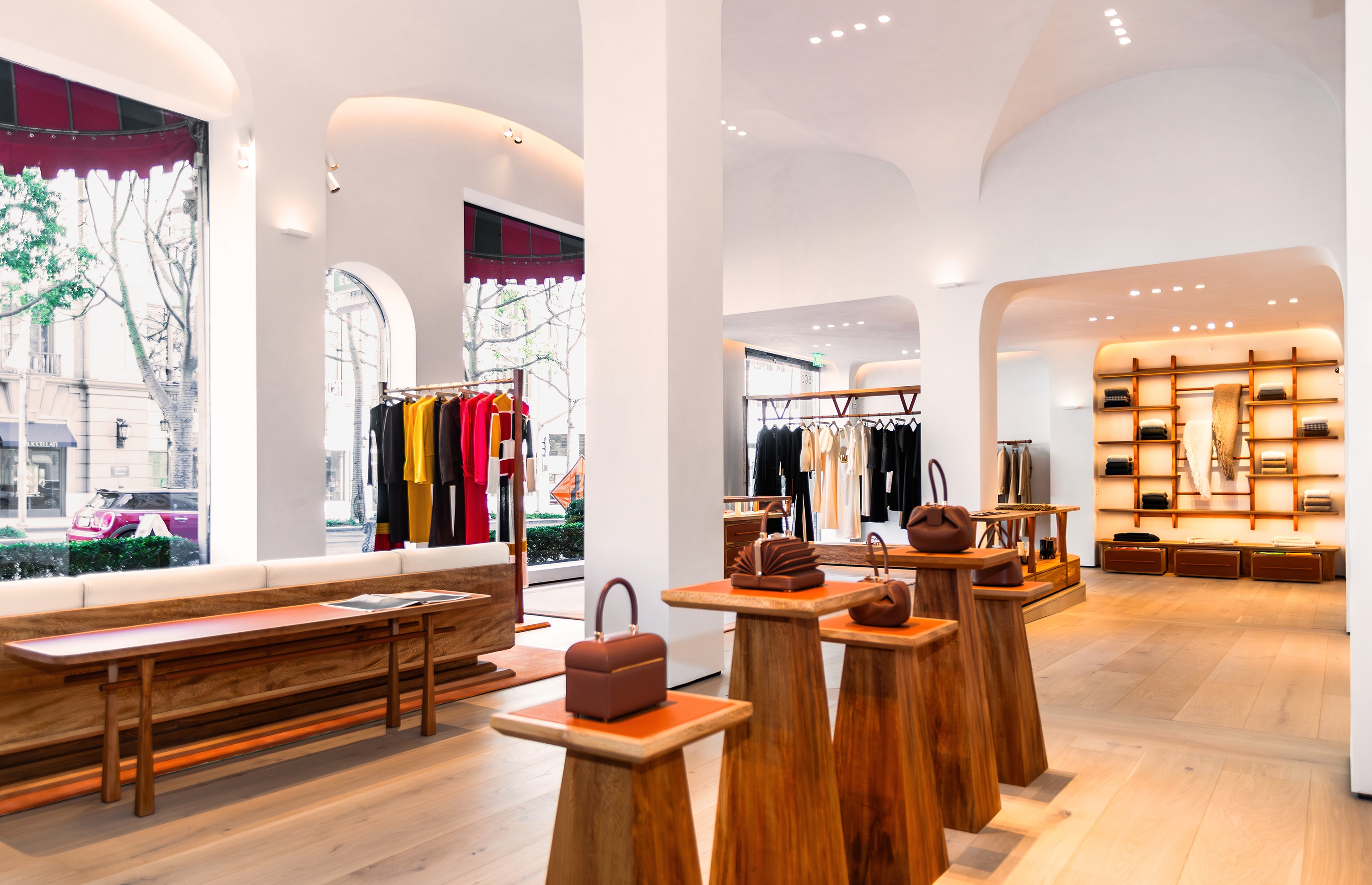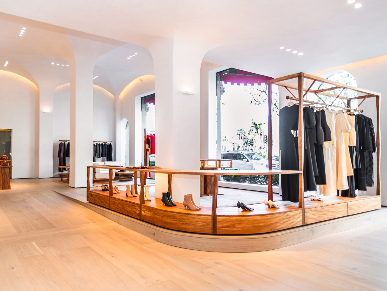 Architectural lighting presents an appealing canvas upon which the boutique's fashion is highlighted, inviting guests to experience the brand's unique product.