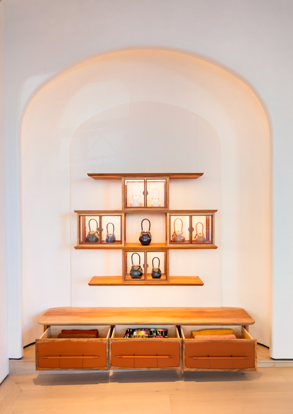 Casework lighting provides efficient supplemental display illumination, while focal millwork pieces along the primary viewing walls incorporate luminous panels to softly highlight key merchandise. LED sources were utilized for all project lighting, specified in 2700K and 90+CRI for excellent color rendering while creating an inviting, residential feel that compliments the warmth of the custom millwork elements.