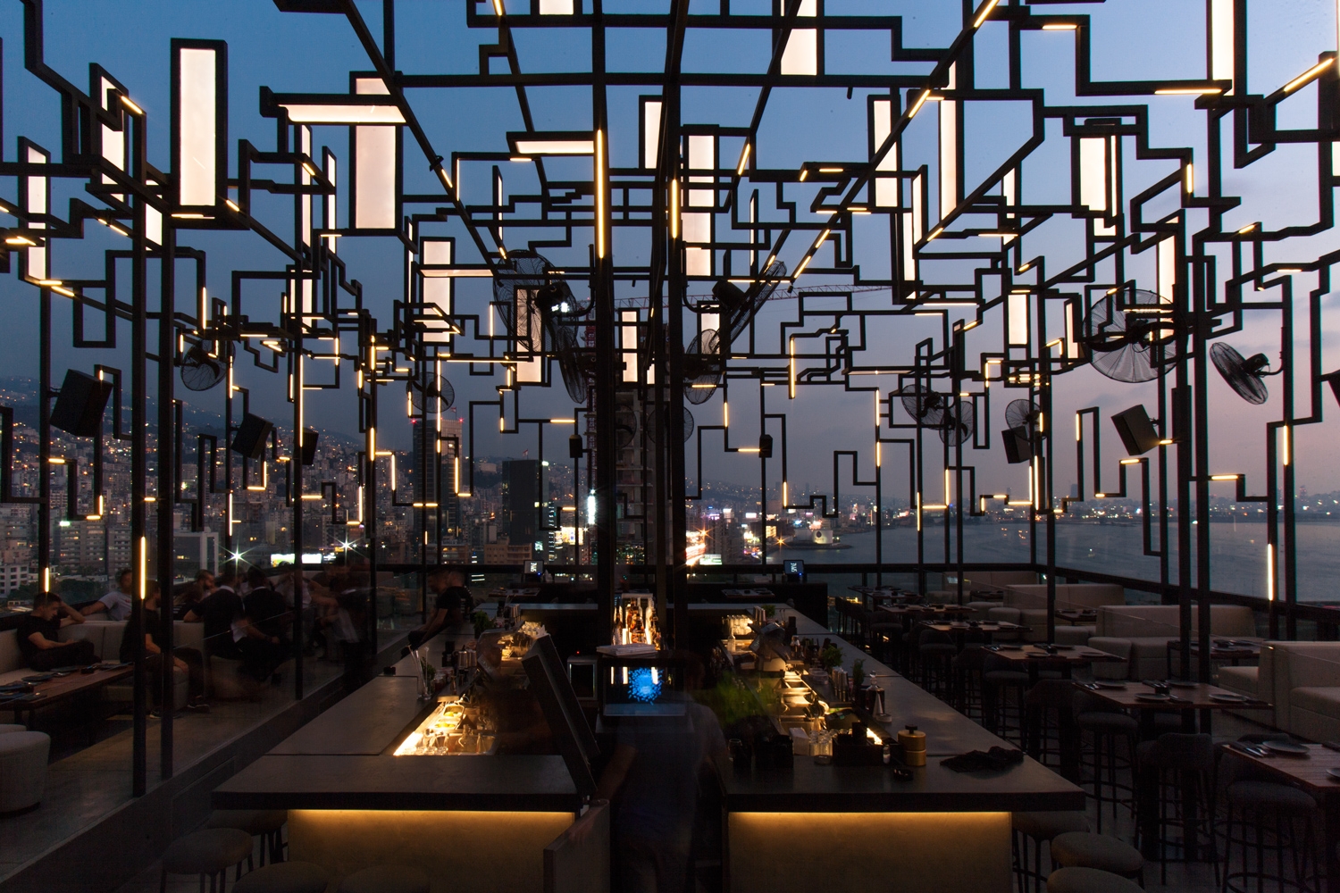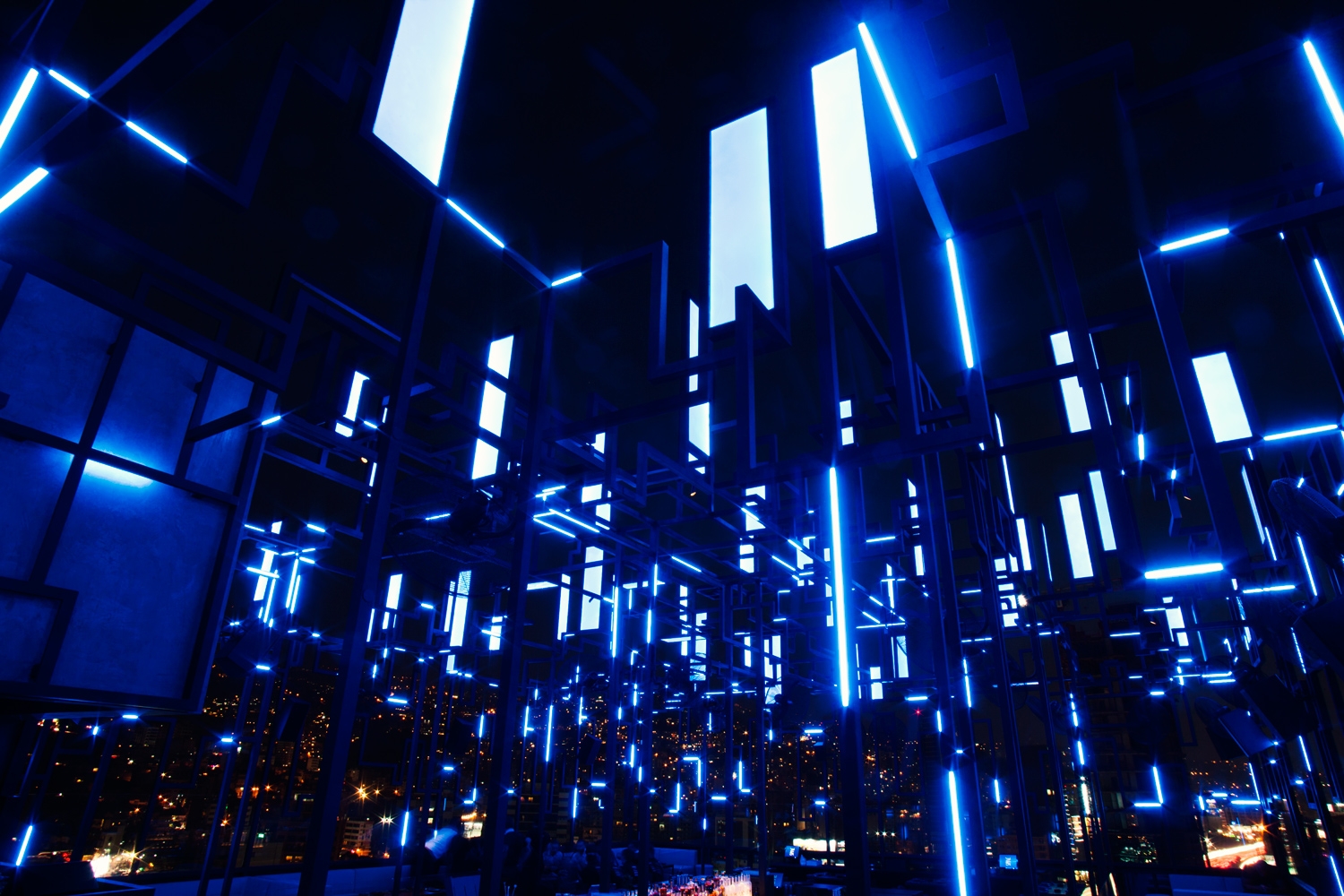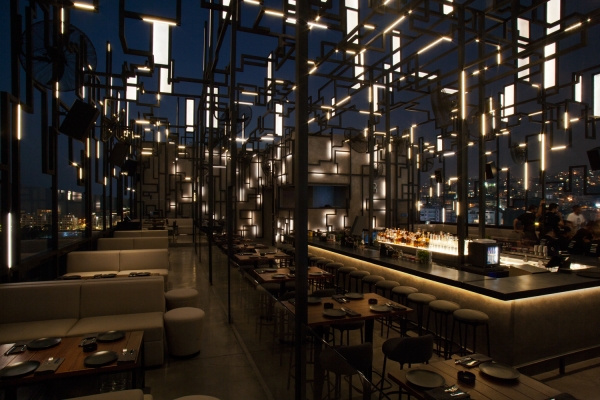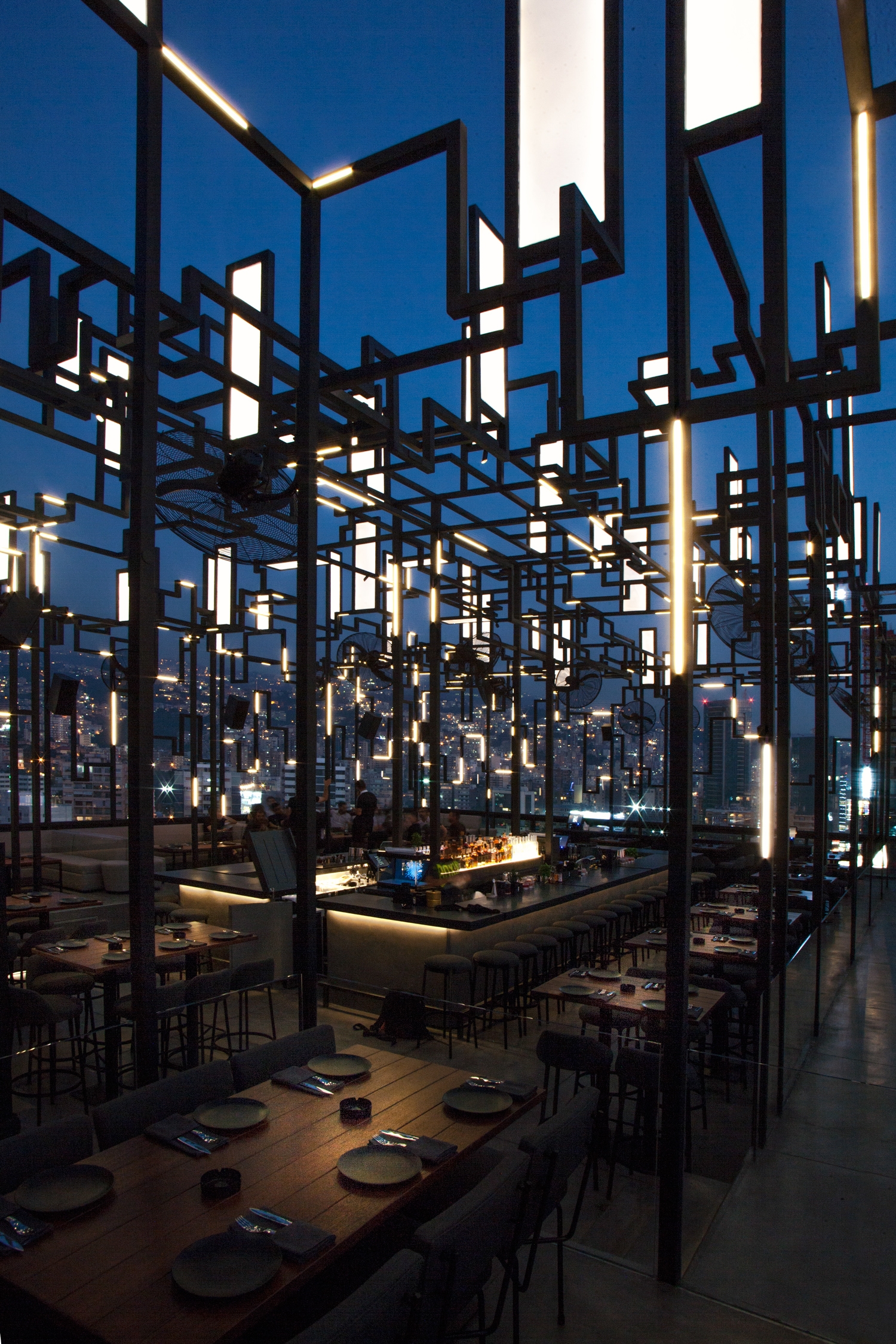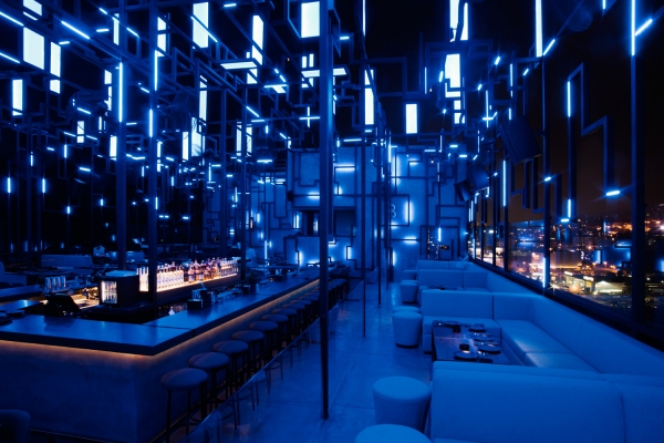 Spine sits on a rooftop amidst floating lights that zigzag and seesaw on a steel structure. Translucent panels sit upright or flat on top of the steel creating a distinctive silhouette amid the city. The concept behind Gatserelia Design was to create a skyline of a city starting from a chaotic structure which carries skyline elements and integrates hidden lights. Methacrylate panels were used to create a surface to illuminate and animate said skyline. Strips of light (RGBW-12W/m-341lm/W-pitch 1cm) are flushed with the surface of the steel, special DMX components allowing the control over every 10cm of the strips individually allowing a complete animation similar to pixilation. The towering panels pop up when lit and dissolve when turned off. 6000-address lights are controlled via DMX computer that controls every pixel individually using video animation. This light show can be synched manually or automatically so as the music shifts, lights shift along with to induce chromesthesia in this sci-fi city. The general lighting is also supported by small, well-shielded lights that accentuate tables and the central bar. All lights are positioned as so not to light toward the night sky.