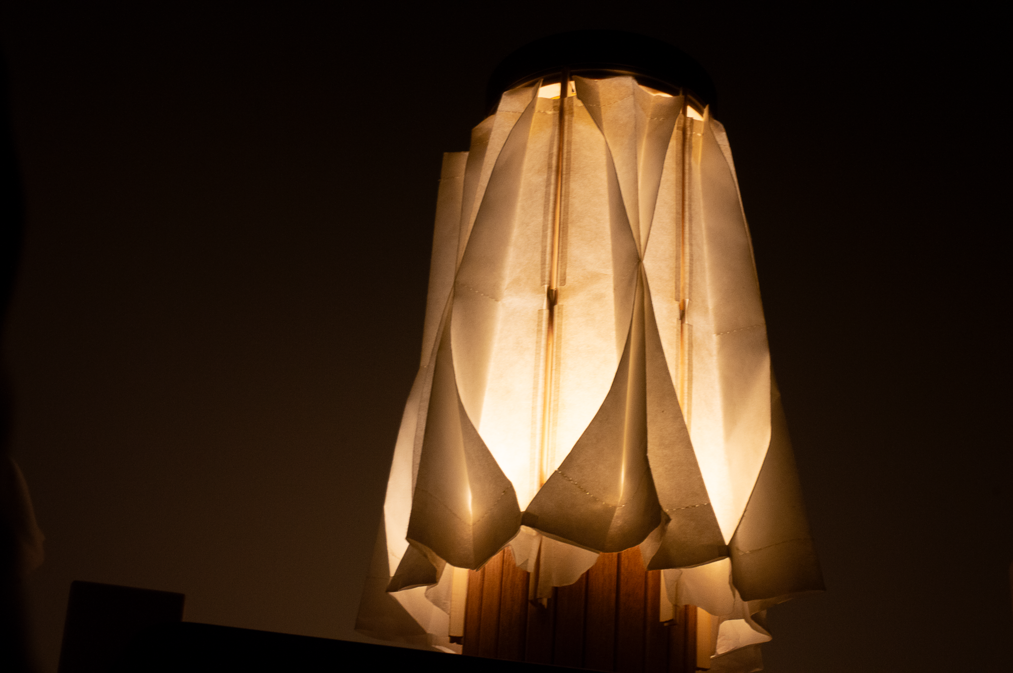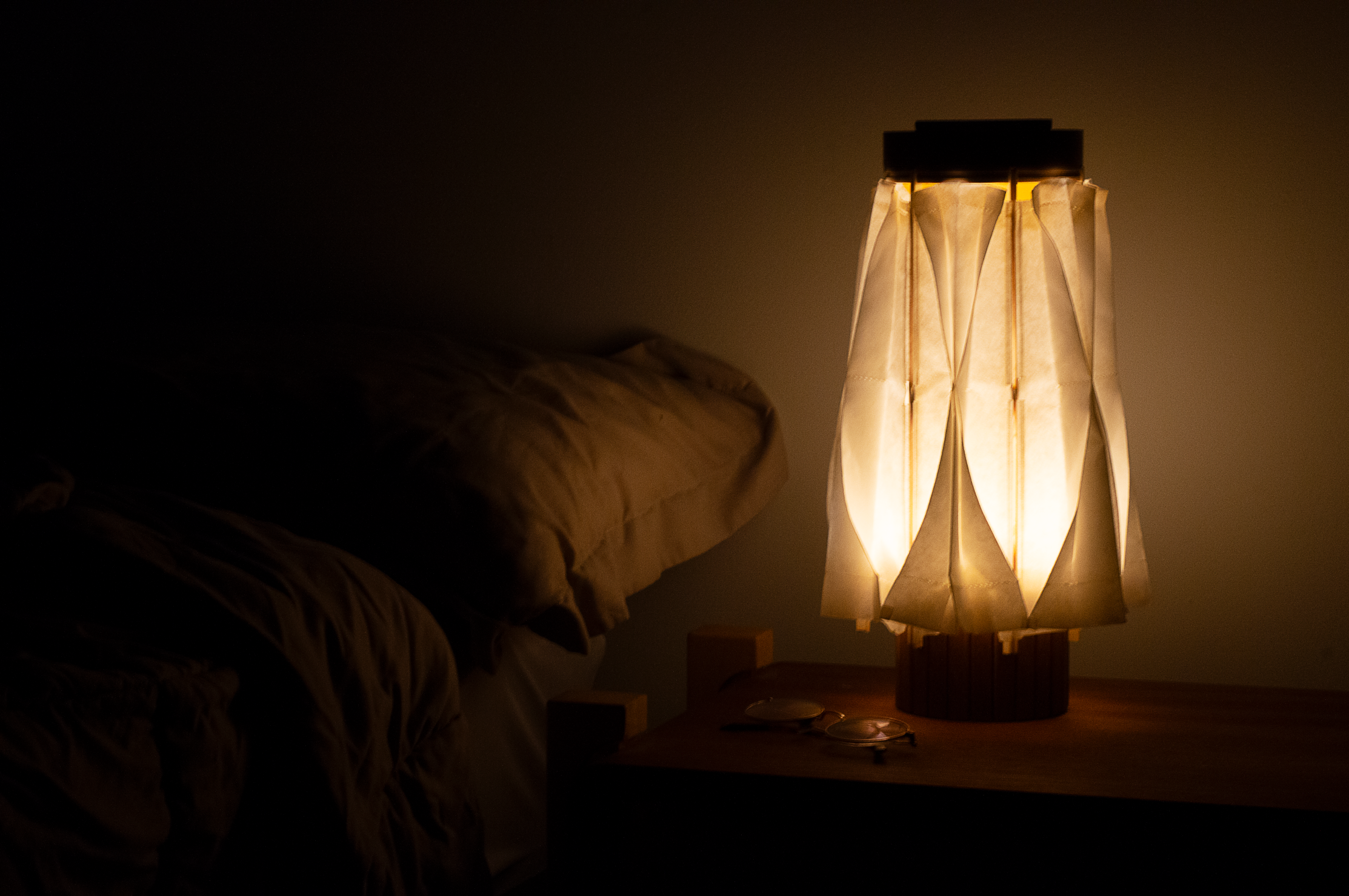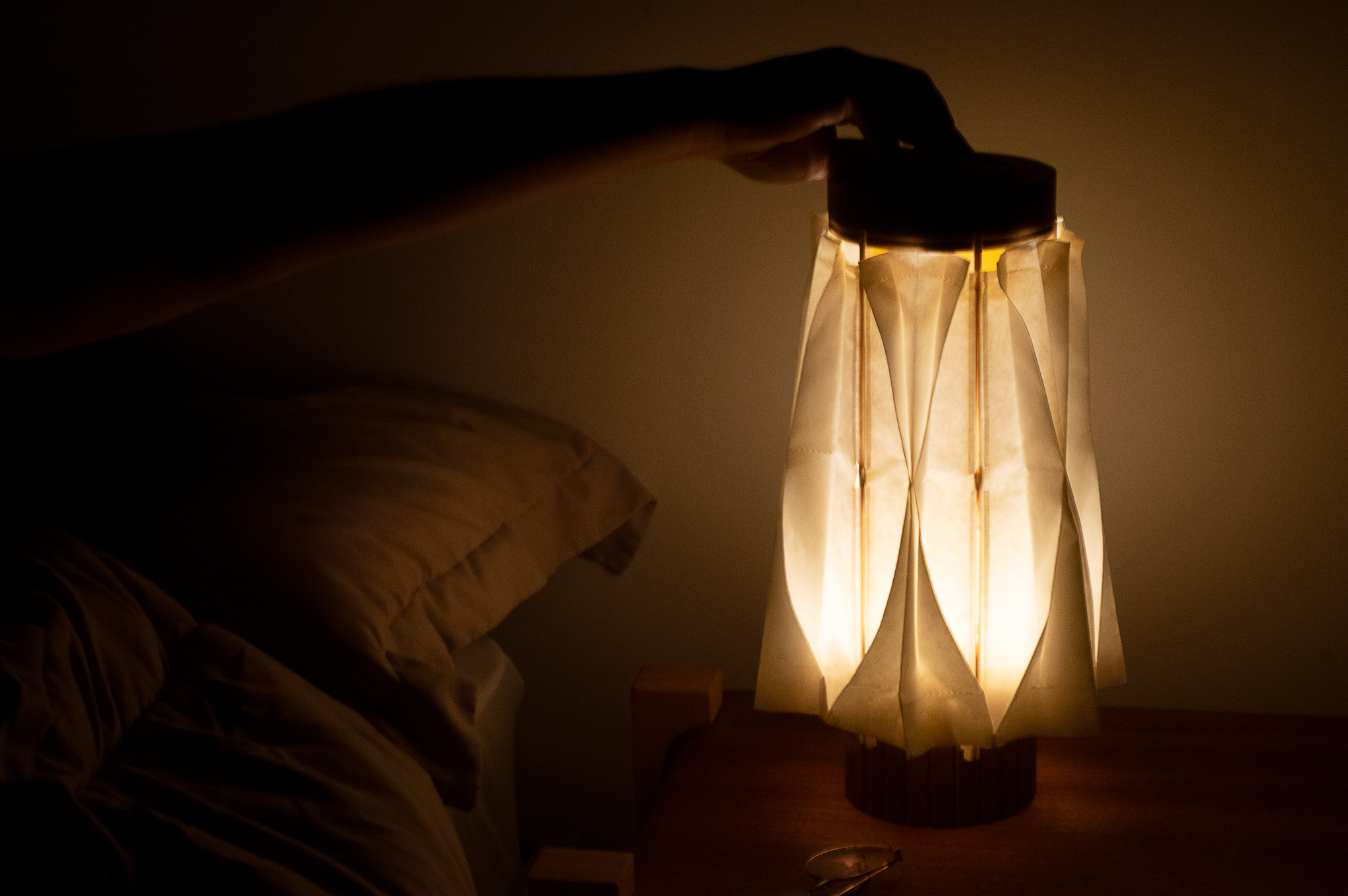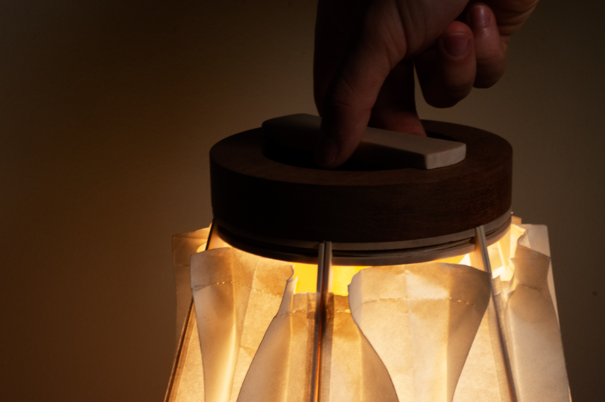 Sustainability ApproachSustainability was a major influence in material selection. Washi paper, used to create the light shade, is a natural and biodegradable yet durable material. The main structure of Hikari is to be made entirely from wood, including both the interior housing and its decorative outer slats. The moving mechanism within the light works without machine parts, instead, it functions from a cotton thread that loops through each bamboo slat of the shade.