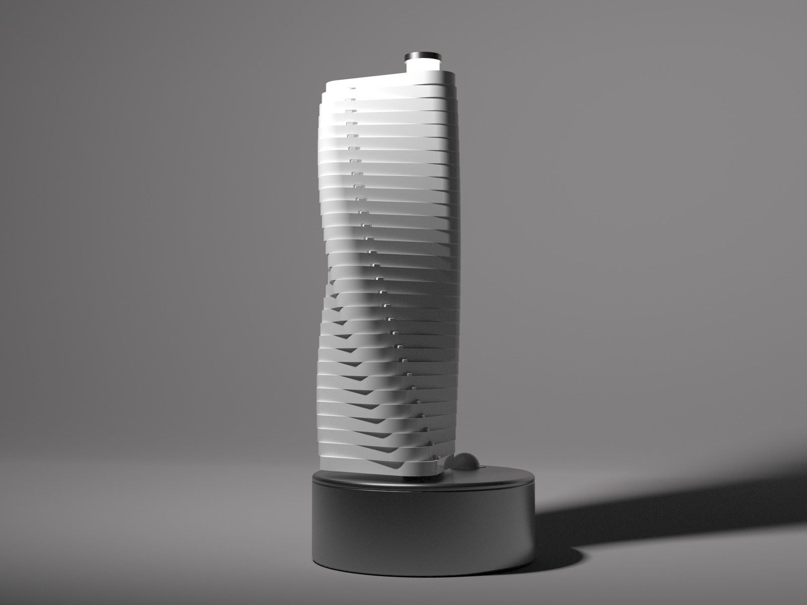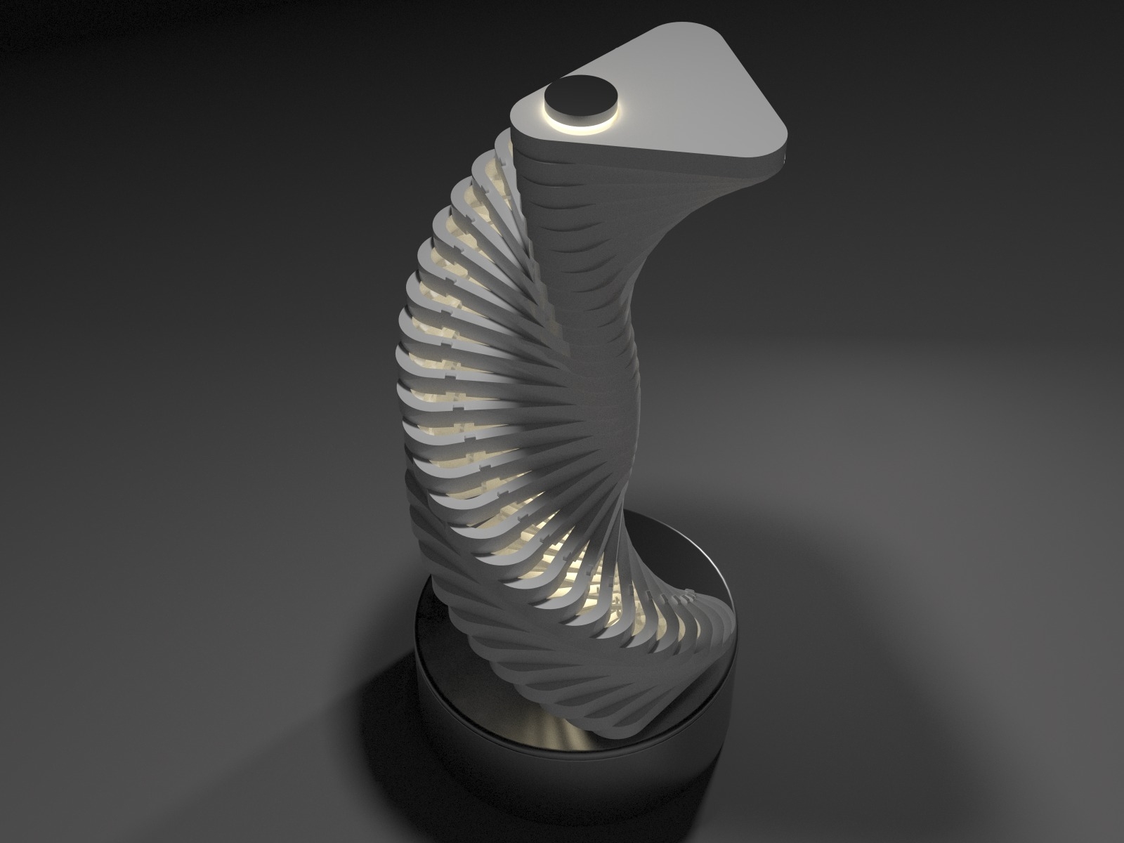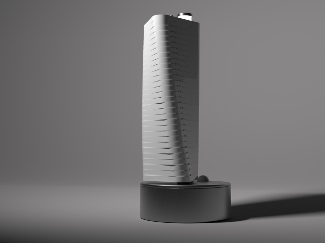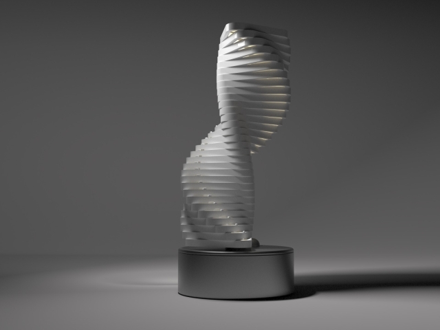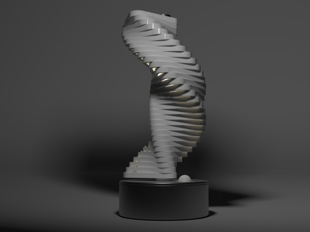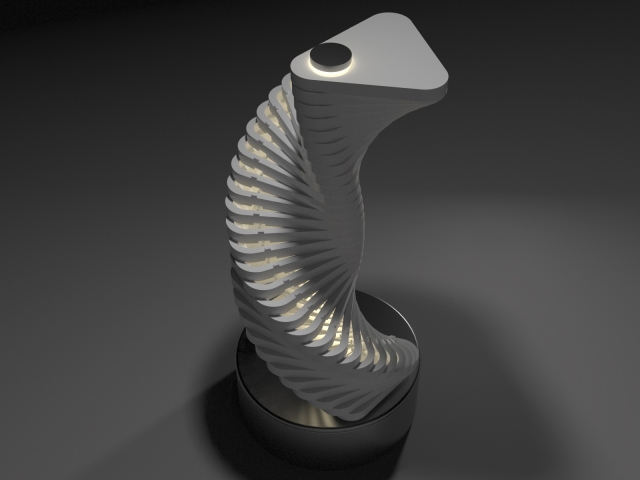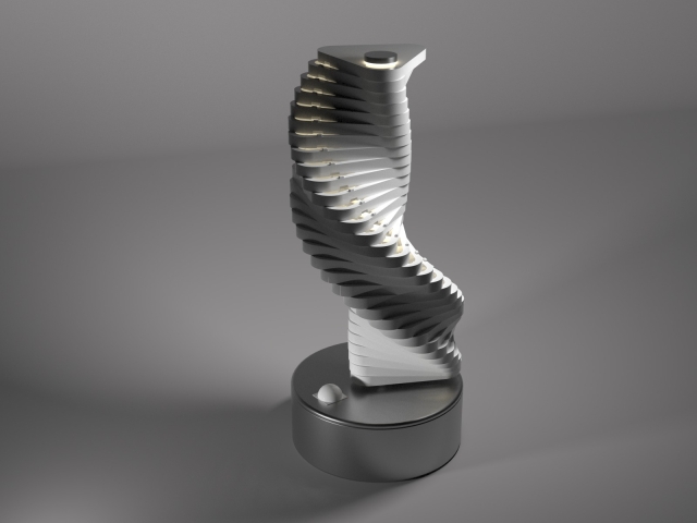 Entry DescriptionZenith’s design is a sophisticated fusion of form, movement, and light. It features 31 triangular elements, each precisely shaped and aligned, stacked vertically along a central axis. This axis, composed of a sleek acrylic tube, serves as both the structural core and a housing for warm white lighting. The minimalistic geometric structure of the triangular components creates a striking visual appeal, blending sharp angles with dynamic motion.