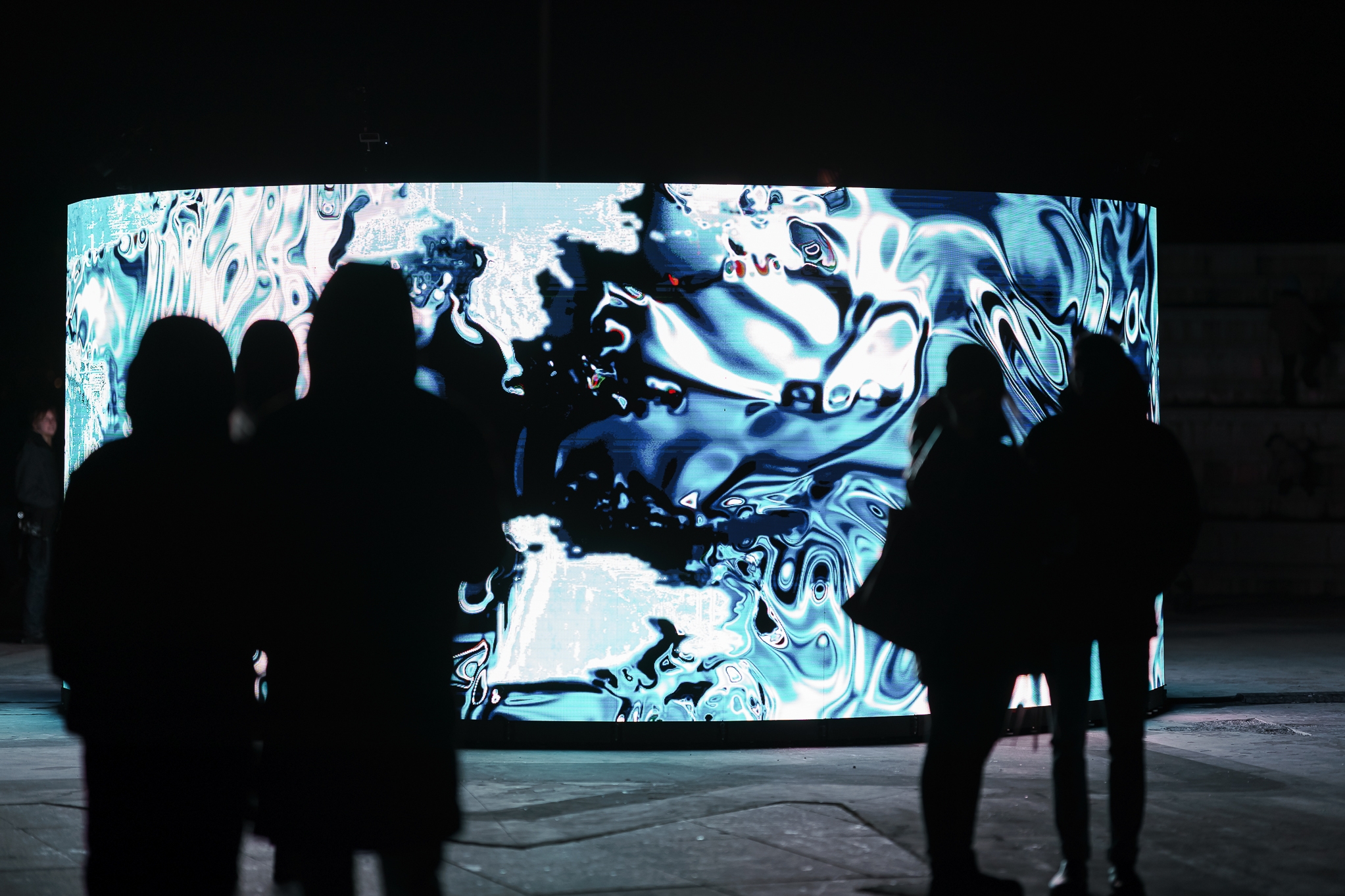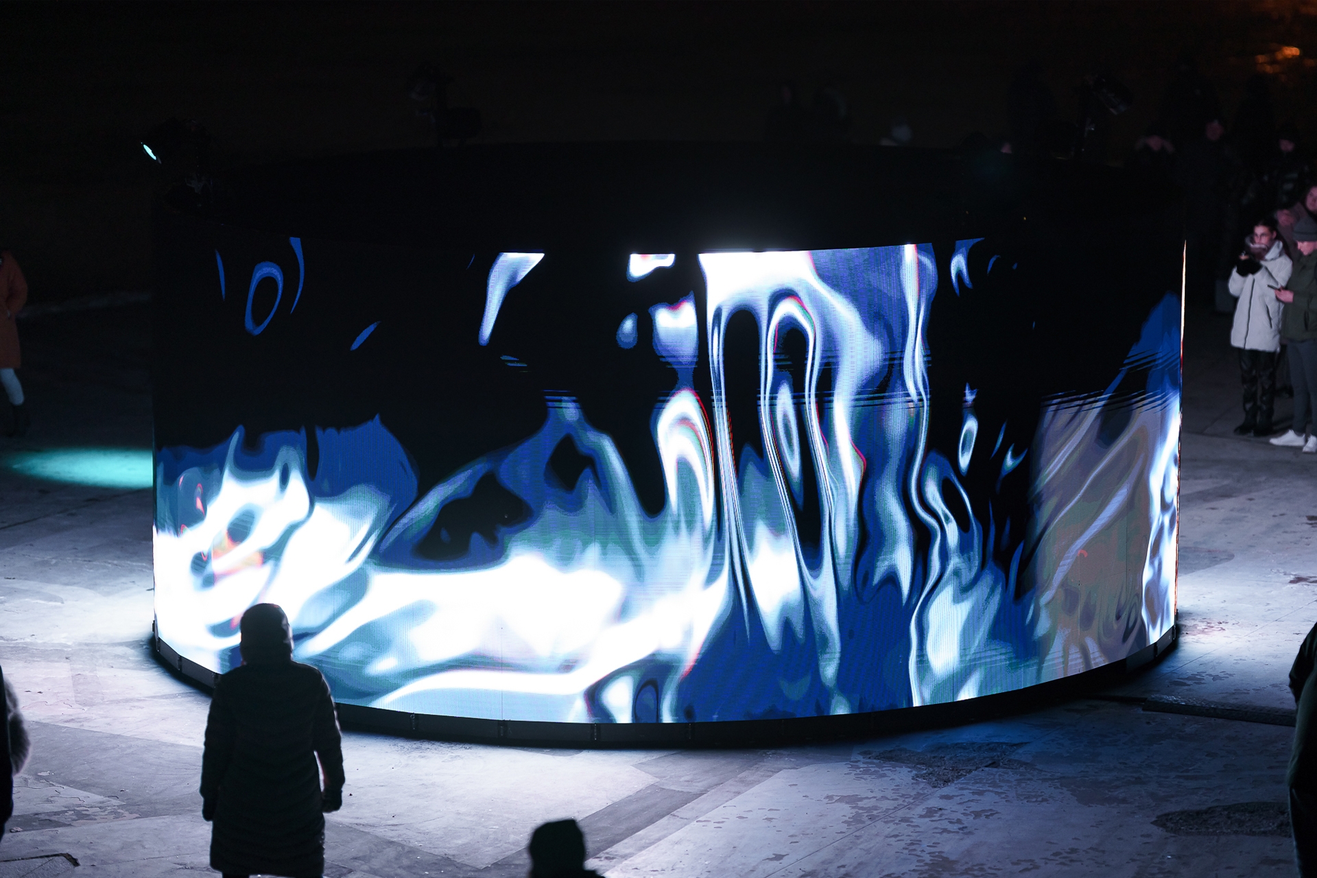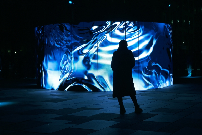 Entry DescriptionPOINT OF (NO) RETURN is an evocative interactive installation that immerses the audience in a visually striking experience—one that is shaped by their presence. As viewers step into the spotlight in front of the circular installation, luminous ice melts into flowing water. When they step back, the ice freezes again. The longer they engage with the mesmerizing visuals, the more the water’s flow spirals out of control, eventually turning into a dark storm - approaching the point of no return.