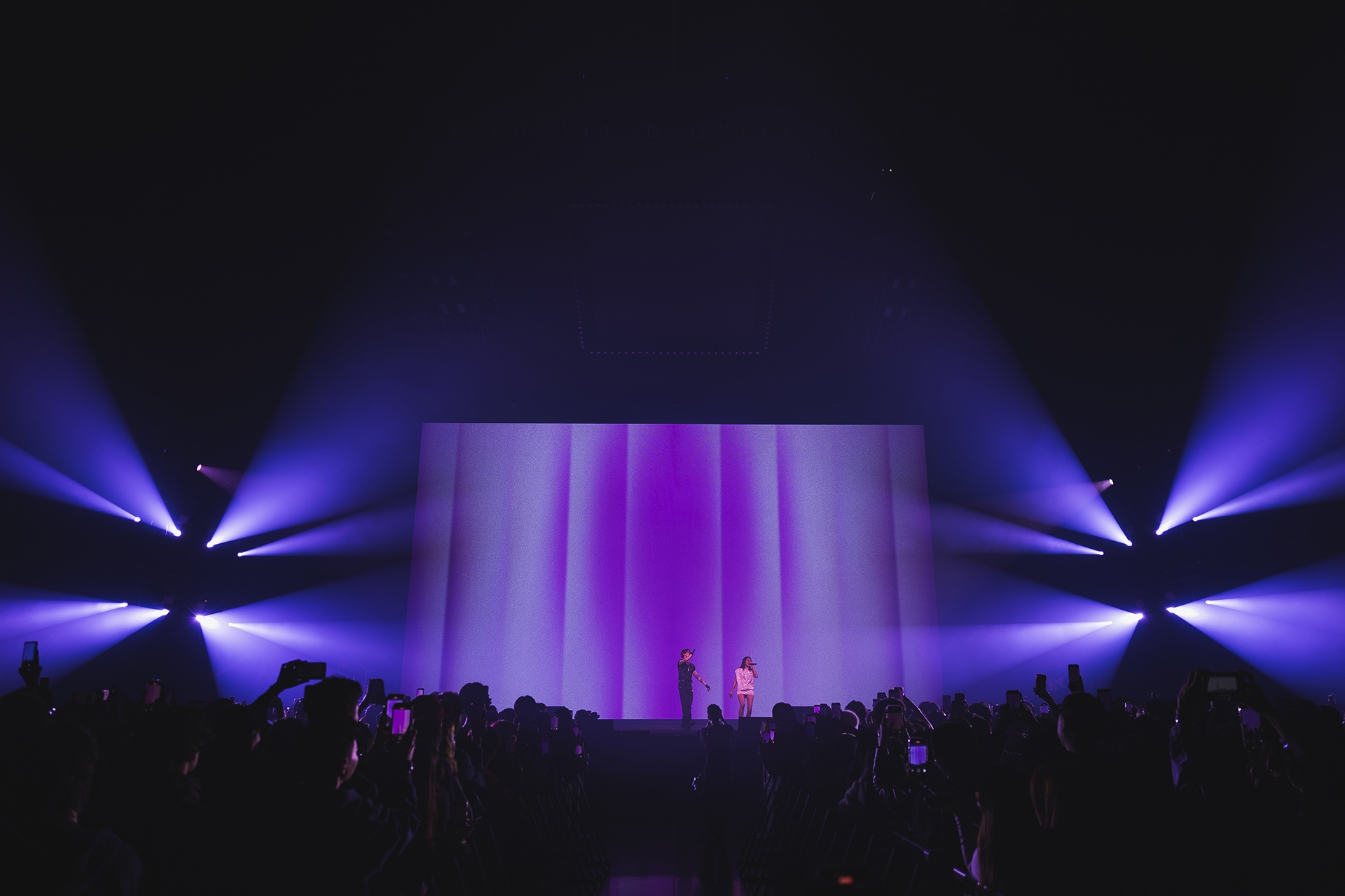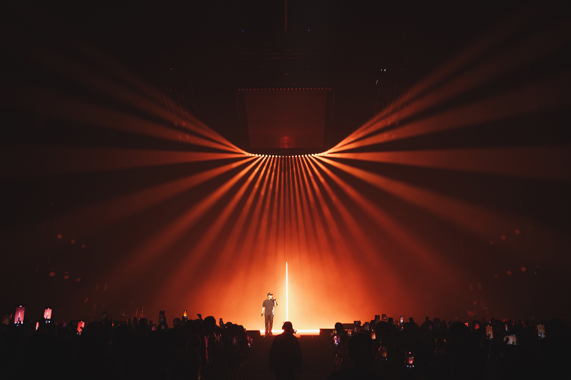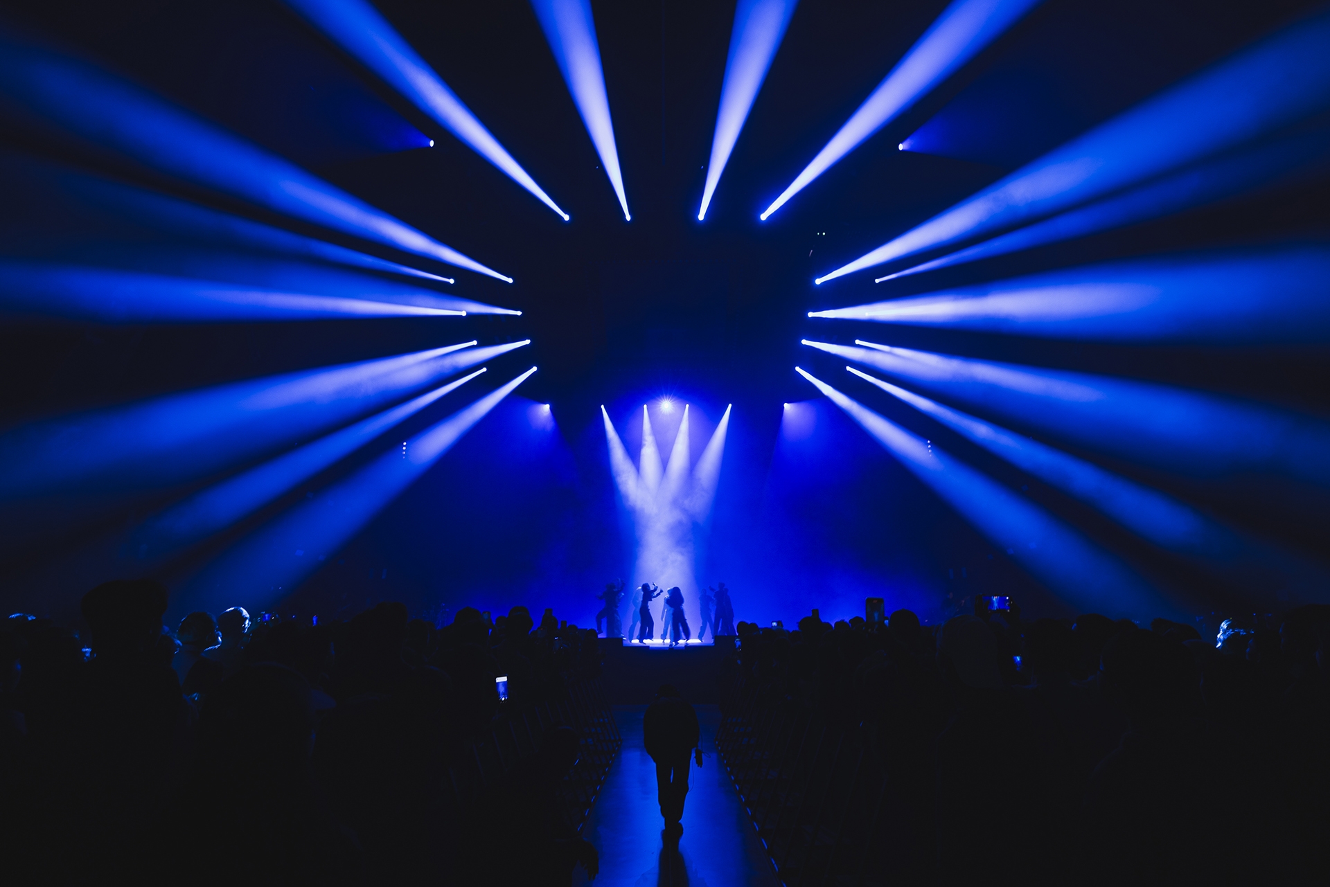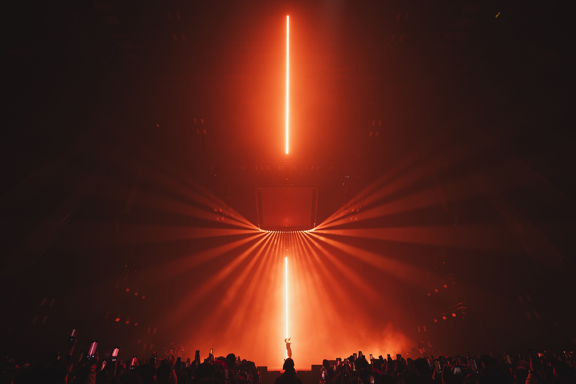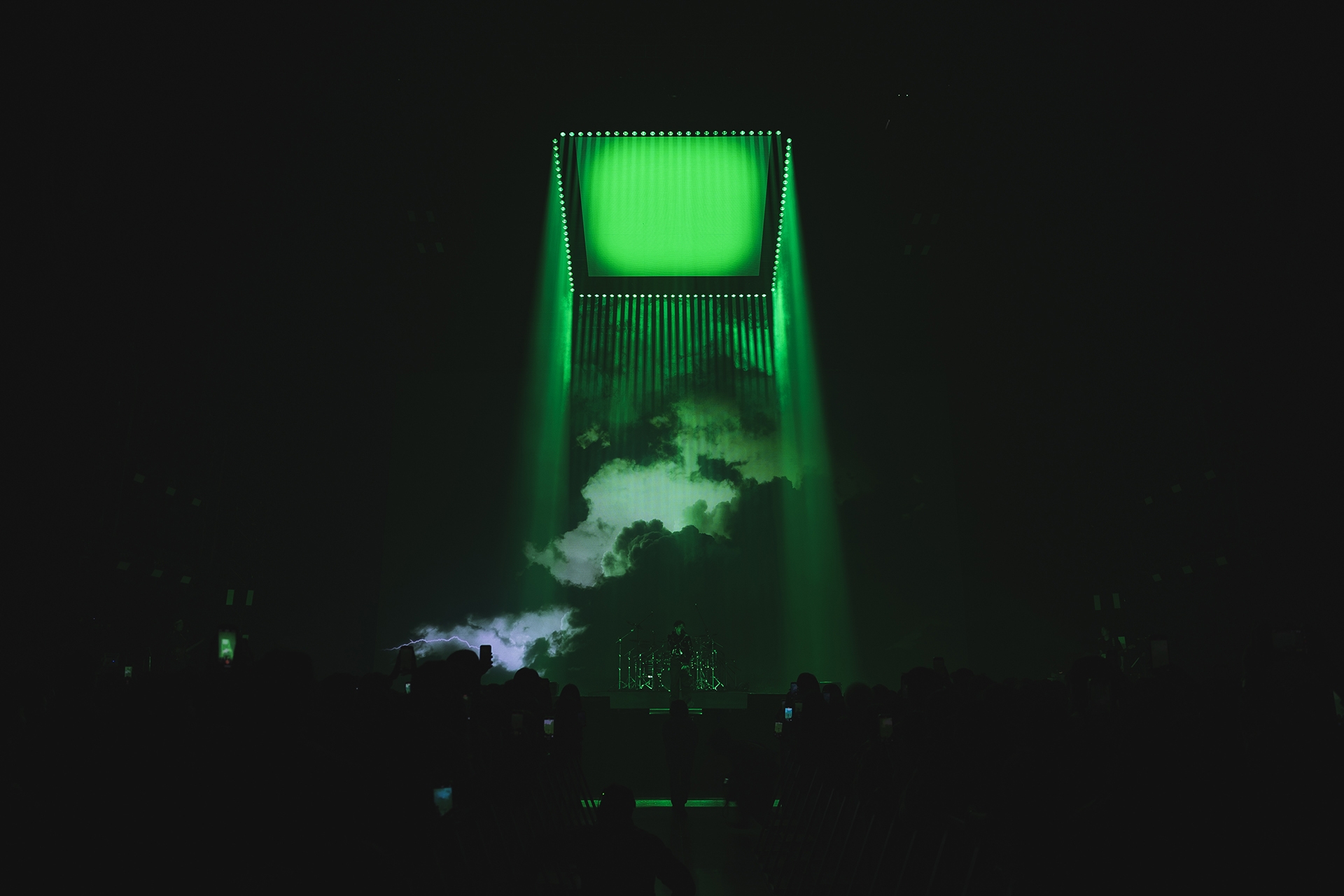 As a performance themed around the concept of a Swirl, the lighting design features a vertical truss placed behind the split LED screens, stretching from the stage floor to above the audience. This breaks away from the conventional top-down view of a swirl, offering a vertical profile perspective instead—symbolizing that both audience and performers are immersed at the same depth within the music, rather than existing in a binary relationship of observer and observed.