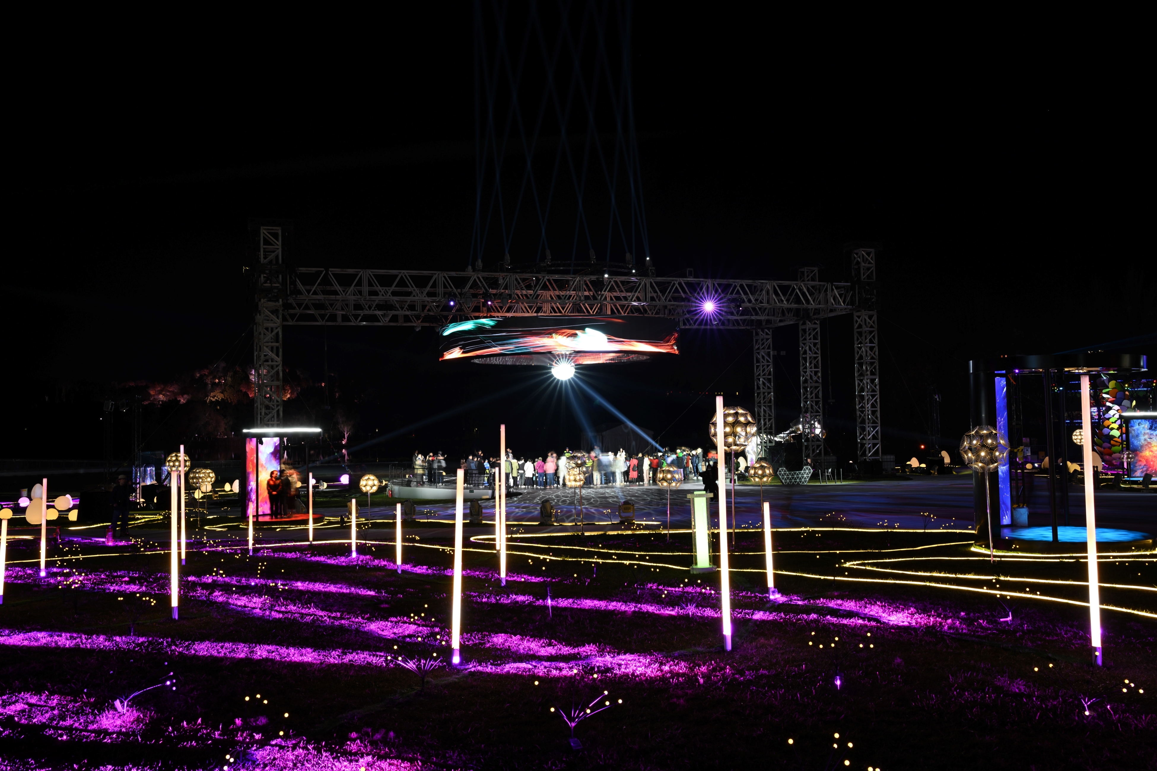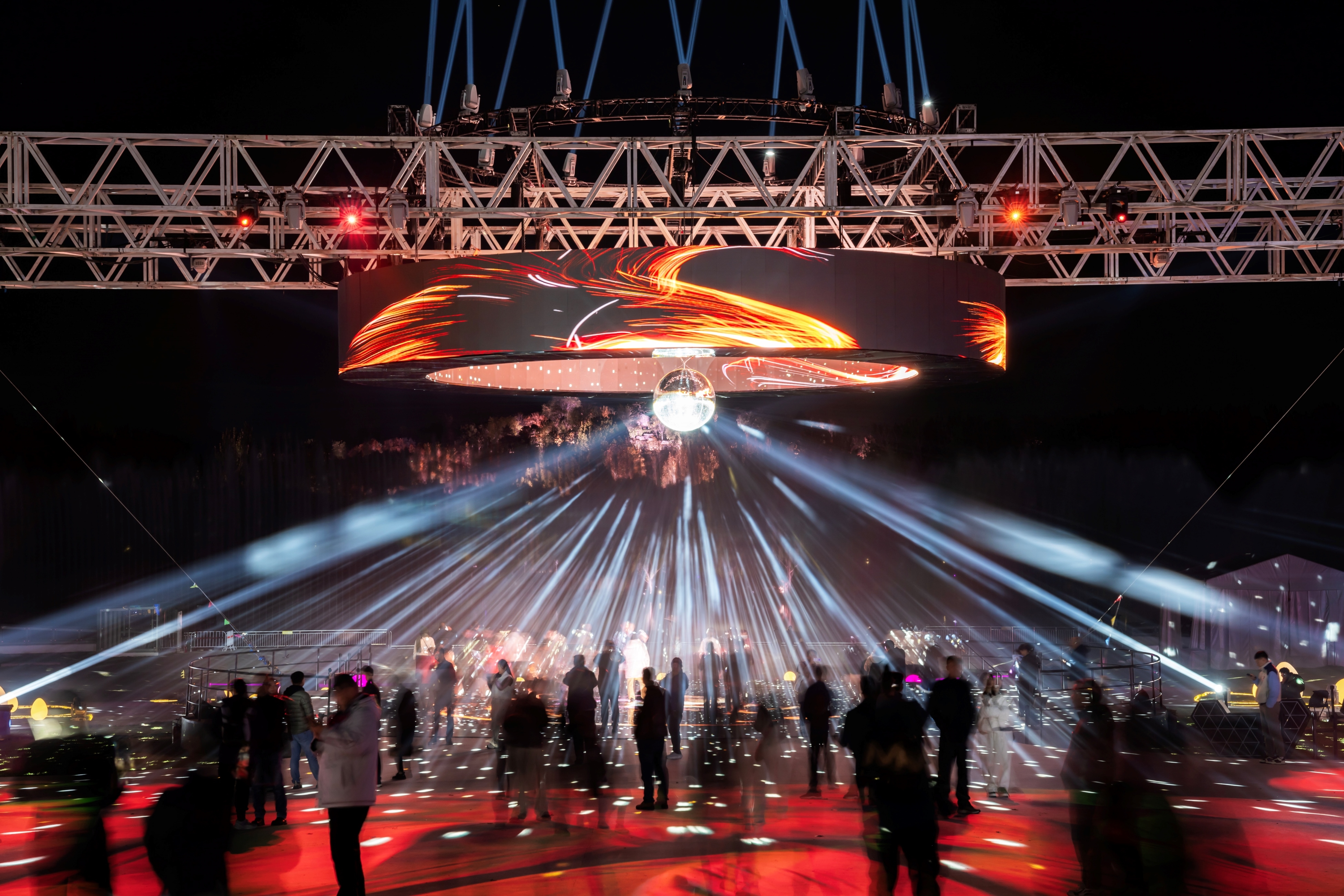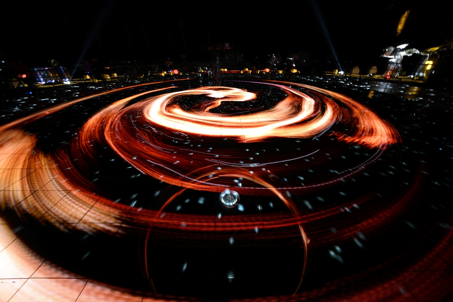 The AI technology can create up to 10 million shinny dot particles of energy as a vortex. The lights change itself in many ways in shape, density and brightness. As people move around and touch the ground, creating a responsive interaction. The scattering light effect aims for more tangible sense and quality.