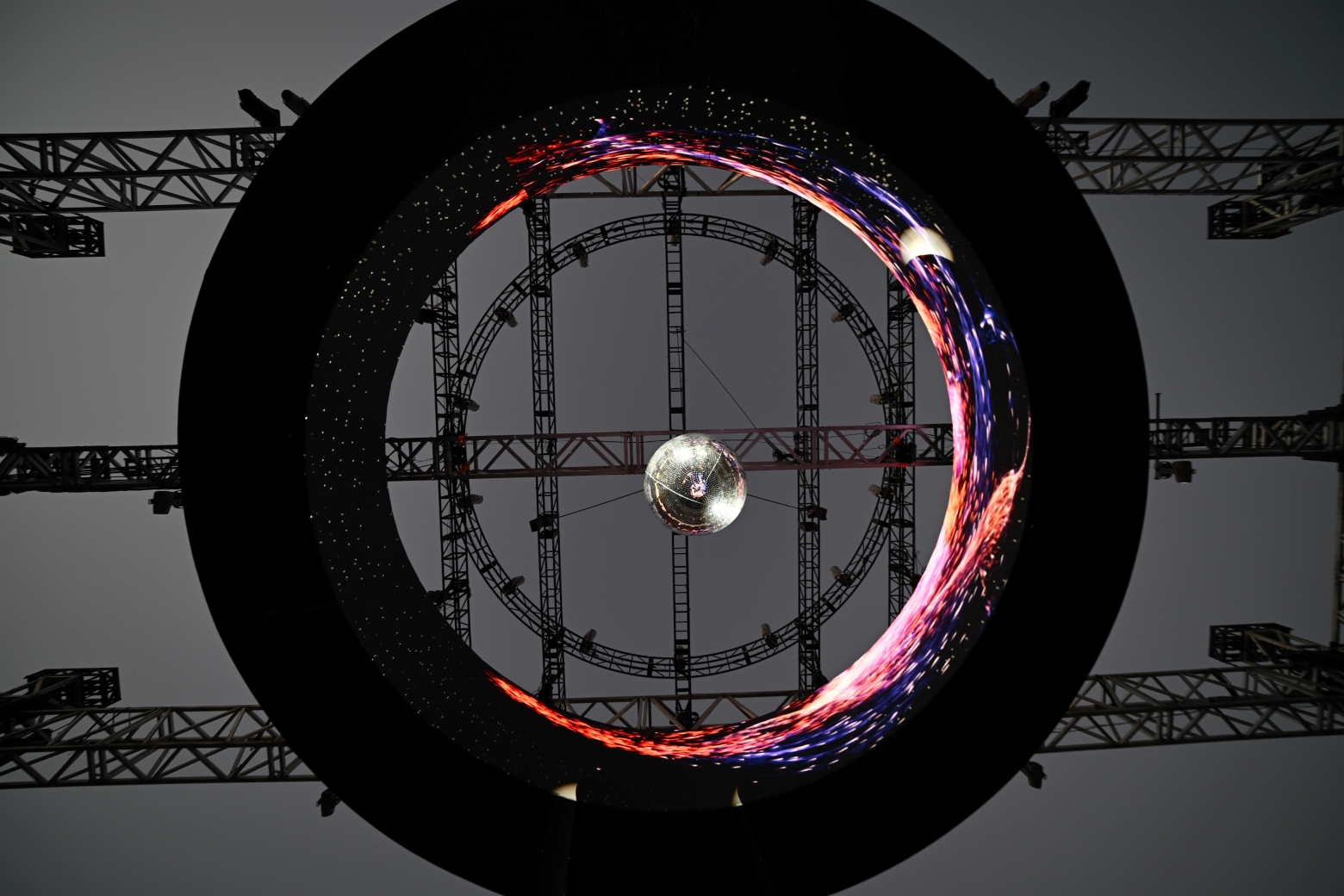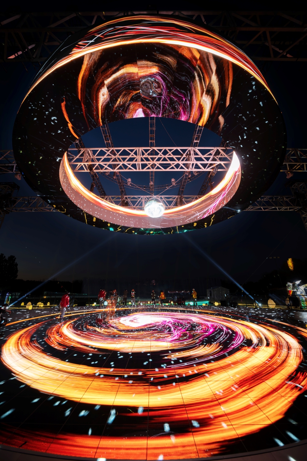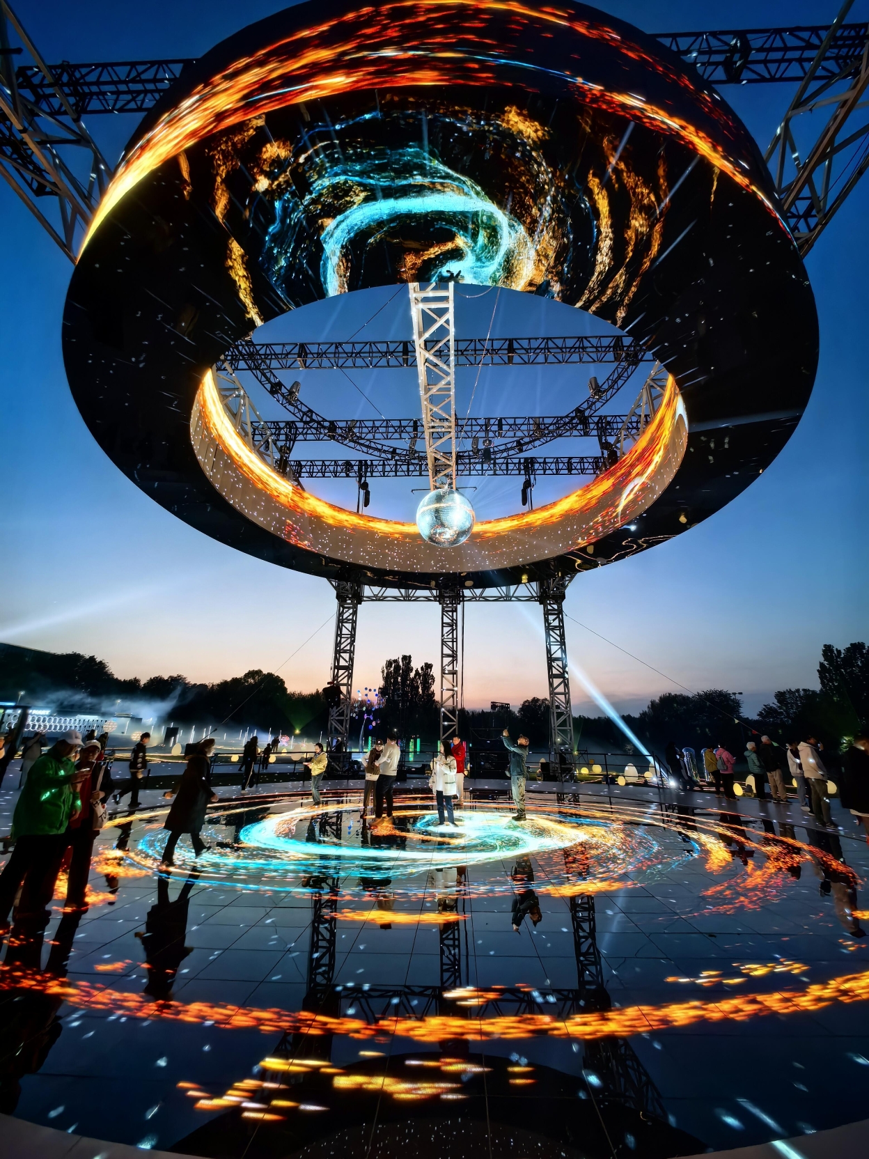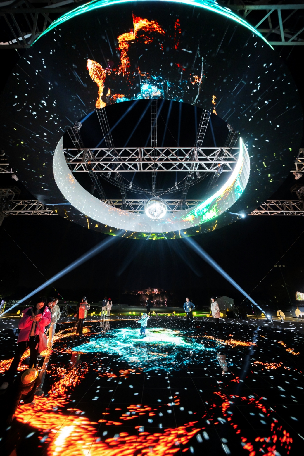 The ring above symbolize sky, sun or heaven. The ground LED screen symbolize earth. The moveable ball in the middle symbolize“fruit of life”, as a bridge connecting “heaven” and “earth”. These parts complement each other, together creating a feel of grand universe, the mysterious almighty. People walk along the stairs into the center, a temple of light and shadow, sacred, cosmic dimension, experiencing infinite charm.