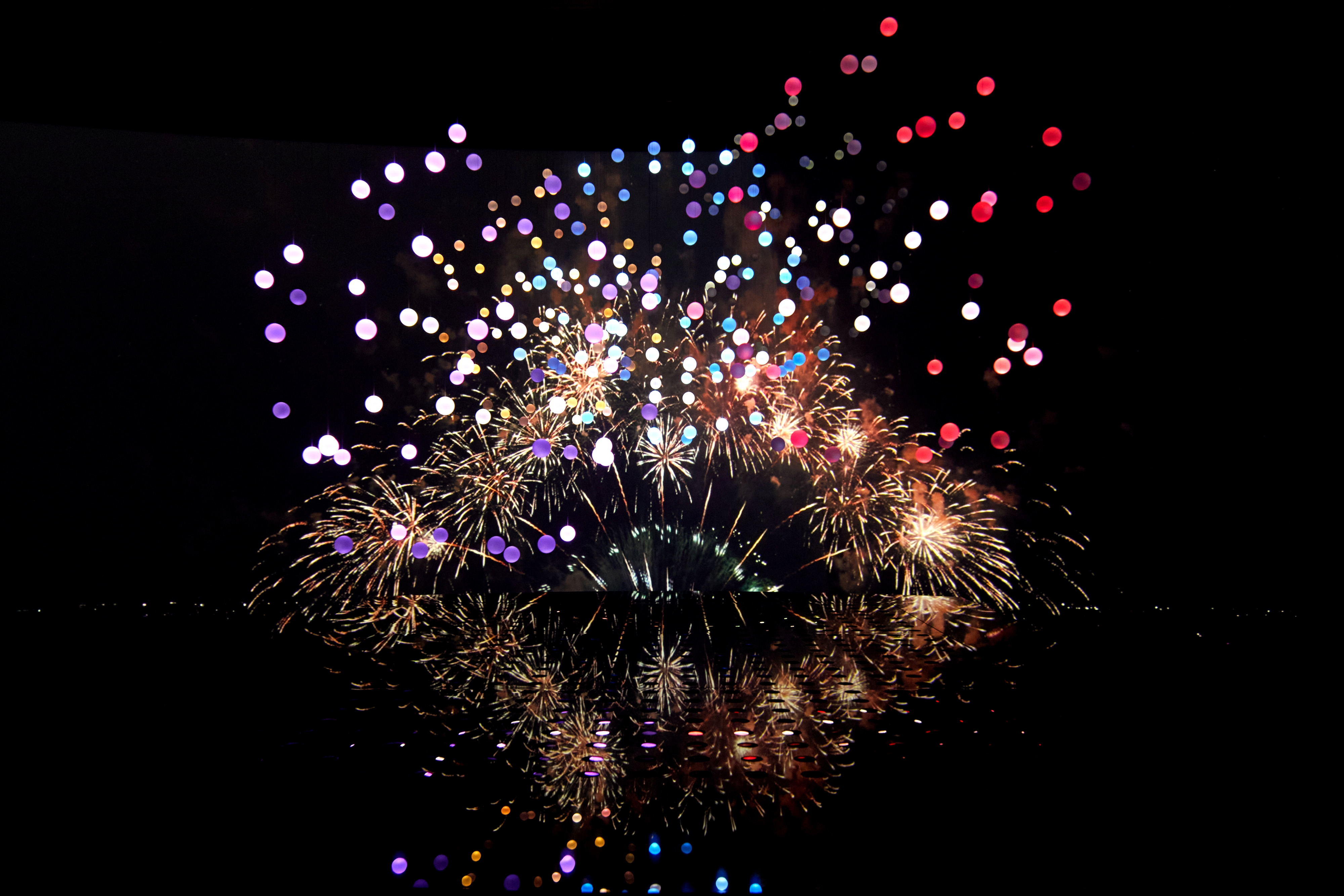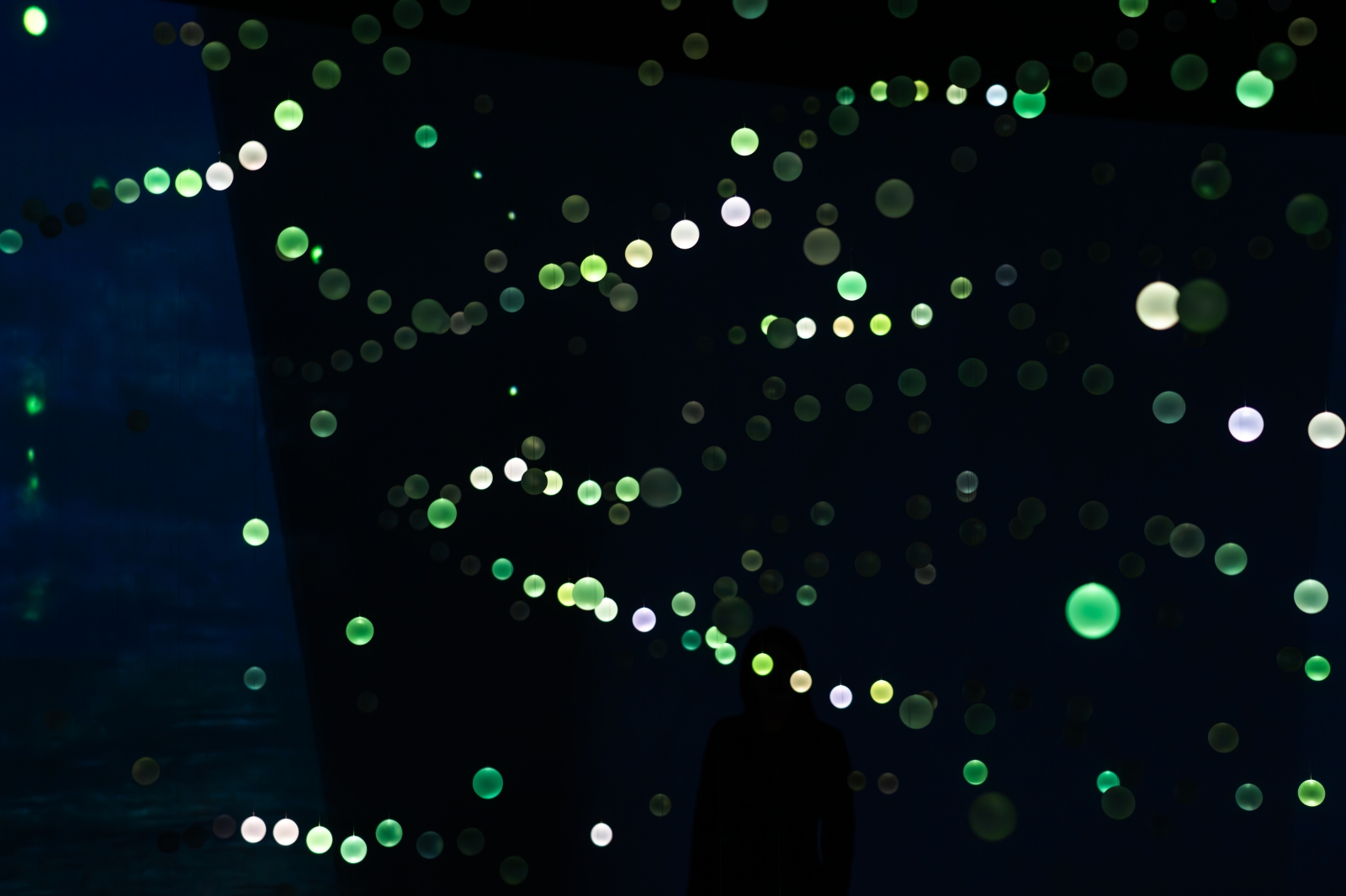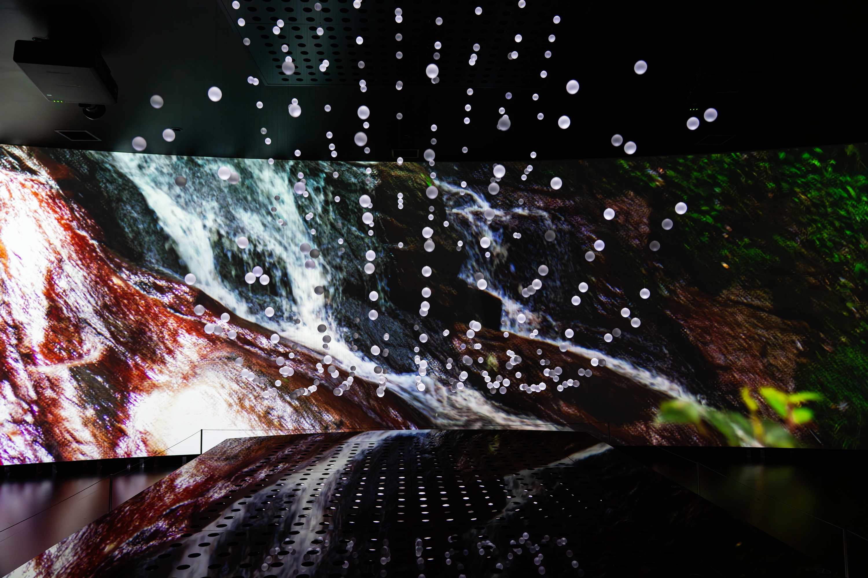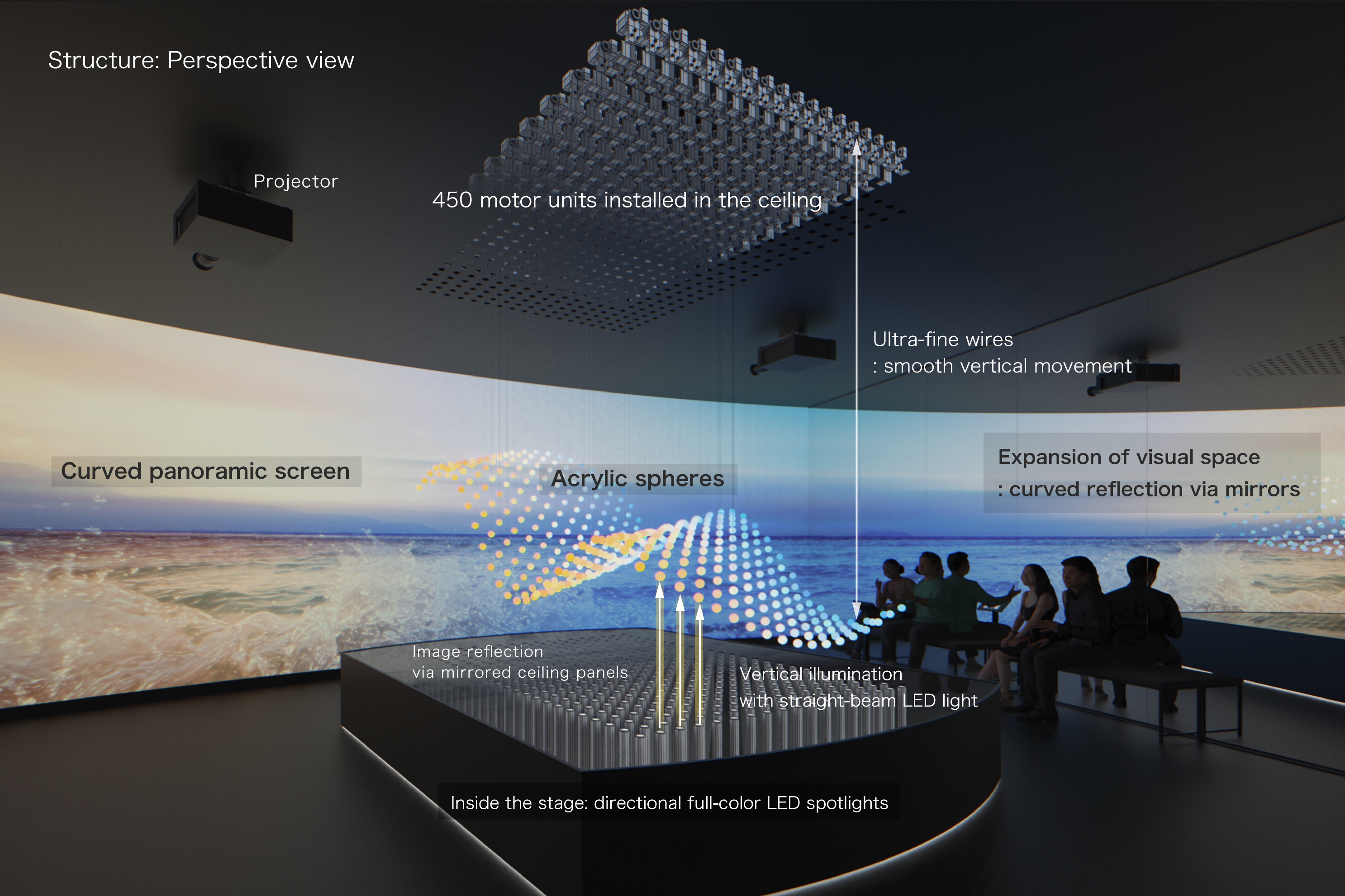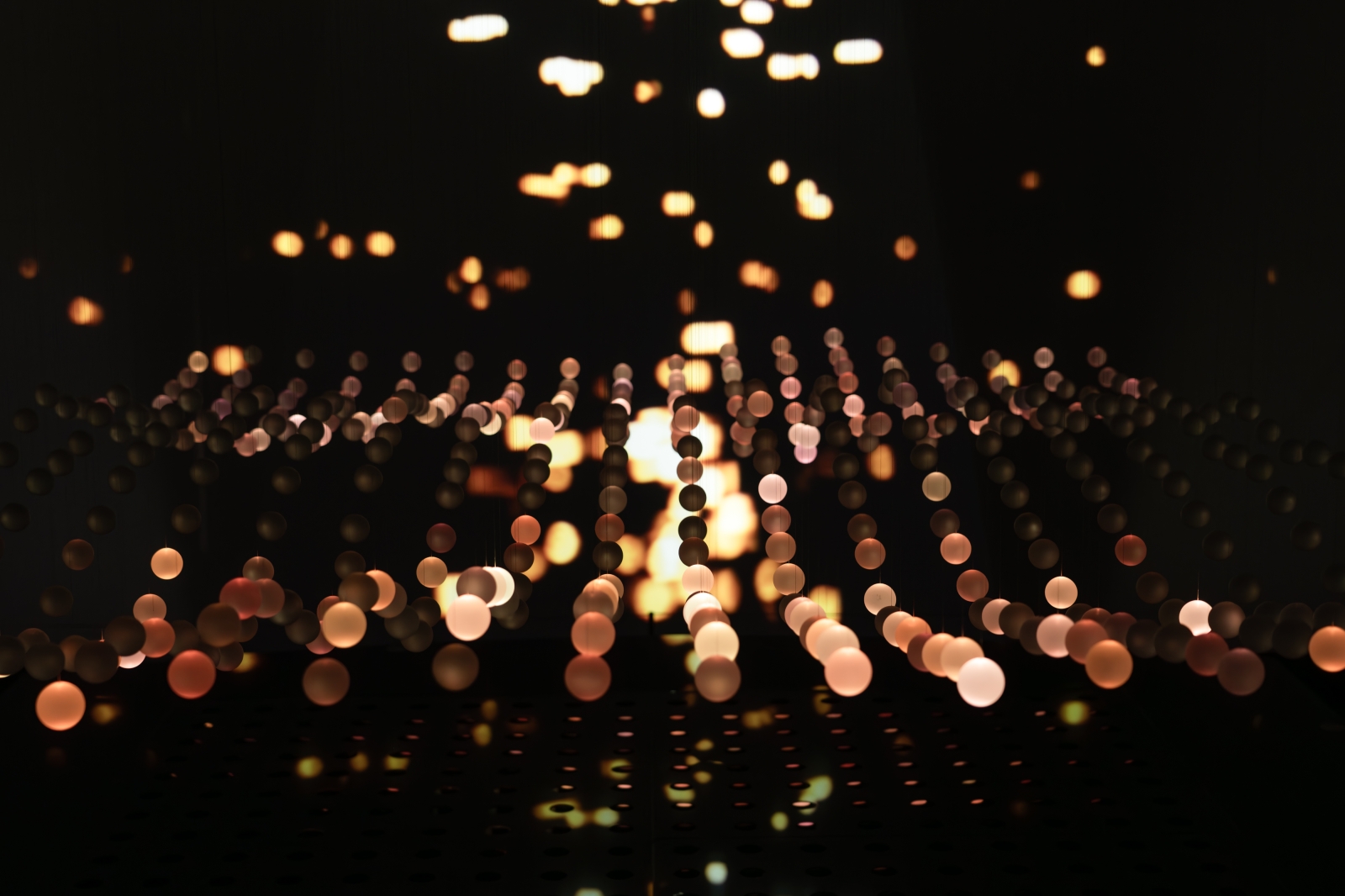 The K.L.V system controls the vertical movement of each acrylic sphere, suspended by ultra-fine wires and driven by precision stepper motors. Vertically projected beams from directional full-color LED spotlights illuminate the spheres from below, turning them into floating particles of light.