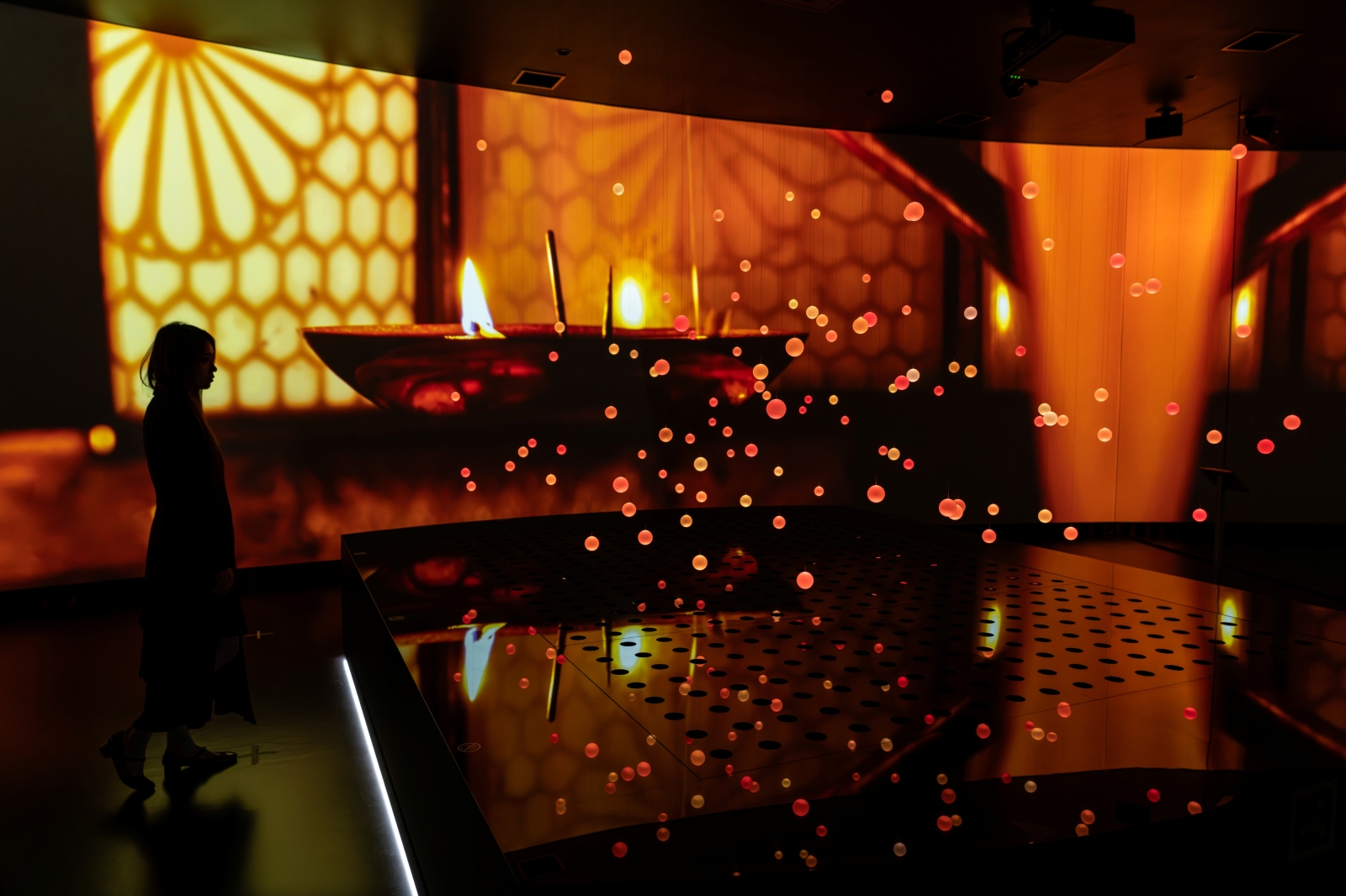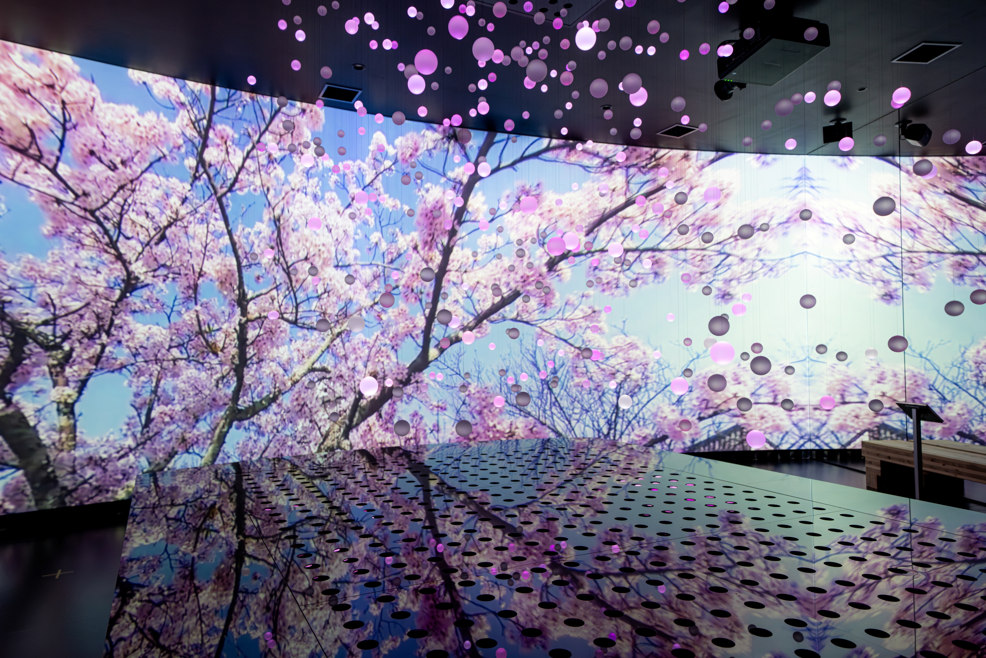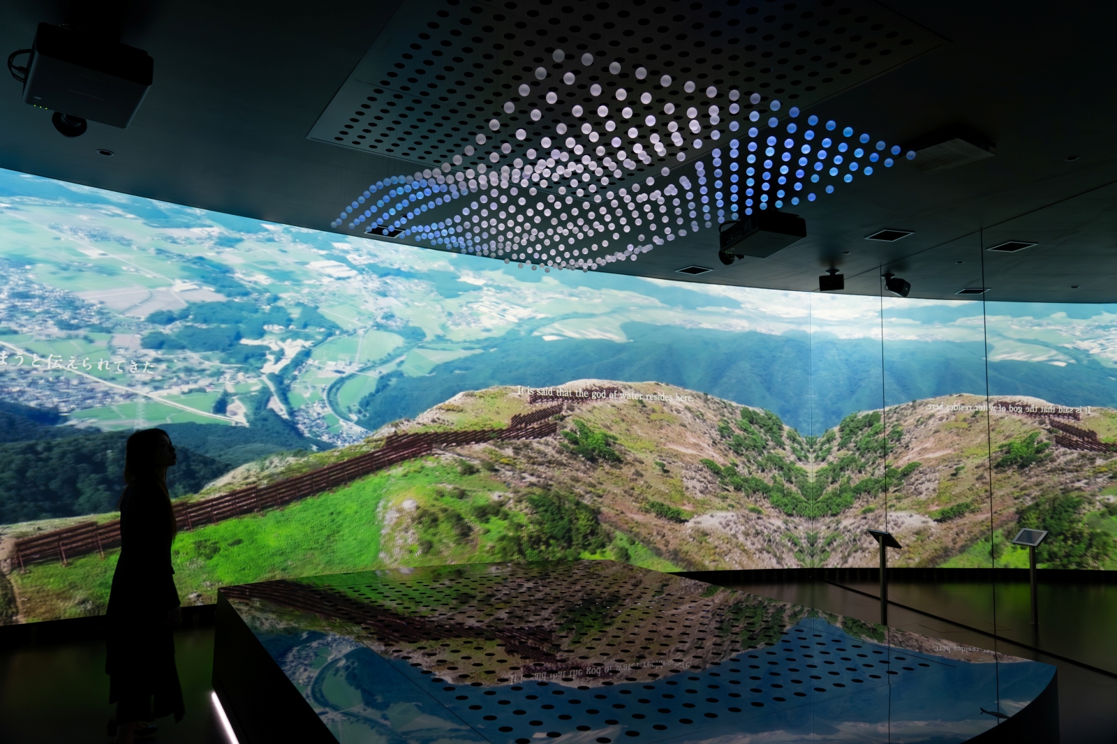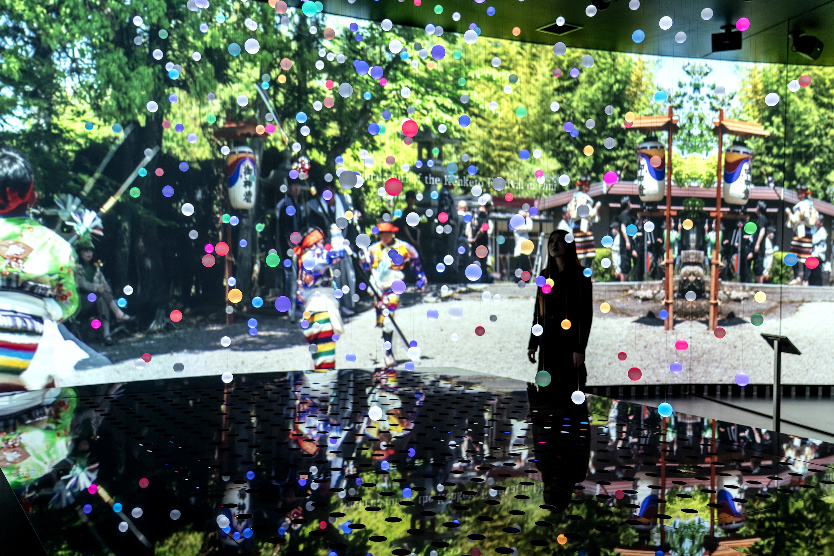 The scenes shift to reflect the seasonal beauty of Japan—cherry blossoms, fireflies, fireworks, and autumn foliage—portraying the ever-changing landscapes of Shiga. These vivid visuals come to life through choreographed sphere motion, light, mirrors, and curved projections, creating an immersive experience.