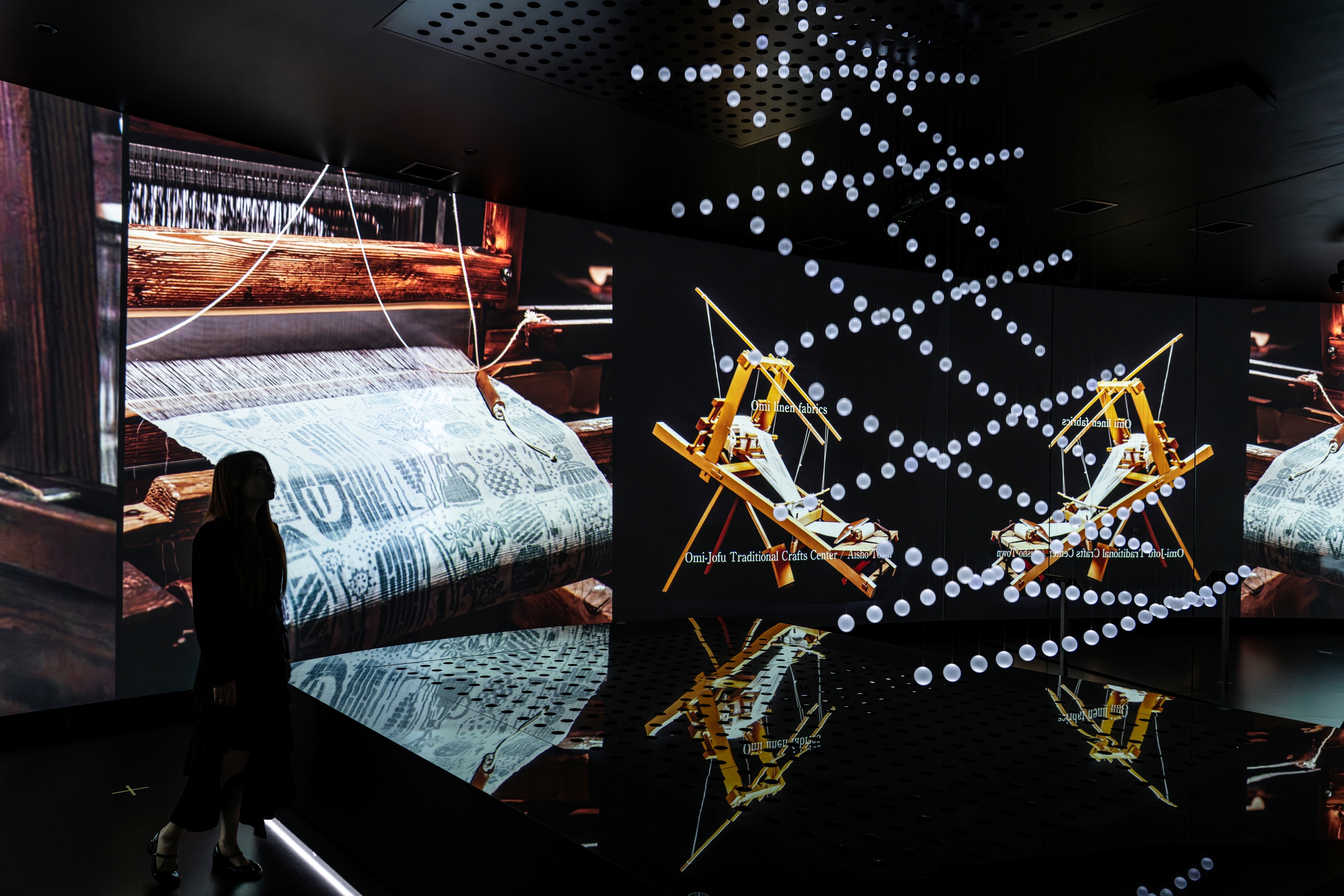Immersive visuals on curved and mirrored screens recreate the landscapes around Lake Biwa, Japan’s largest lake, within the space. The region’s colors and rhythms synchronize with the spheres’ movement, leaving a lasting impression. Like a spatial motion pictogram, the installation offers a clear, nonverbal, intuitive experience.