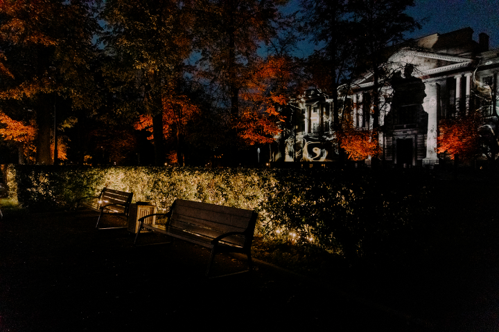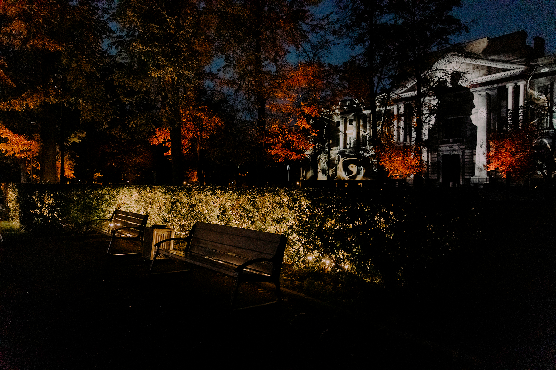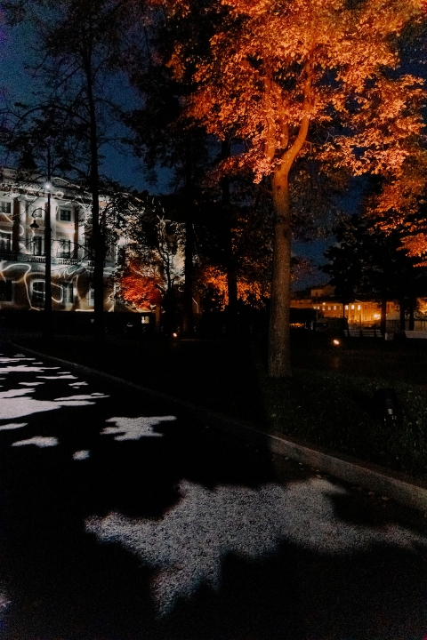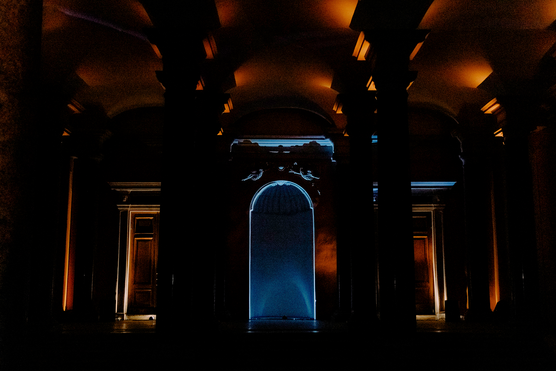 Time slots for creating sensations through light adaptation (15 minutes), dark adaptation (7 minutes) were used. The use of colored light and diffuse light transformation effects occurs only within the framework of the audiovisual performance in the courtyard.