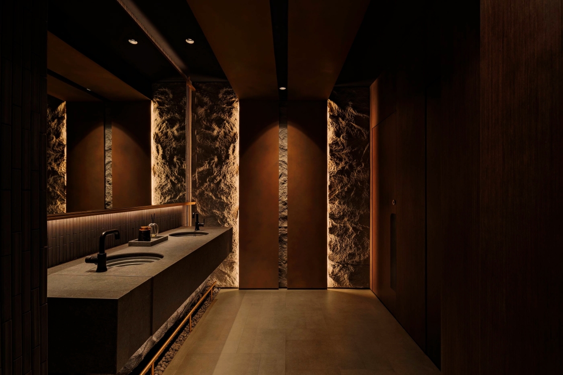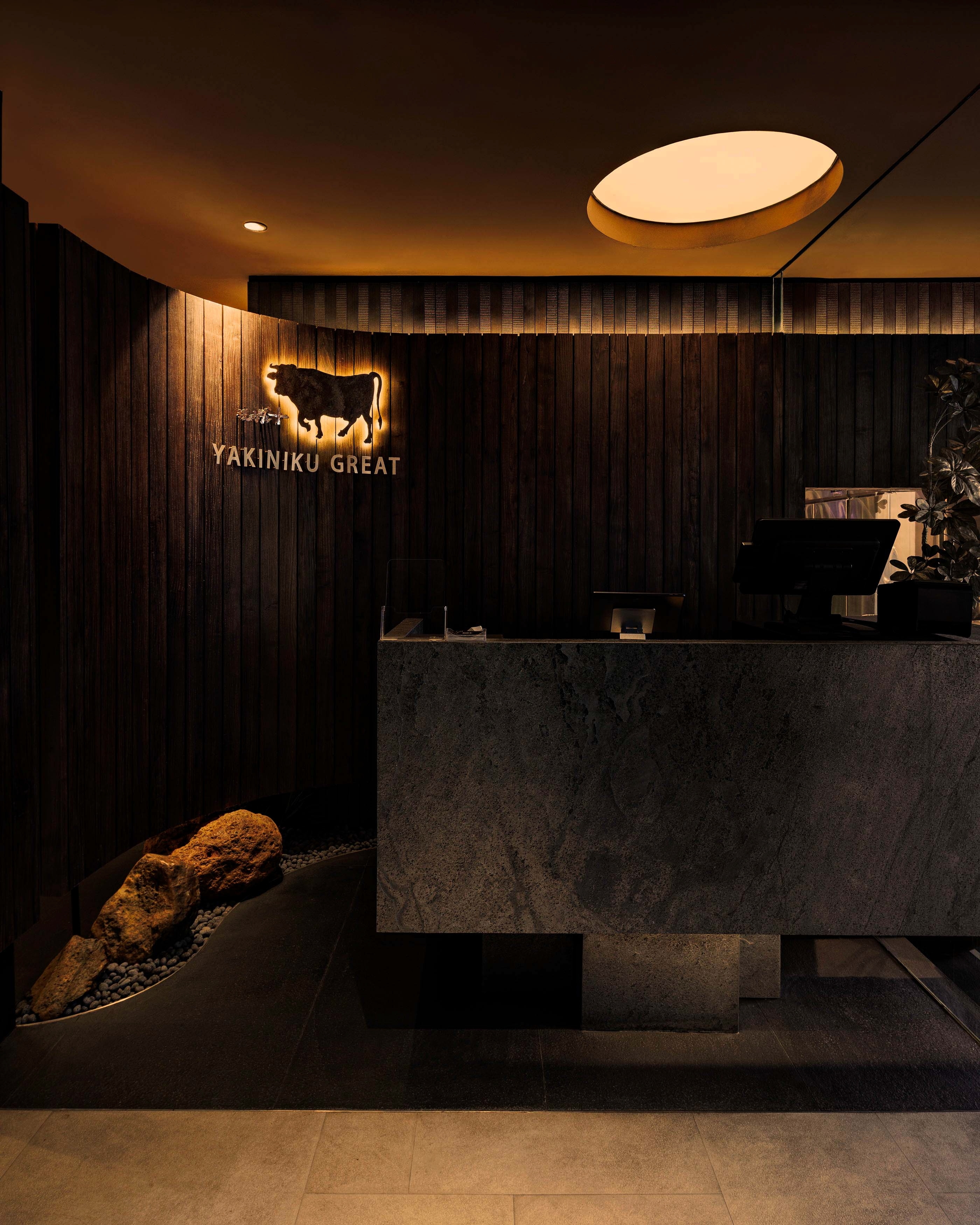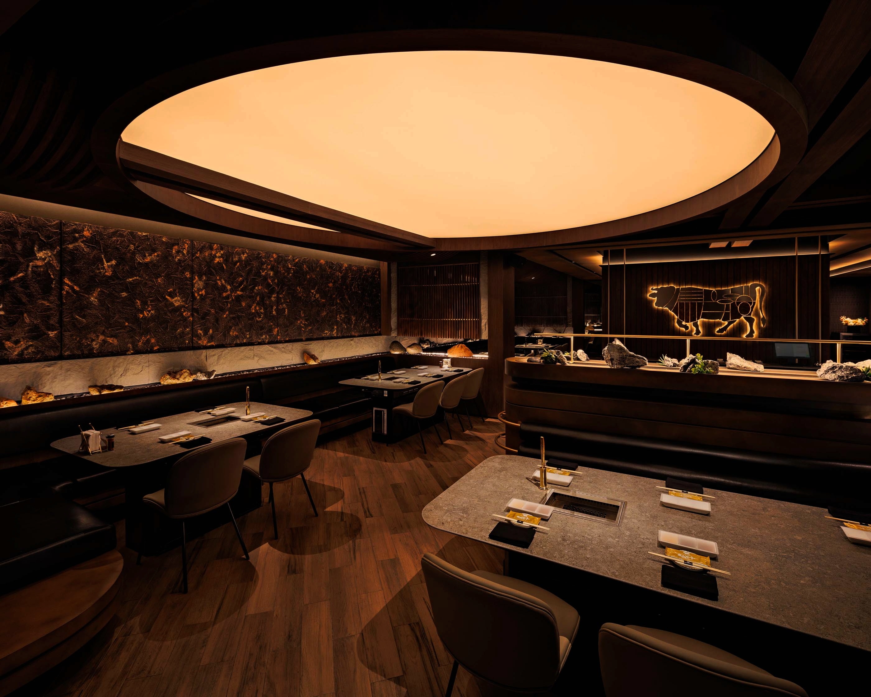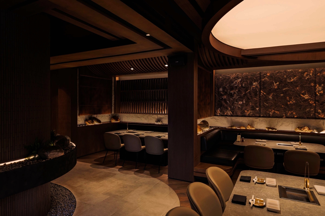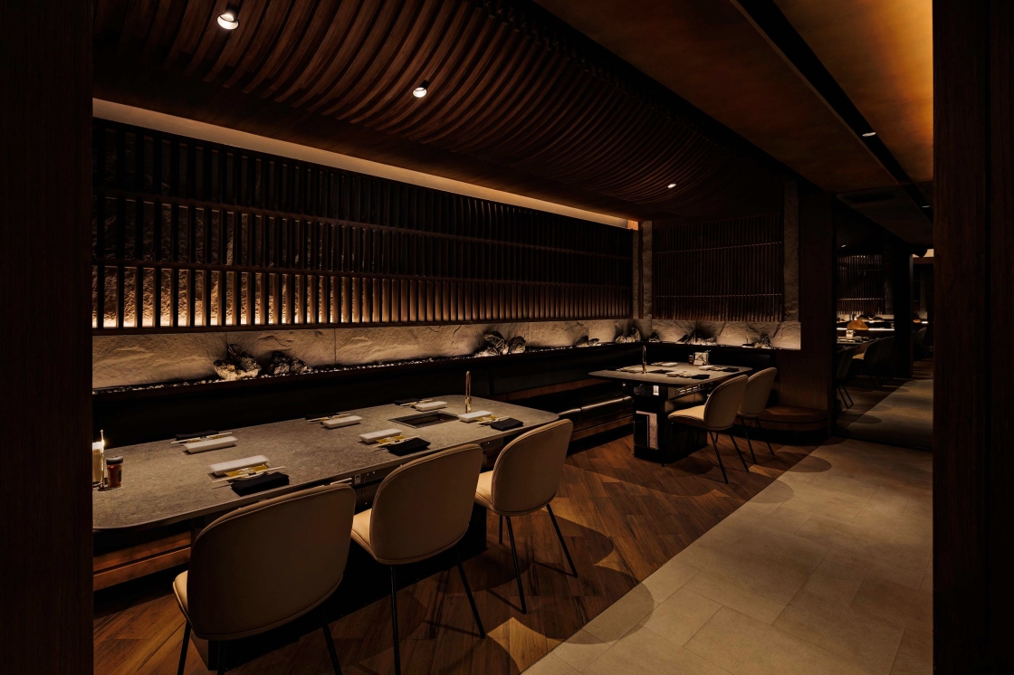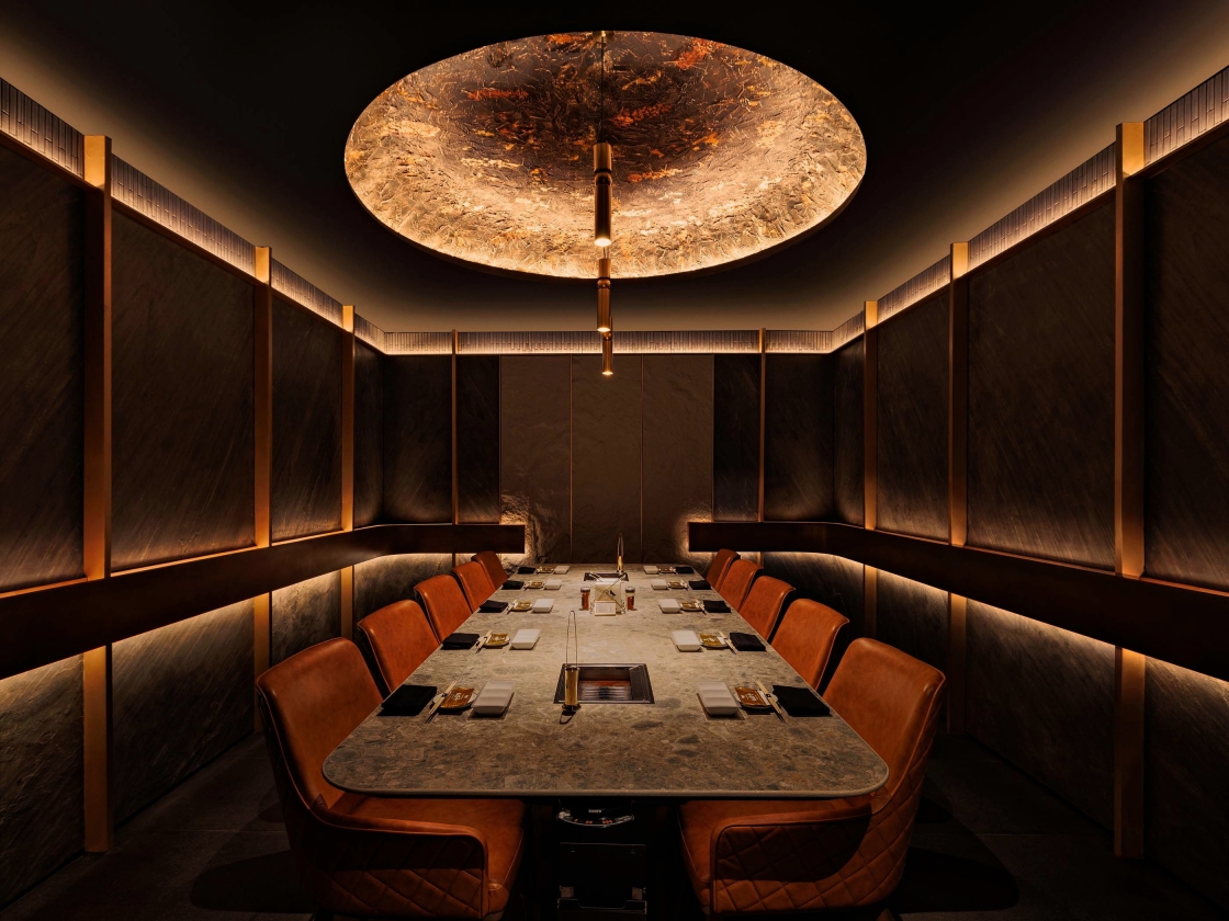 Entry DescriptionThe lighting design celebrates the sensory theatre of yakiniku, where the glow of live cooking becomes the visual centrepiece. Using 2700K warm white with CRI97, every marbled detail of premium meat is rendered with true-to-life richness, enhancing appetite and visual allure. Over each grill, focused accent lighting creates a luminous stage, while surrounding areas are kept in subdued, layered light to heighten contrast and intimacy.