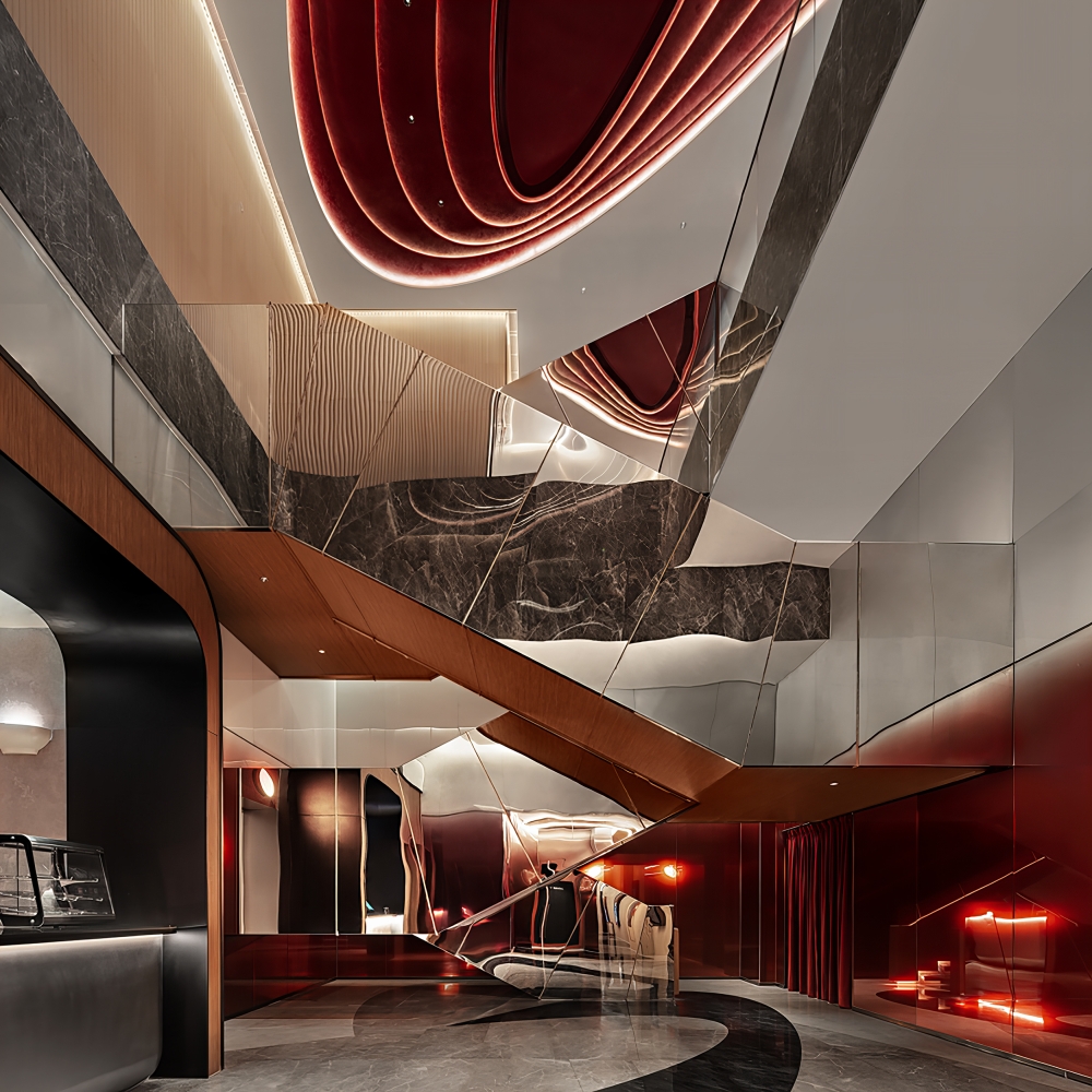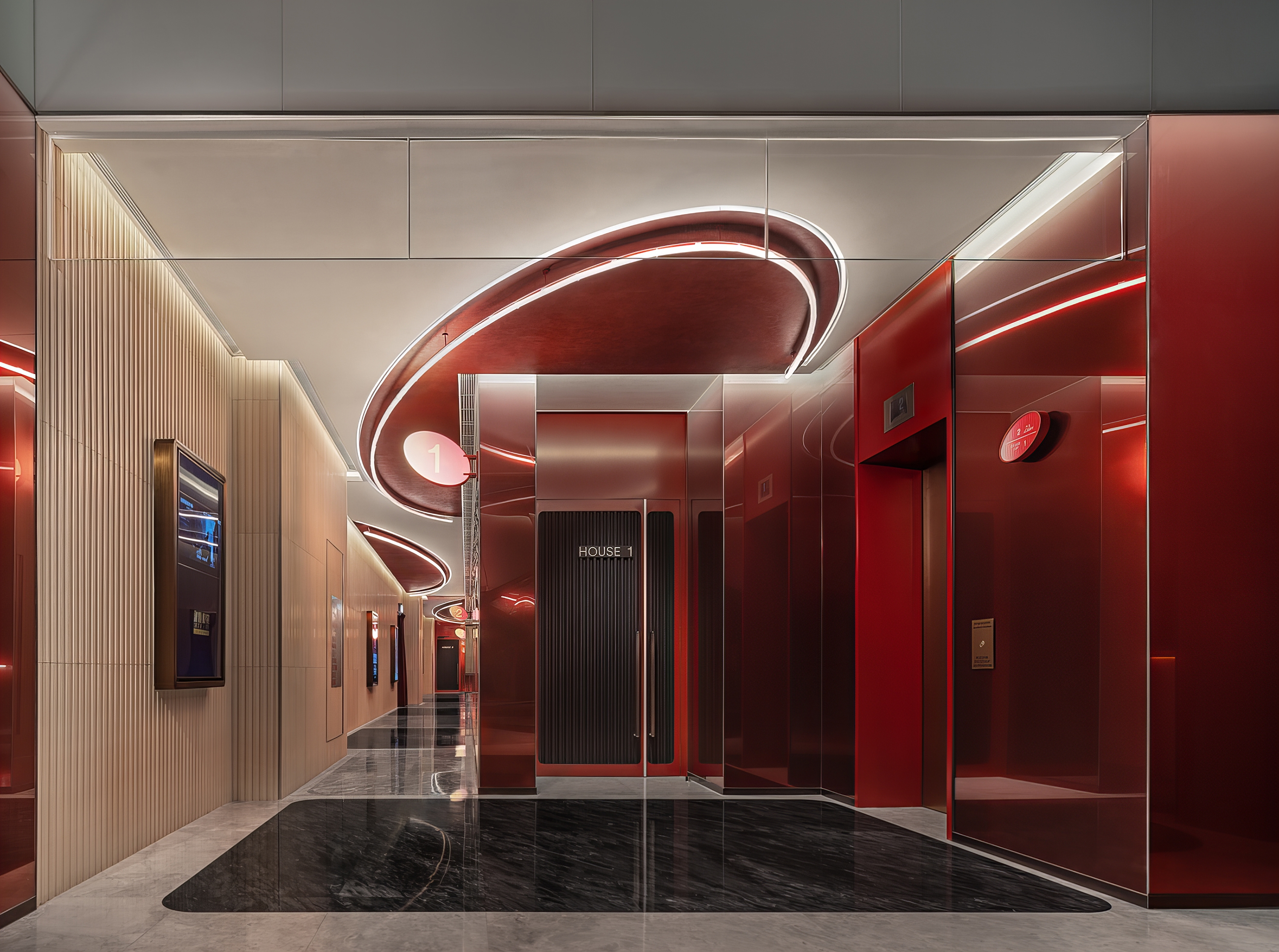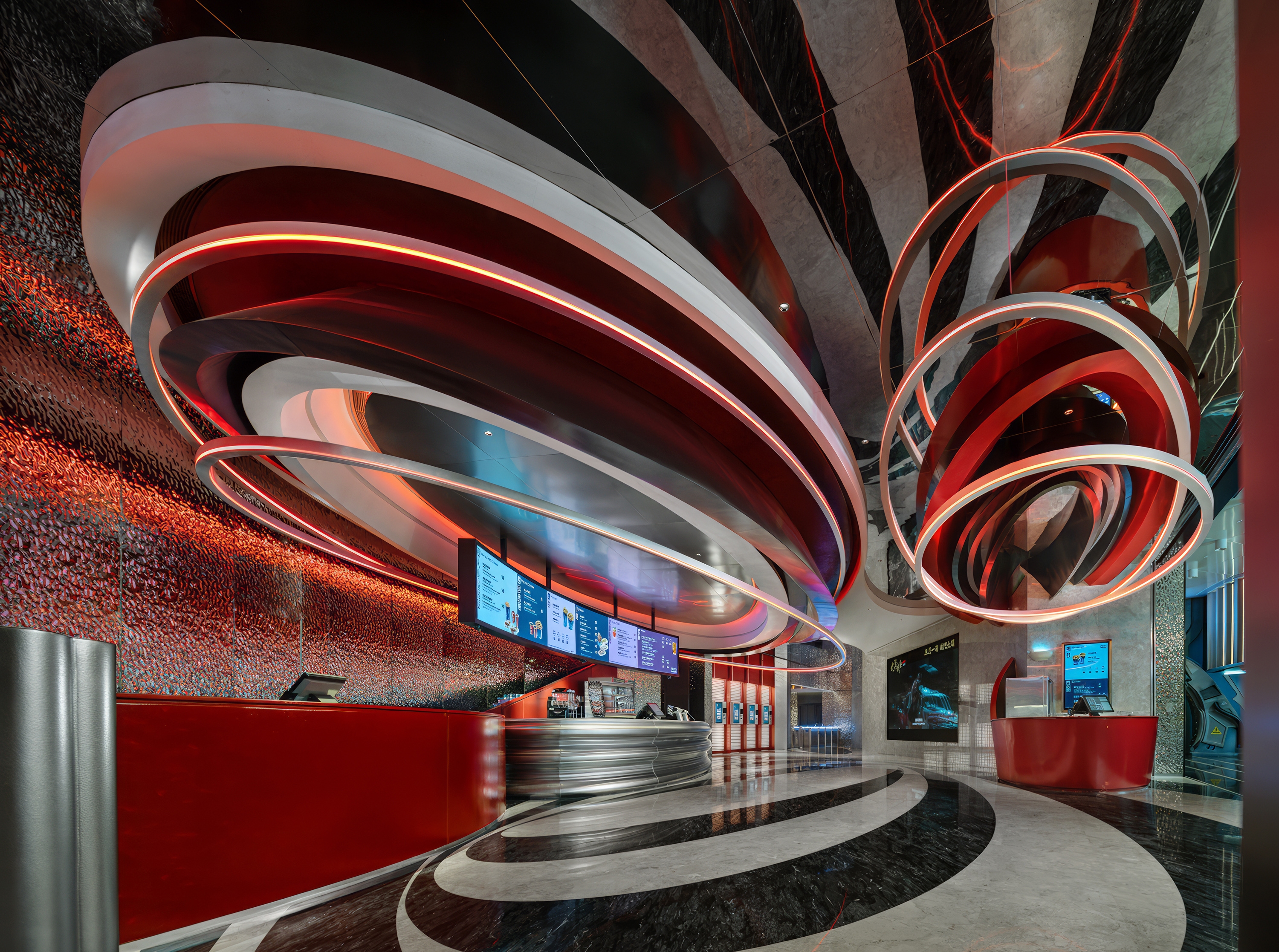 The design referenced cinema fundamentals, using light patterns and reflections to craft a dynamic atmosphere. The entrance features oval light rings with RGBW pixel control, a mirrored ceiling, and reflective floors to amplify effects. Downlights highlight counters and create dramatic contrasts. Ticket vending machines feature backlit metal mesh for attention-grabbing detail.