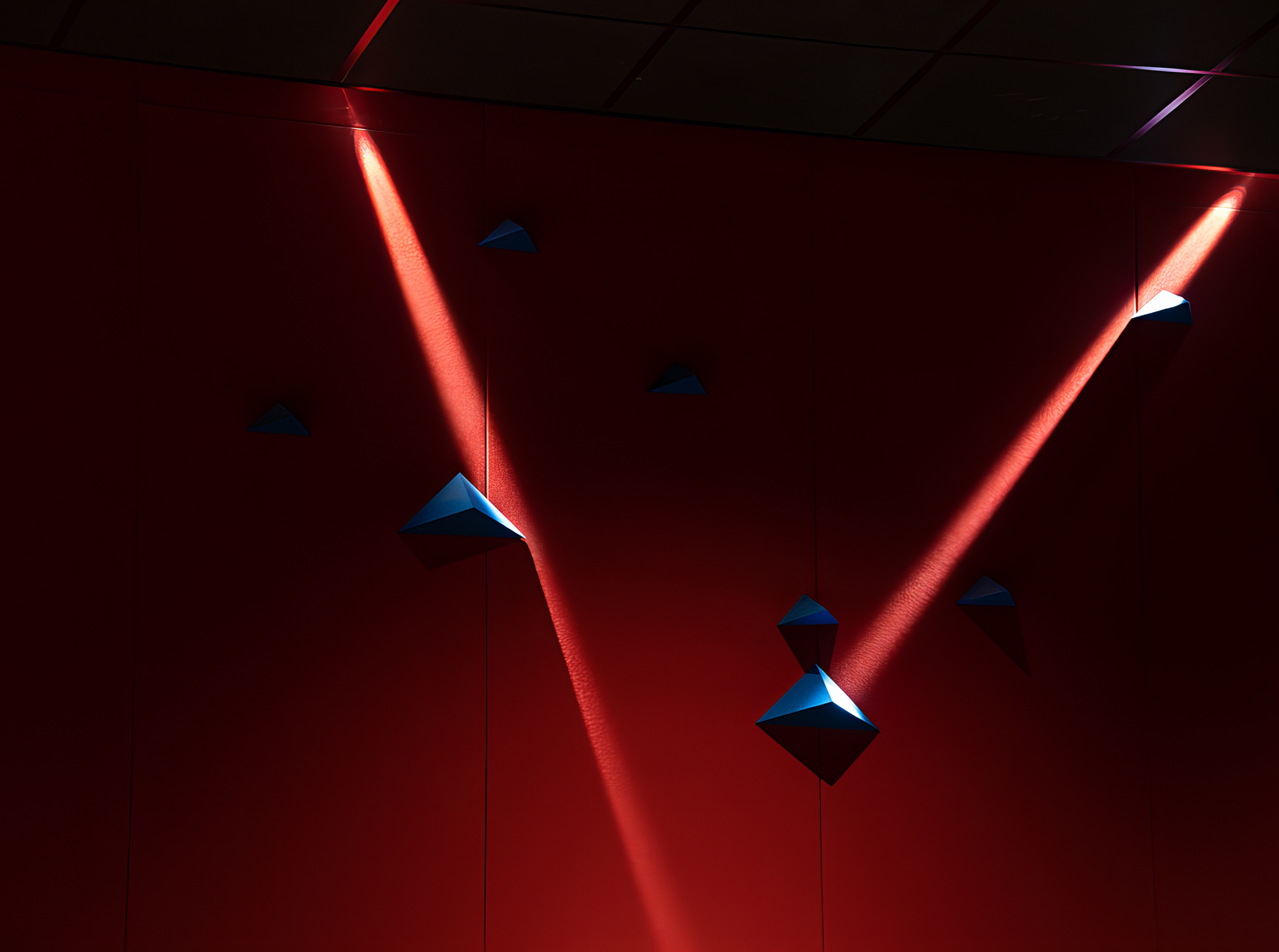 Within cinemas, dramatic lighting contrasts light and shadow. Narrow beams graze walls, enhancing triangular patterns. Water-effect projectors create shimmering