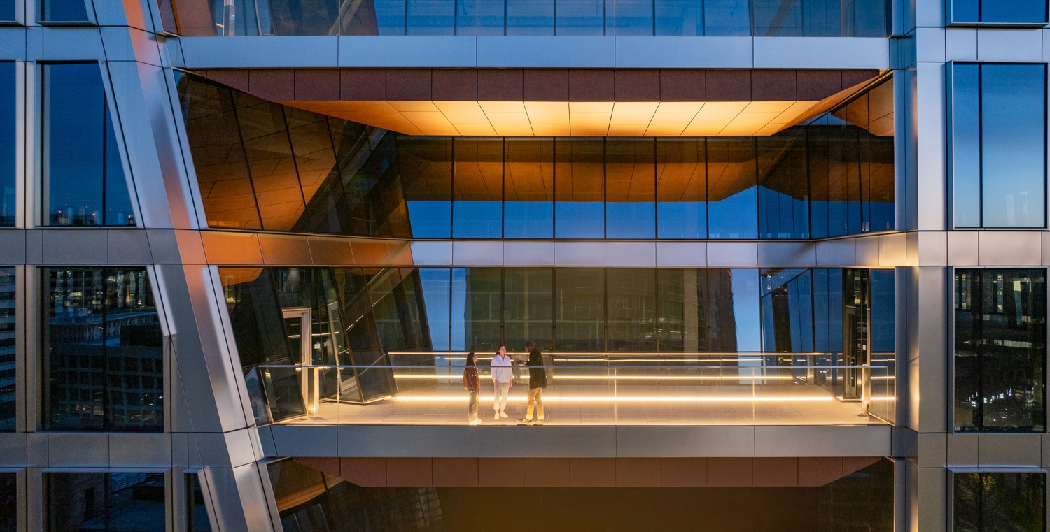 Outside, a sculptural façade features illuminated vertical “canyons” achieved with concealed luminaires, producing a “magic light” effect through precise beam control. The architectural lighting harmonizes with the surrounding cityscape while reinforcing the building’s distinct identity. Indirect uplighting and concealed LEDs under benches, balconies, and guardrails activate the public realm, creating a nighttime ambiance that blends commercial elegance with urban warmth.