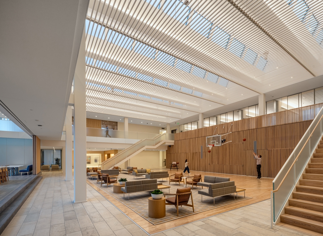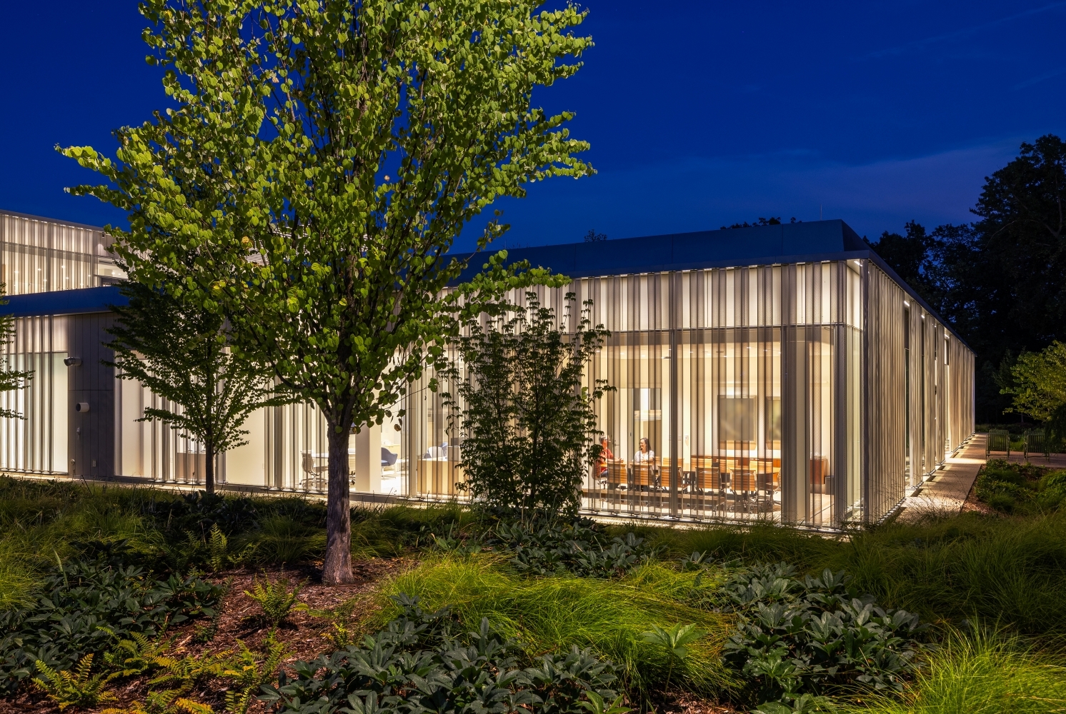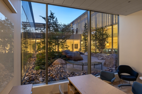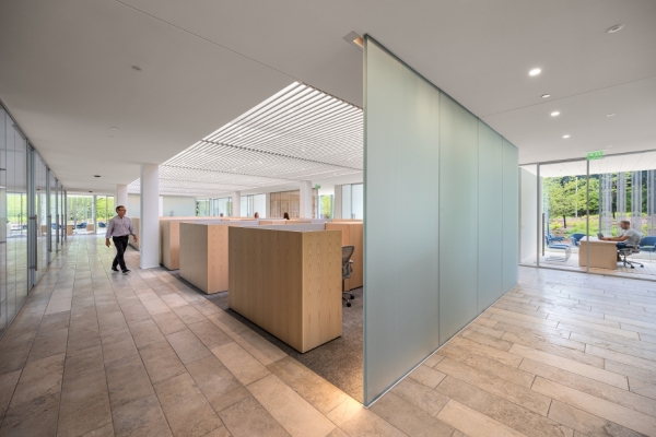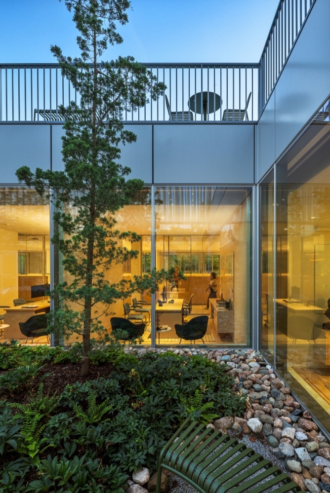 Inside, two skylit areas are enhanced with asymmetric uplights that gracefully wash the volumes when daylight is absent. Miniature cylinder downlights are precisely aligned with slender tube screen below the monitors, maintaining a sense of order and refinement. In private offices and the library, a combination of minimal downlights and wall-mounted uplights with asymmetric optics creates a soft yet focused environment, balancing functionality with comfort.