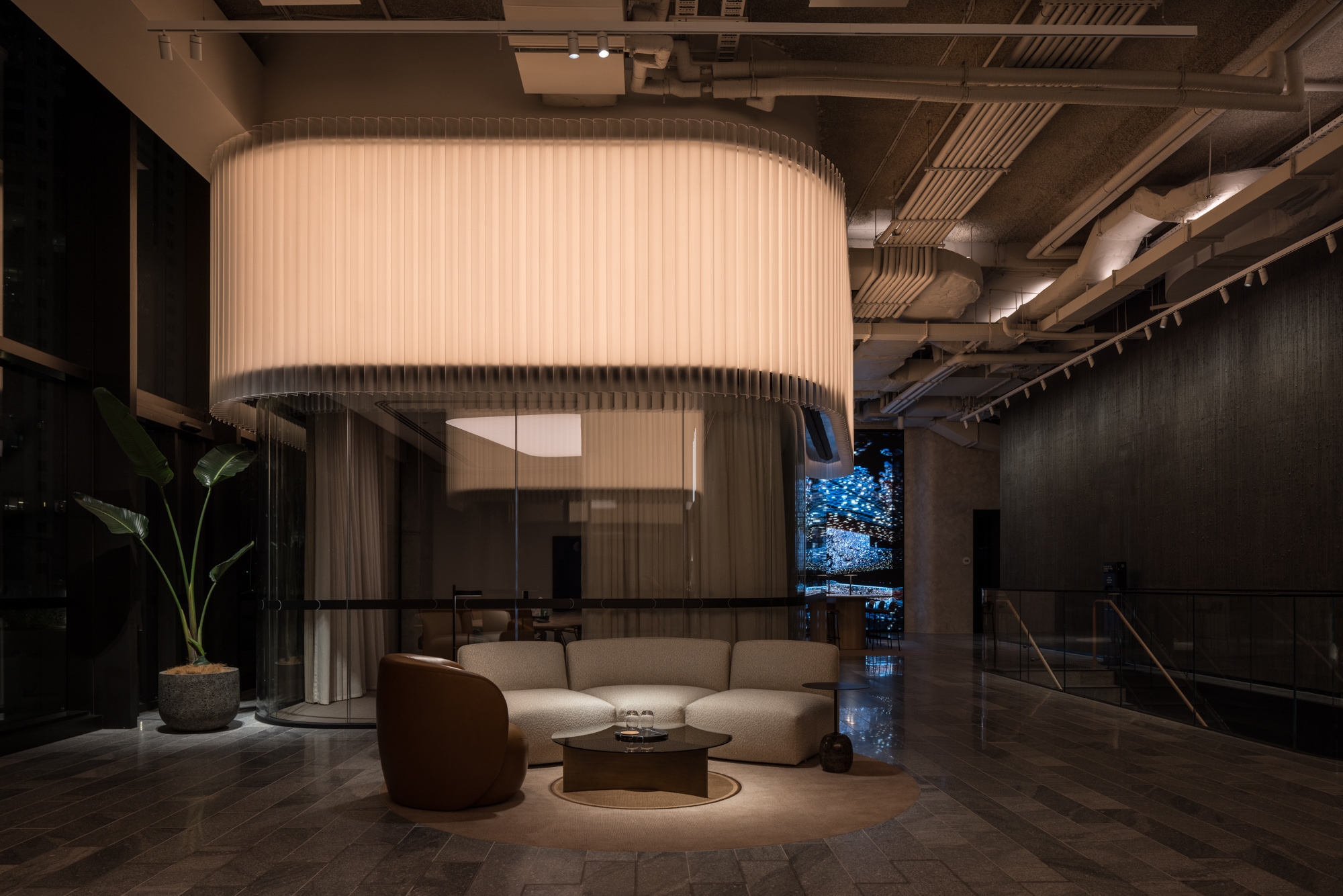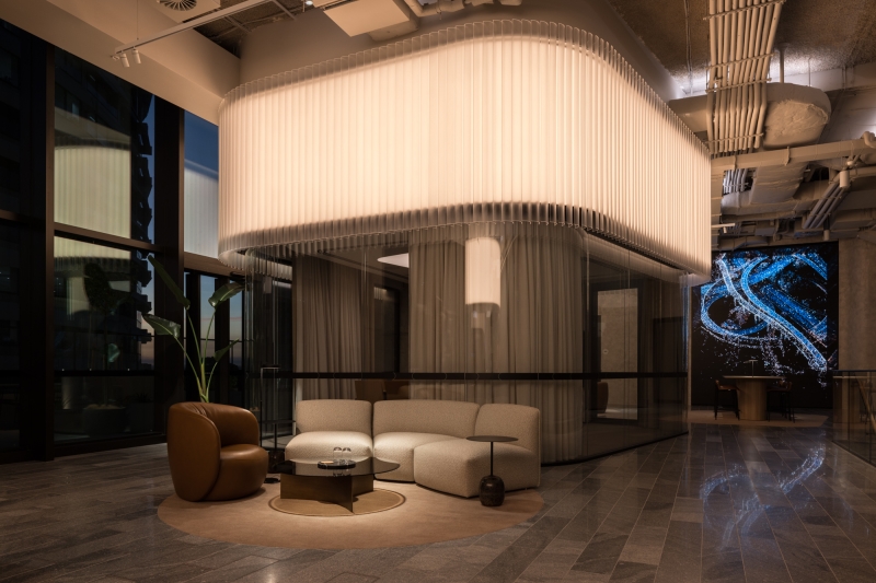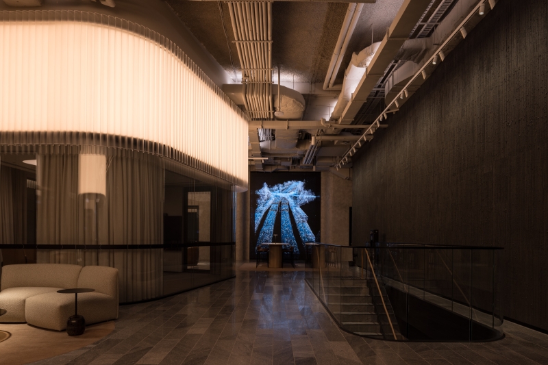 Lighting is stitched throughout the combination of refined and raw interior elements to provide a luminous back-drop to the double-height glazed western elevation. The entire space is tuned to morph throughout the day through a series of synchronised colour temperatures and balanced intensities, with Morning / Midday / Afternoon / Night / Late-Night settings driven by the 365-day timeclock. The design brings the outside in with cool white illumination, embracing natural light from the full-height glazing to the adjacent terrace overlooking George Street to the West.
