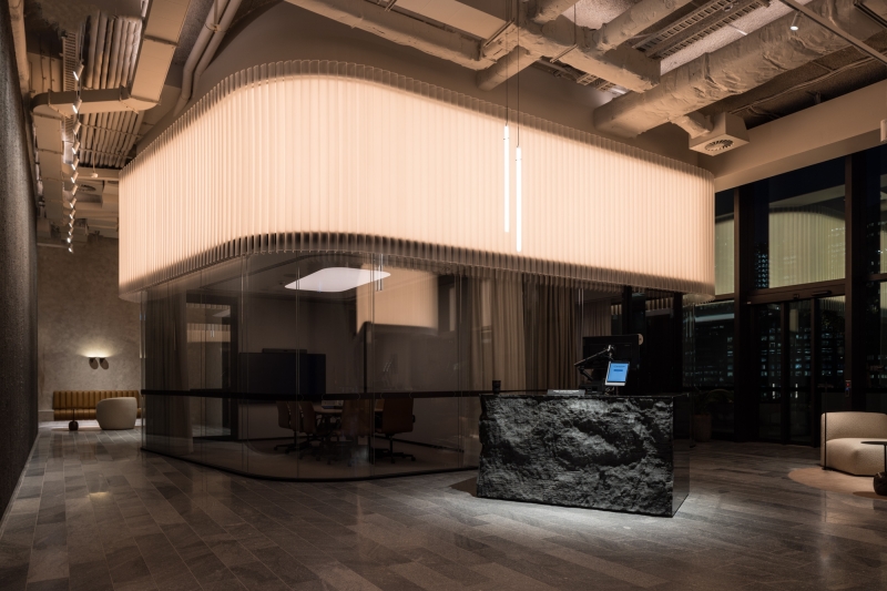 All floors experience significant natural light during the afternoon, creating a challenging environment for illumination as the workspaces and client function areas transition into night. The lighting design looked to capitalise on the generous ceiling heights to sculpt a series of macro-scaled light ‘objects’ that present as lanterns on the arrival floor.