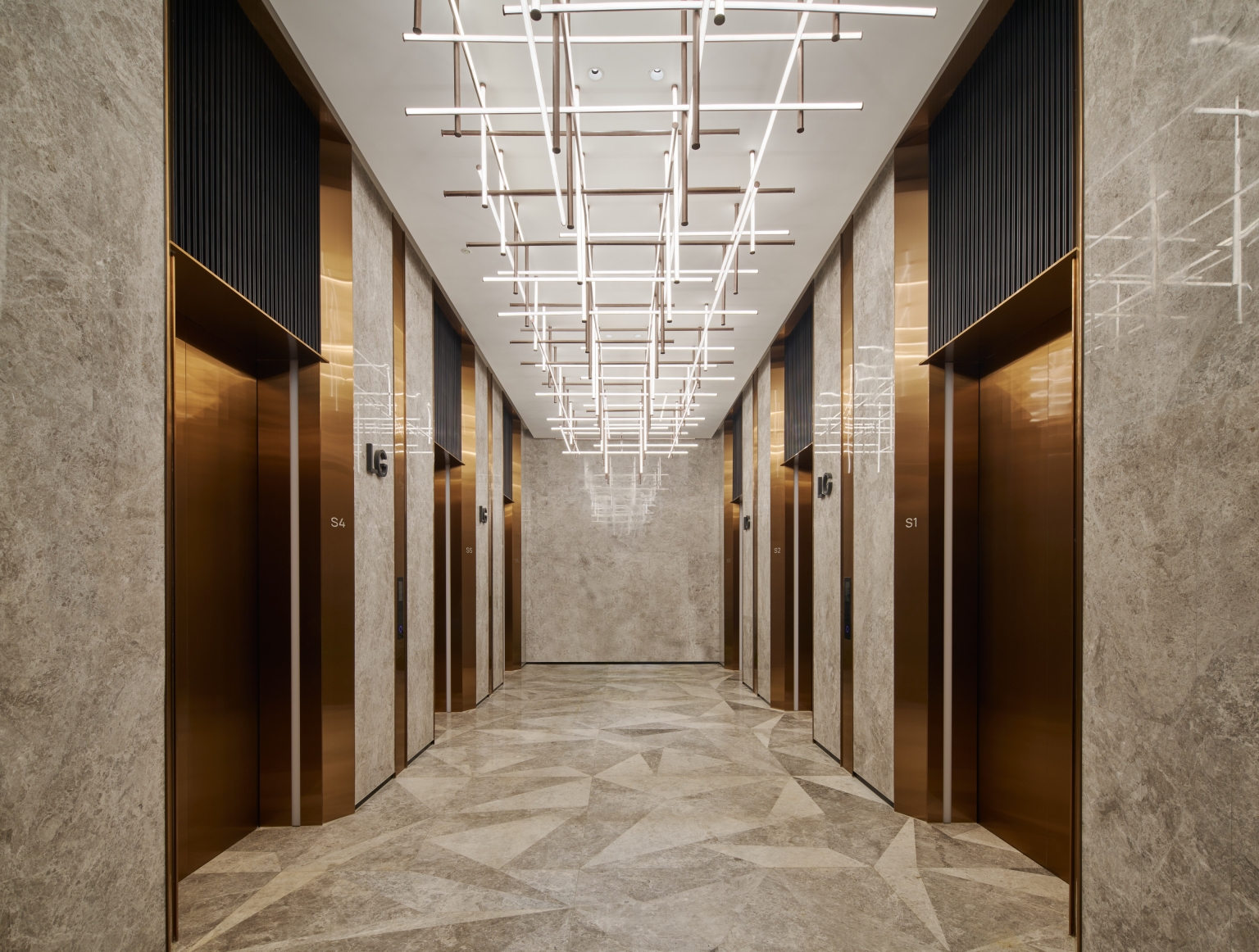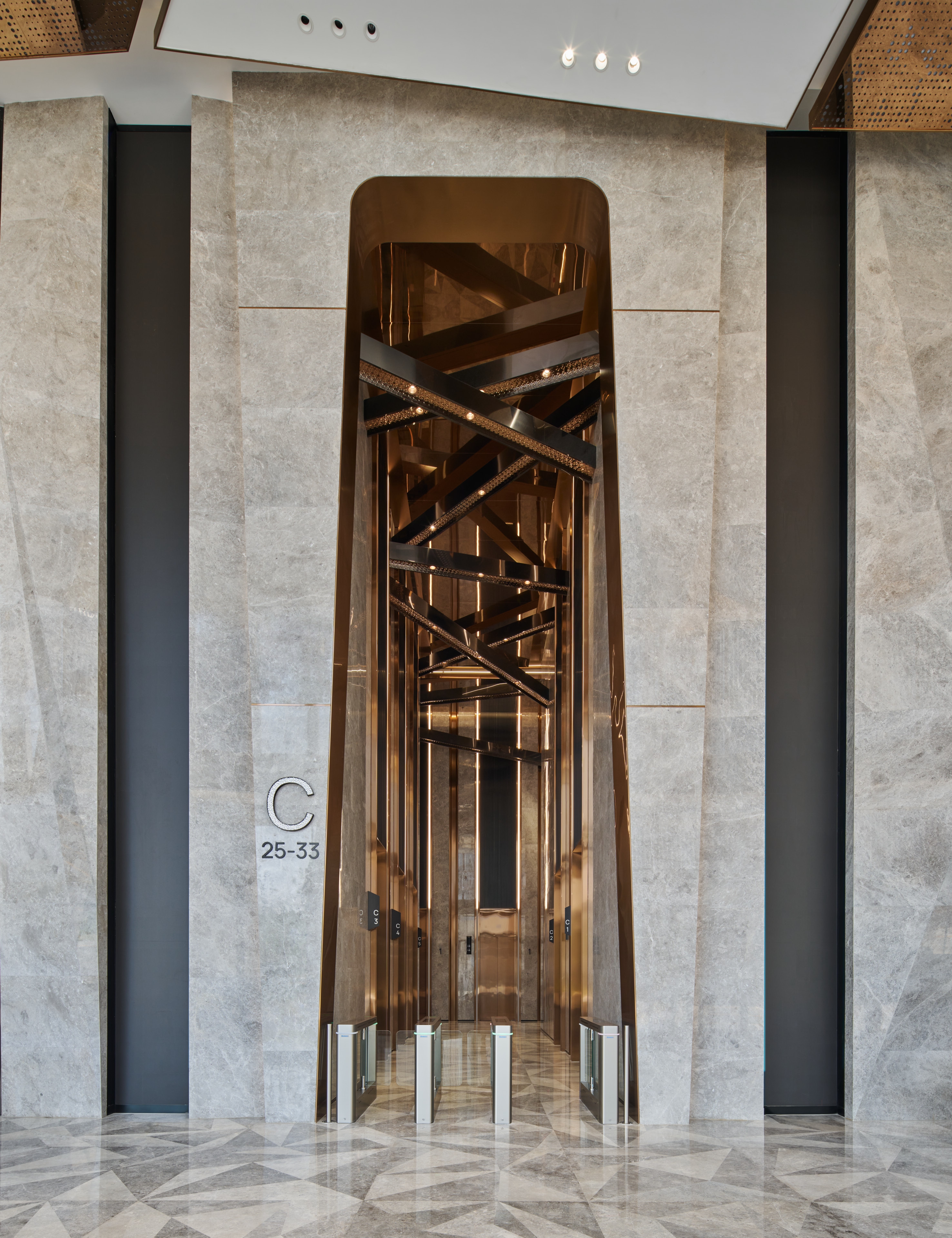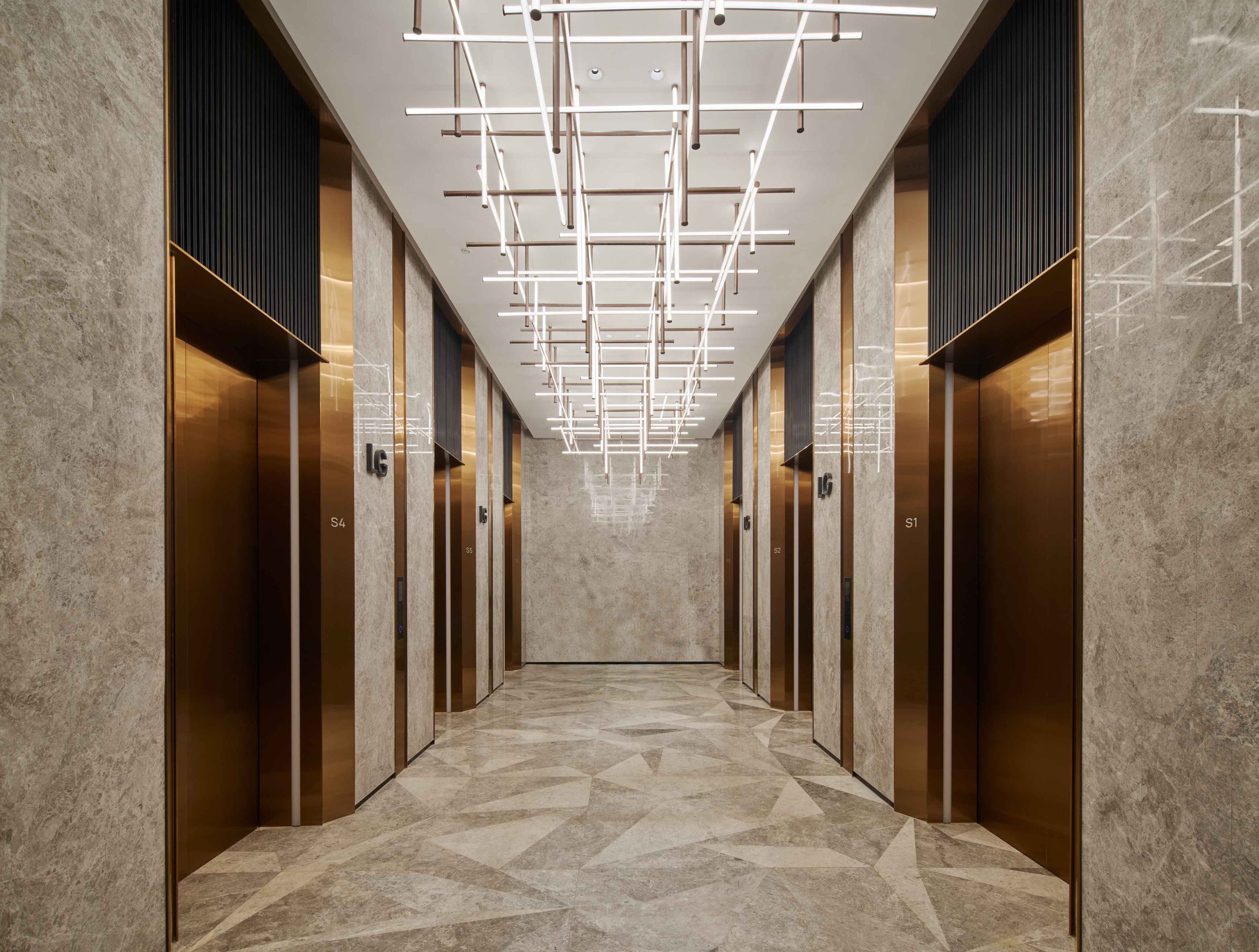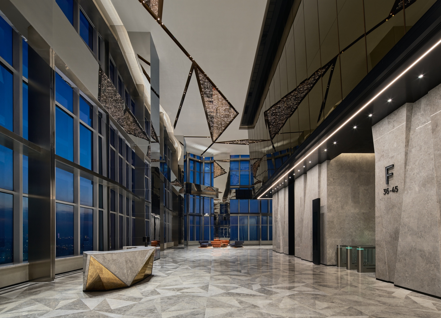 Entry DescriptionThe Office Tower redefines the modern commercial workspace, guided by the "Journey of Light" concept. The project successfully navigates lighting complexities, achieving a striking aesthetic reflecting this concept while meeting technical requirements. The integration of lighting as a design element creates dramatic effects and guides the user experience. The most significant challenge was balancing luxurious aesthetics and practical needs, particularly when using extensive strip lights and backlit features to meet precise LPD criteria with sufficient lux levels. This demanding balance was masterfully addressed in the grand lobby, where the combination of powerful downlights and the triangular backlit ceiling was perfected through multiple mock-ups to achieve ideal brightness, ensuring no dark shadows and adhering to technical requirements. The lift lobbies were designed with an intricate ceiling of intersecting metal beams, reflecting light and shadows like a superimposed light tunnel. This holistic approach includes the rooftop crown, where strategically placed fixtures for easy maintenance and a transparent skylight and dynamic walls interact with natural light, creating a visual spectacle. Throughout the tower, occupant well-being is prioritized with abundant natural light, glare-free adjustable downlights, and concealed linear fixtures to highlight material richness.