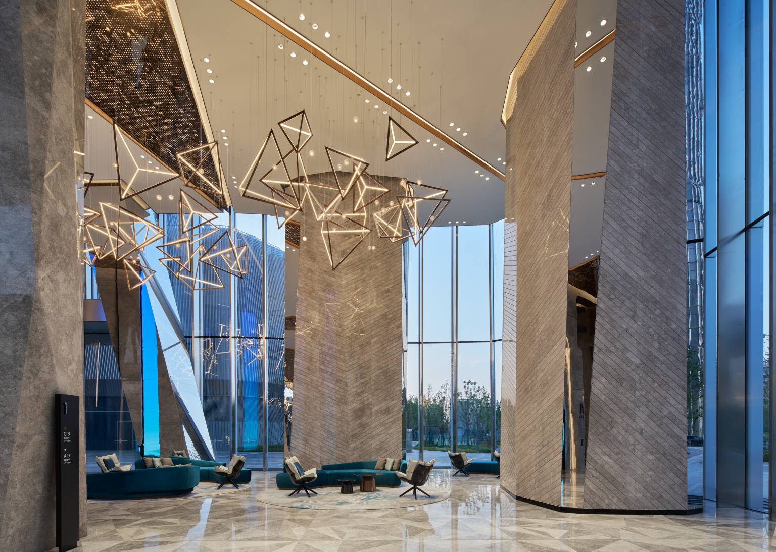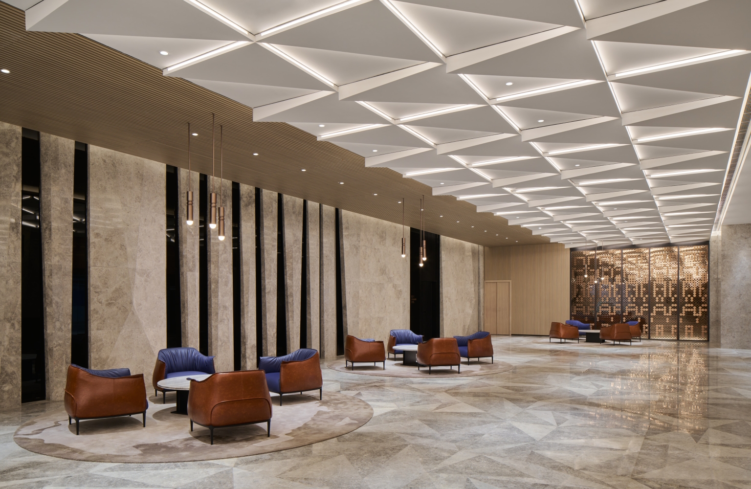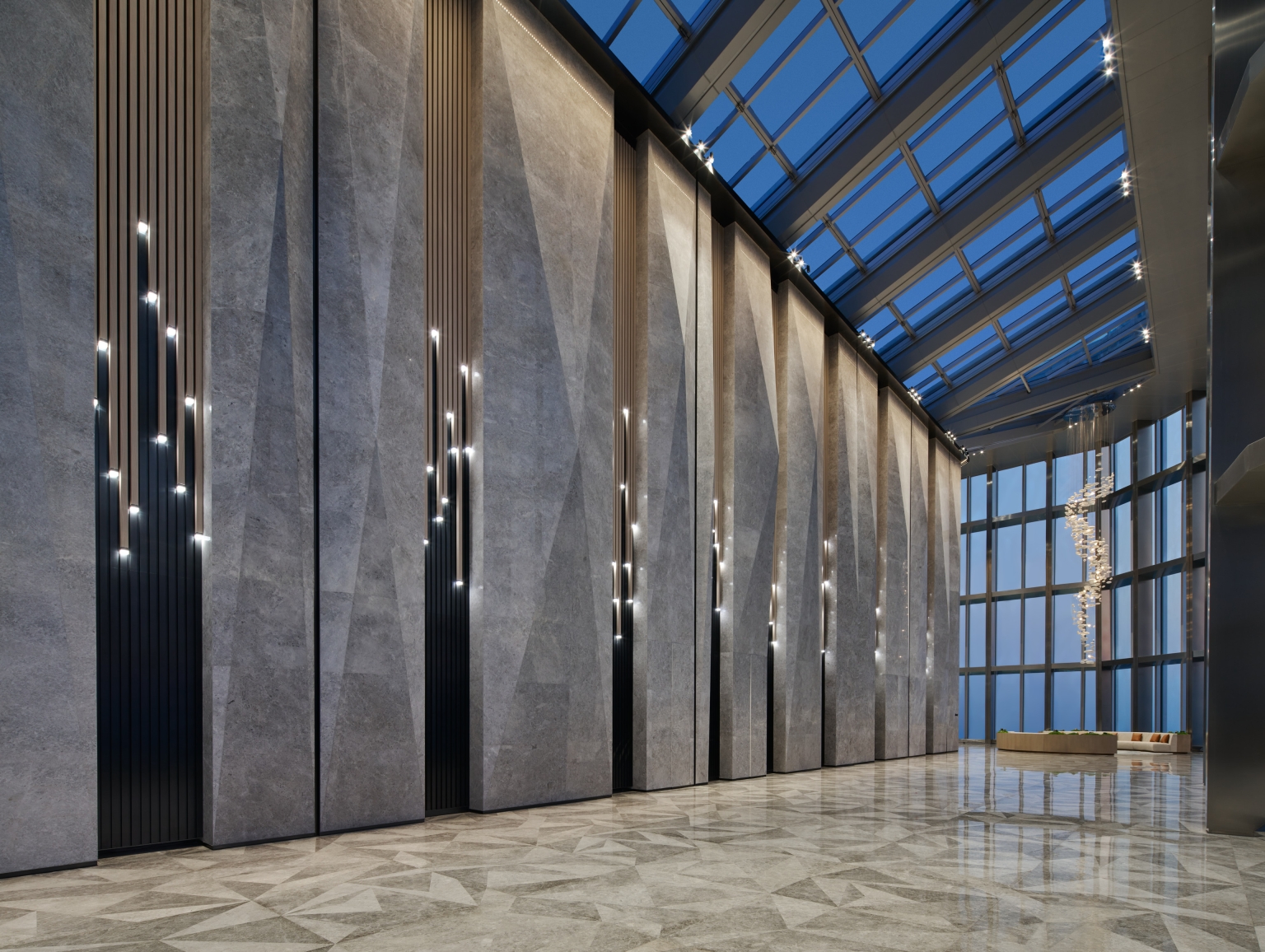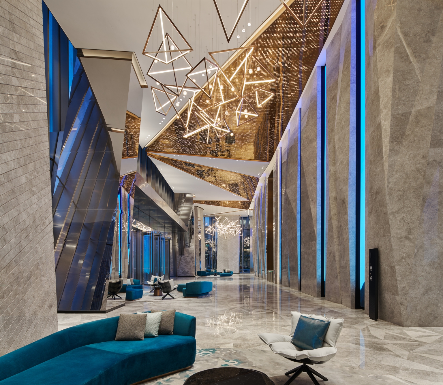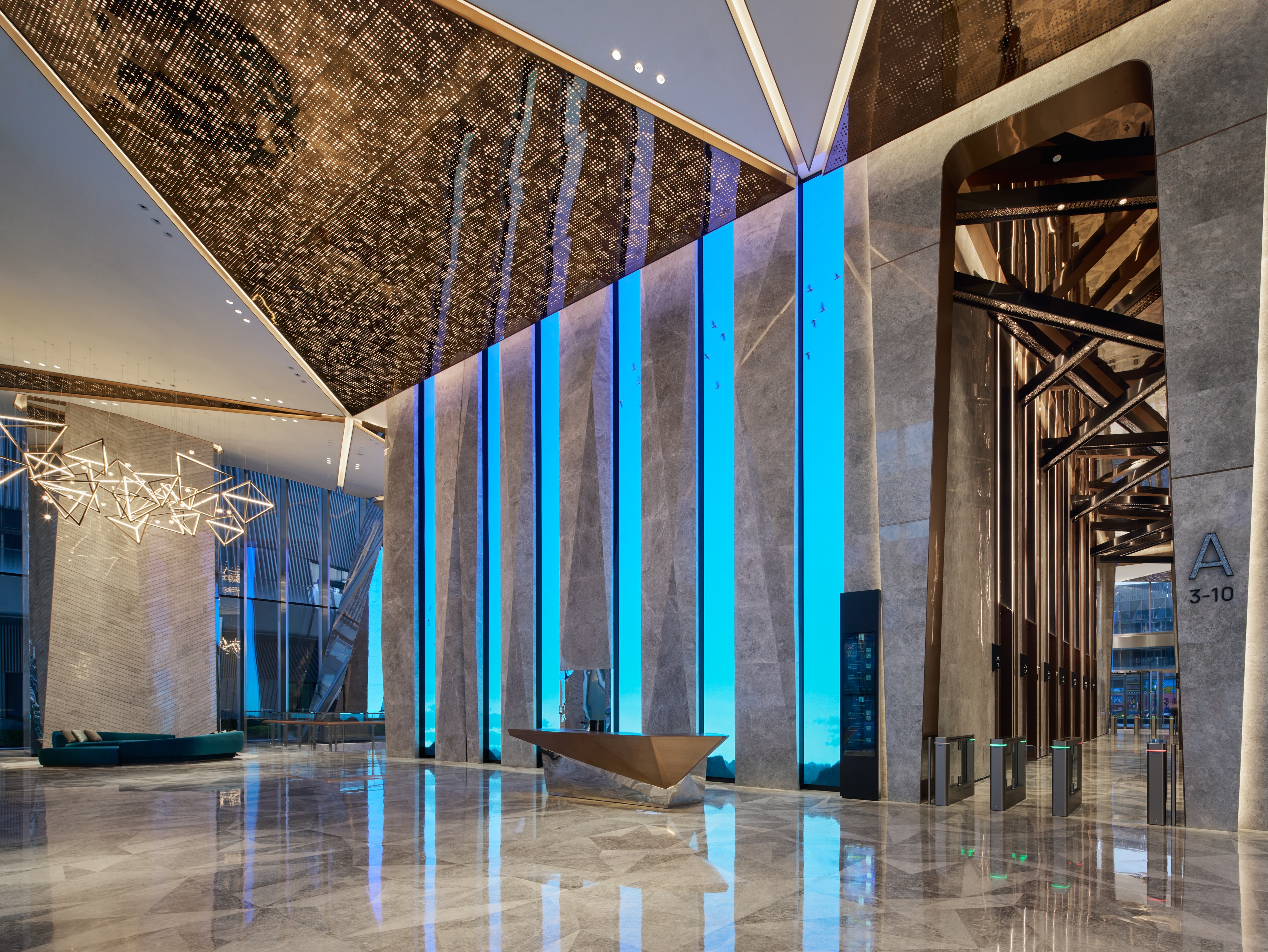 Entry DescriptionThe Office Tower redefines the modern commercial workspace, guided by the "Journey of Light" concept. The project successfully navigates lighting complexities, achieving a striking aesthetic reflecting this concept while meeting technical requirements. The integration of lighting as a design element creates dramatic effects and guides the user experience. The most significant challenge was balancing luxurious aesthetics and practical needs, particularly when using extensive strip lights and backlit features to meet precise LPD criteria with sufficient lux levels. This demanding balance was masterfully addressed in the grand lobby, where the combination of powerful downlights and the triangular backlit ceiling was perfected through multiple mock-ups to achieve ideal brightness, ensuring no dark shadows and adhering to technical requirements. The lift lobbies were designed with an intricate ceiling of intersecting metal beams, reflecting light and shadows like a superimposed light tunnel. This holistic approach includes the rooftop crown, where strategically placed fixtures for easy maintenance and a transparent skylight and dynamic walls interact with natural light, creating a visual spectacle. Throughout the tower, occupant well-being is prioritized with abundant natural light, glare-free adjustable downlights, and concealed linear fixtures to highlight material richness.