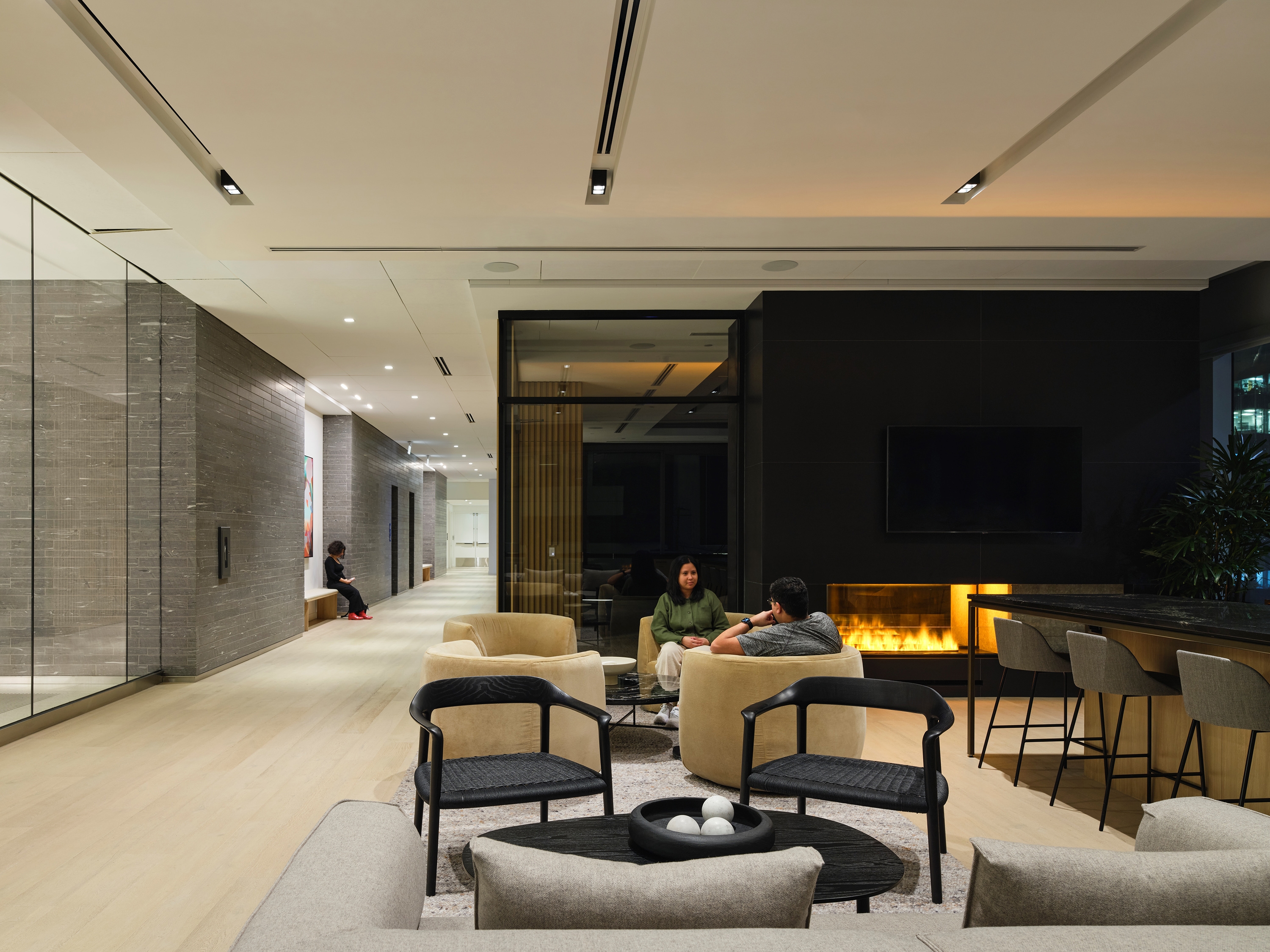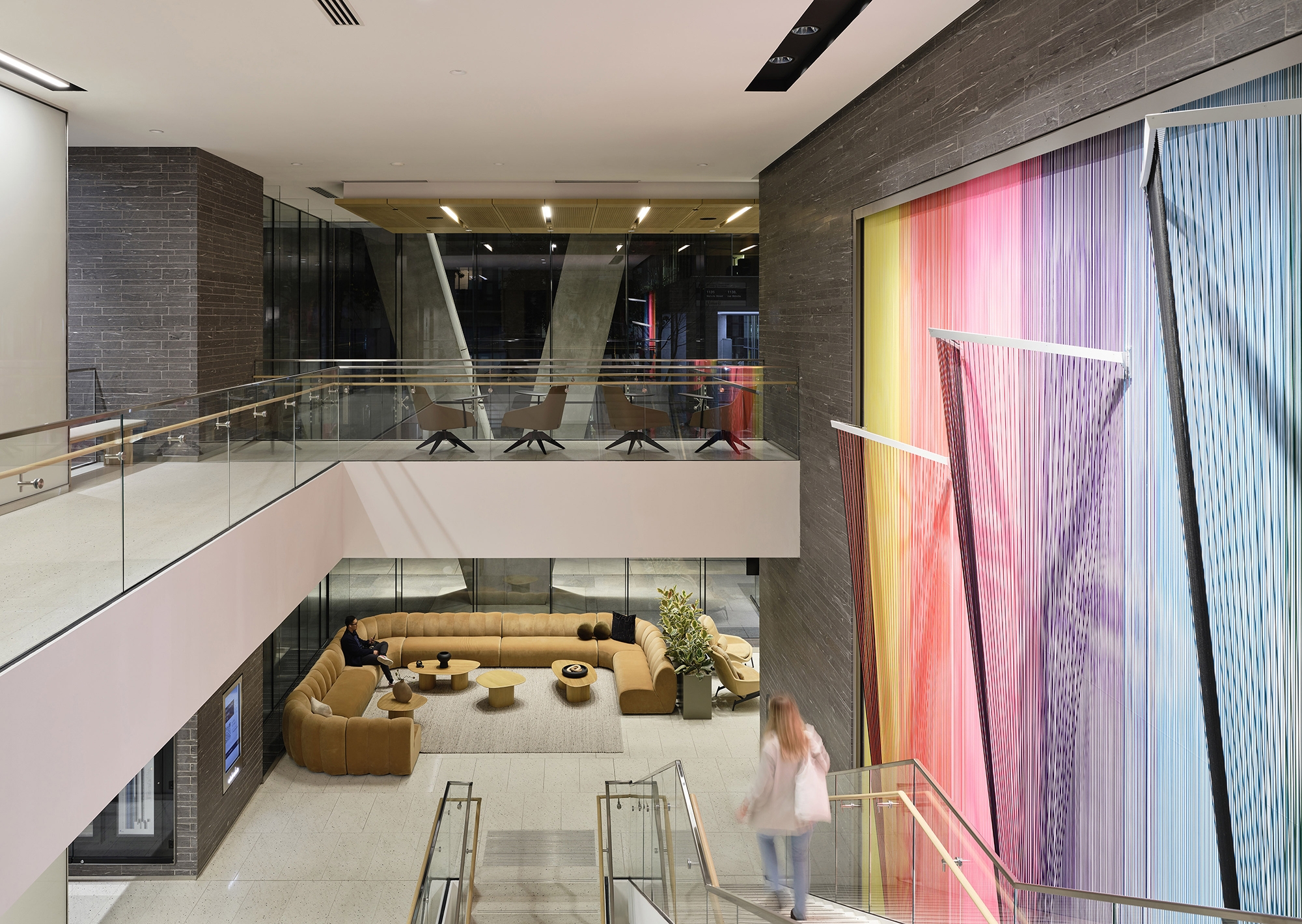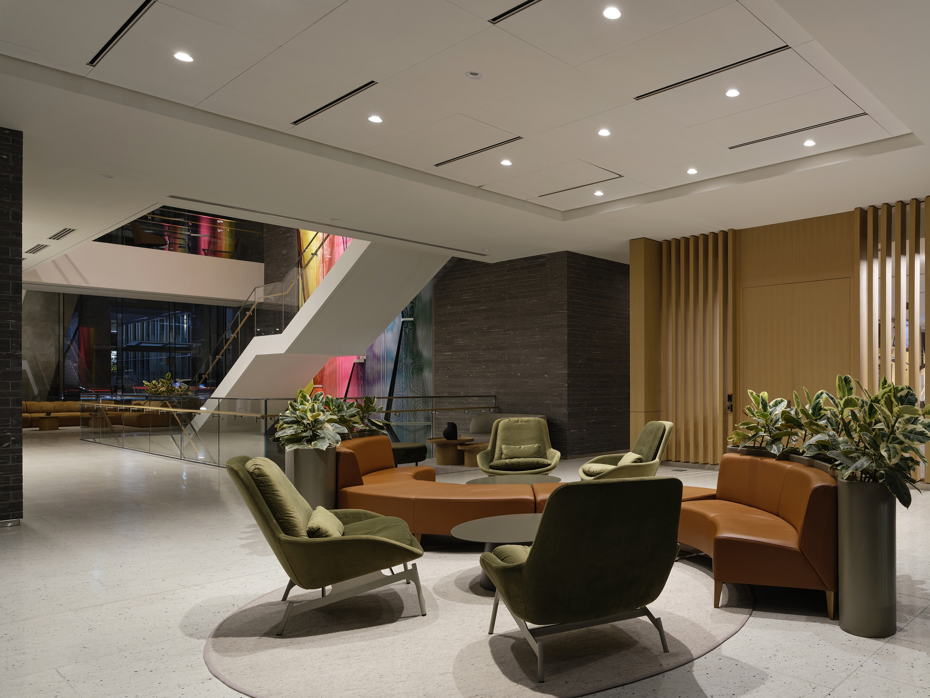 The design is both cohesive and distinctive, allowing each space to express its own character while celebrating luxurious materials—warm wood ceilings, polished marble, and playful works of art. Inspired by theatrical design, the concept embraces a layered approach: top, side, and back lighting animate the interiors through techniques such as downlighting, uplighting, wall grazing, and wall washing. These layers sculpt shadows and bring drama to the cathedral-like elevator lobbies and the three-storey woven cord art installation, while a soft glow highlights the natural warmth of the wood ceilings.