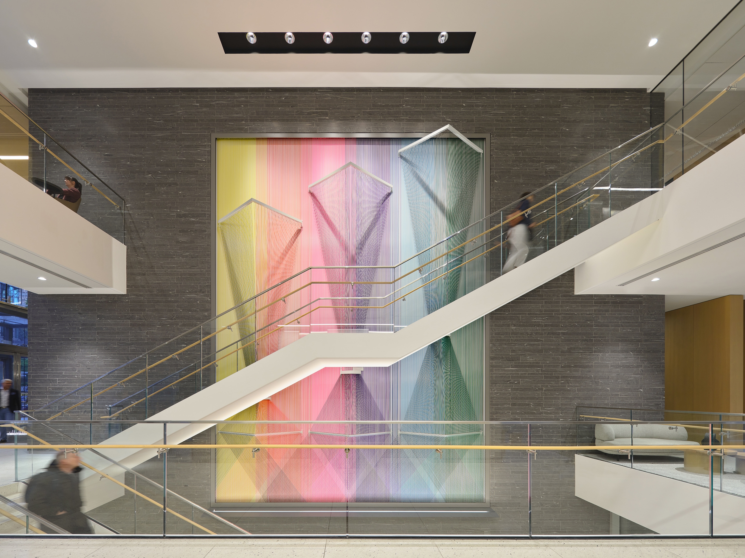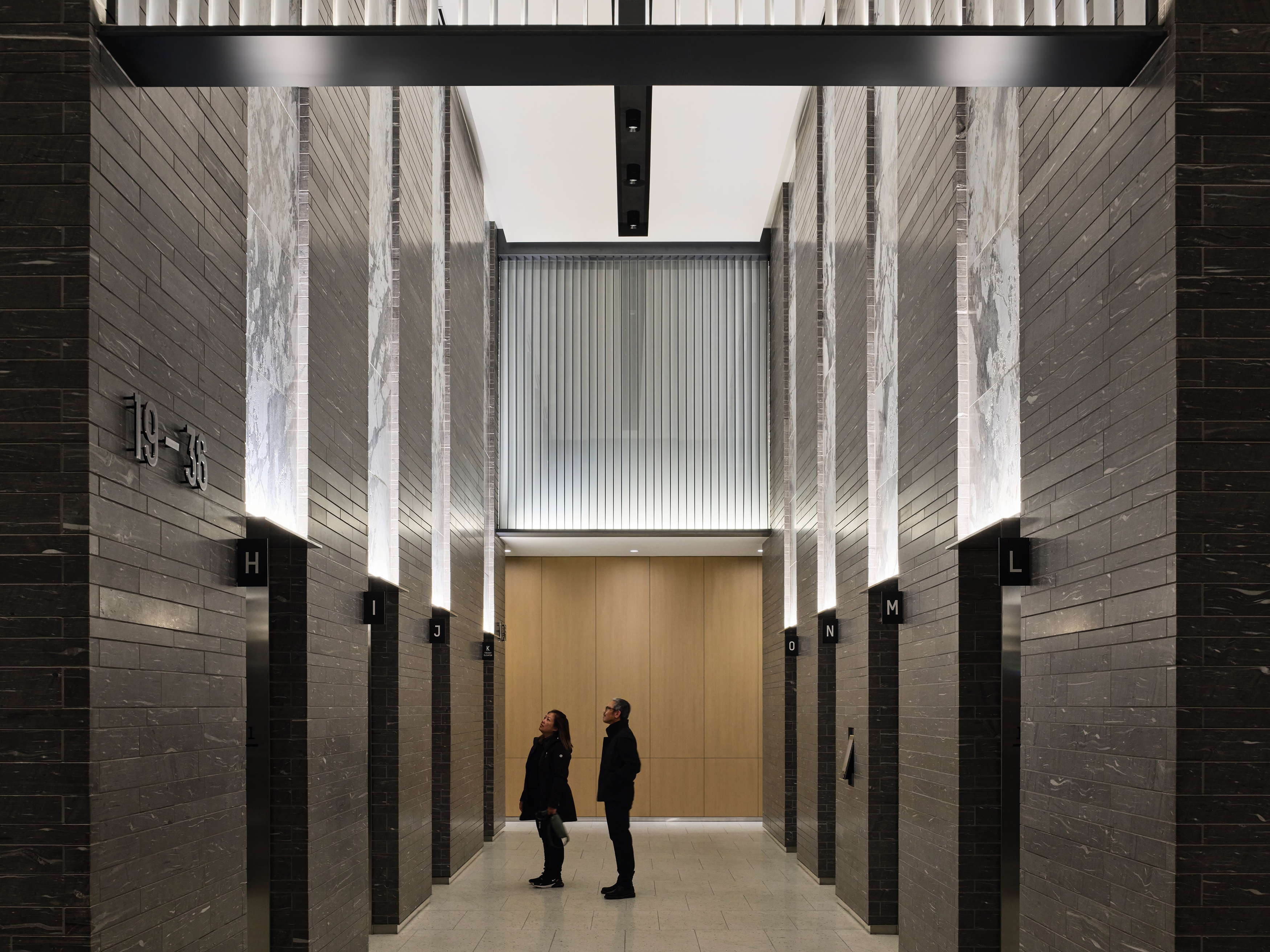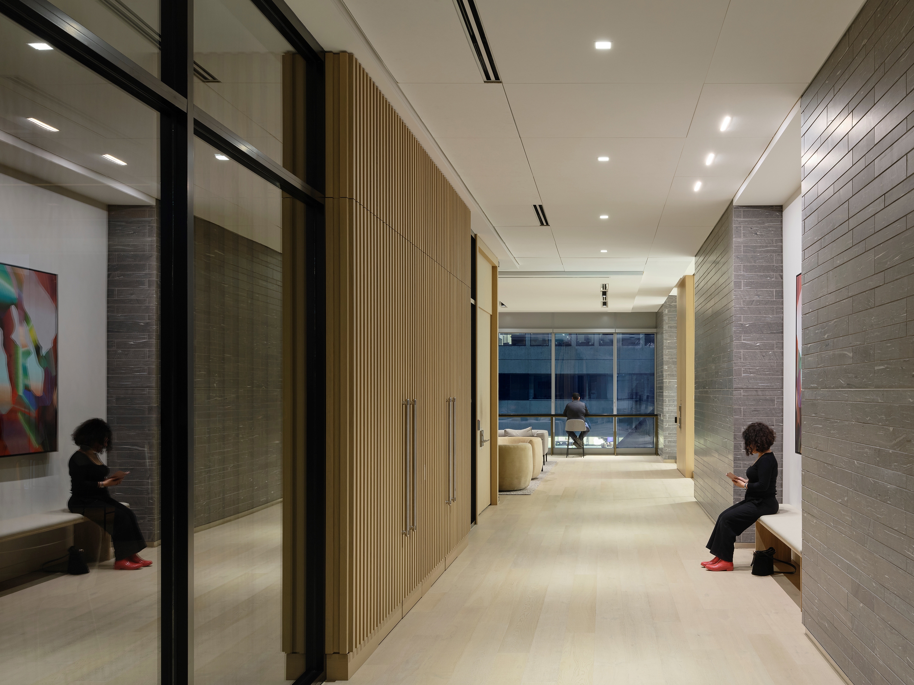 The design is both cohesive and distinctive, allowing each space to express its own character while celebrating luxurious materials—warm wood ceilings, polished marble, and playful works of art. Inspired by theatrical design, the concept embraces a layered approach: top, side, and back lighting animate the interiors through techniques such as downlighting, uplighting, wall grazing, and wall washing. These layers sculpt shadows and bring drama to the cathedral-like elevator lobbies and the three-storey woven cord art installation, while a soft glow highlights the natural warmth of the wood ceilings.