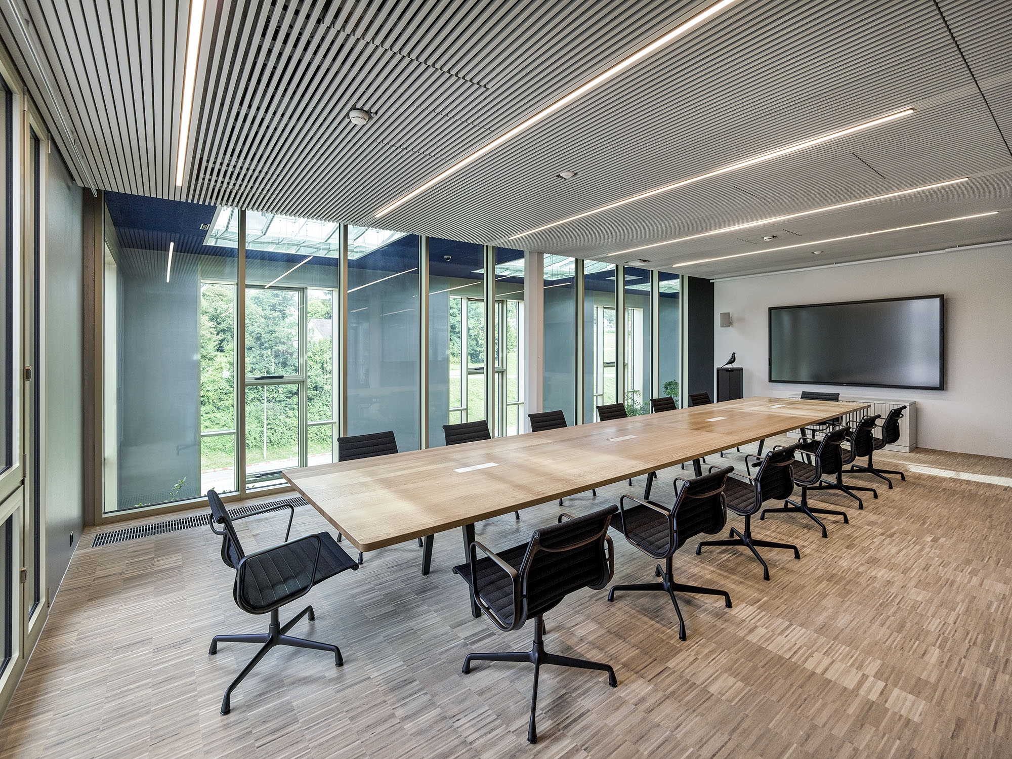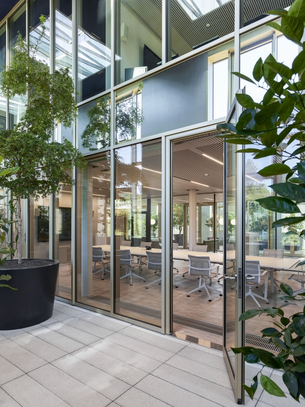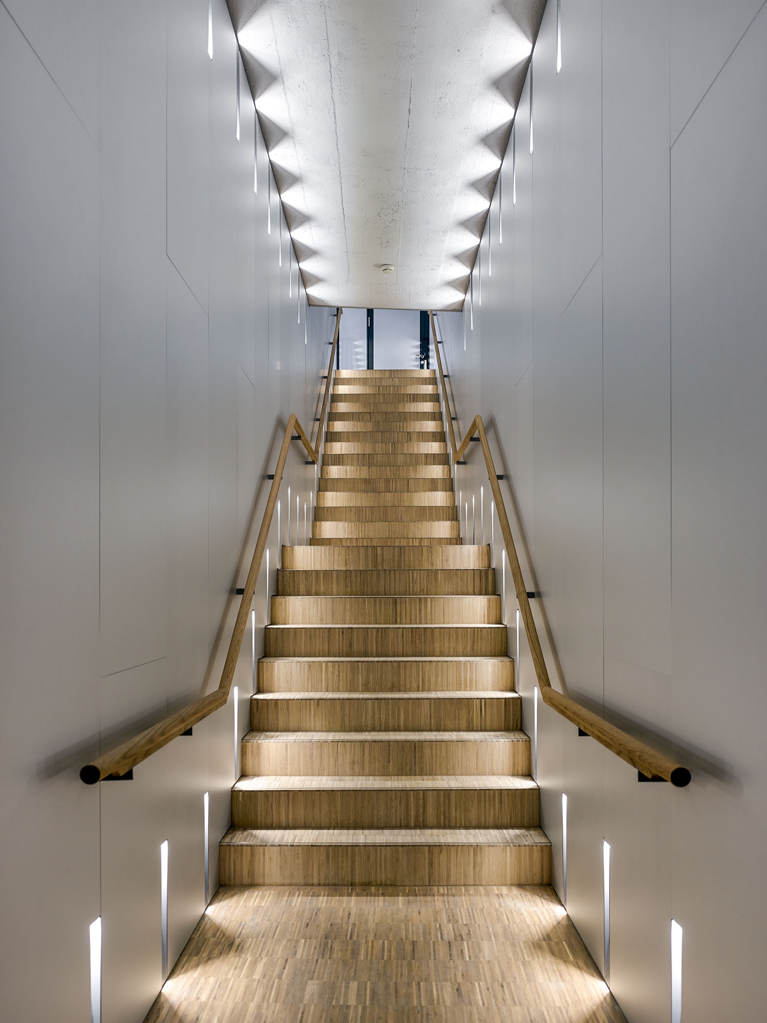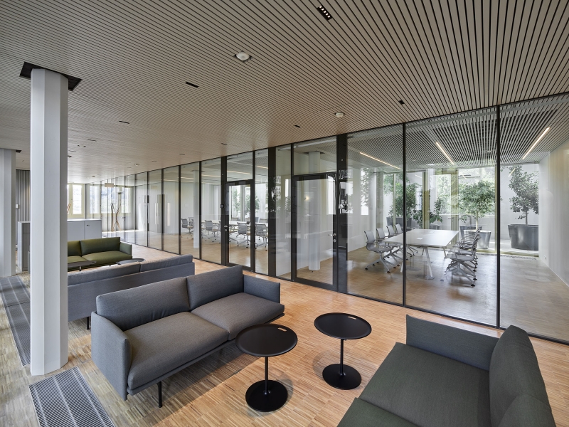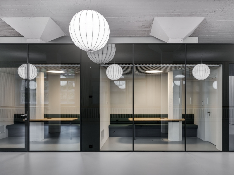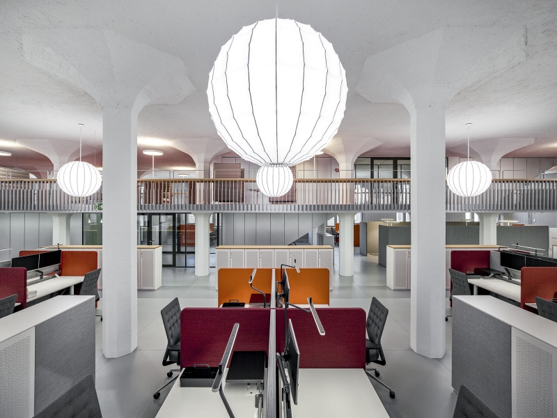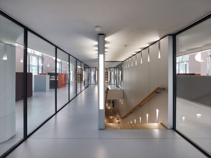 On the site of the former Maggi factory in Kemptthal, an office building with 200 workplaces was built in an existing and heritage protected environment. A two-story extension accommodates the cafeteria and two orangeries as social meeting places and as an executive floor. Considering the aspects of the "human office", an own office concept and acoustically active lighting-design was developed with tunable-white pendants as homage to history. Furthermore, a solution for the unique sculptural staircase-ensemble was developed, which was integrated into the existing building as a connecting element. The embedded staircase-ensemble serves as light carrier, since the historic building substance did't allow mounting possibilities for the lighting. Wall luminaires for direct and indirect brightening of the access zone are used for their illumination. An indirect wall light position optimizes the spatial impression of the squat room height of the mezzanine area, while vertical light bands improve the basic illumination of the passageways. The use and material structuring of the building are specifically supported by the selection and gradation of the light fixtures and color temperatures.