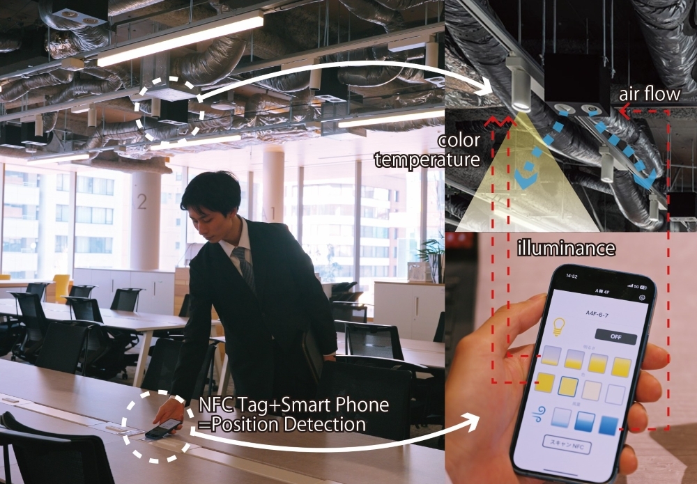 Lighting intensity, color temperature, and air conditioning airflow can be controlled directly by user interface. By utilizing NFC tags, the system detects a user's location and adjusts nearby lighting and air conditioning, making it compatible with free-address office setups. This approach embraces the "task and ambient" concept to customize the working environment, enhancing workplace freedom while simultaneously promoting energy efficiency.