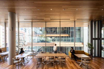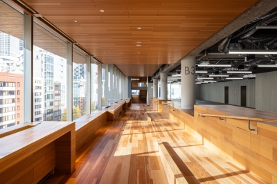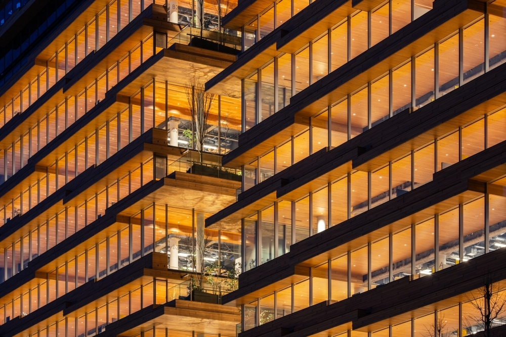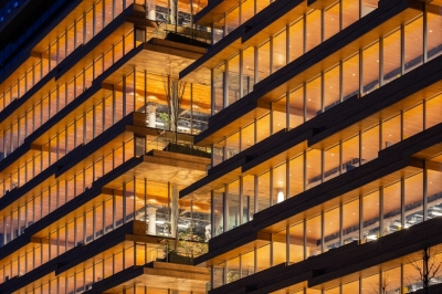 Entry DescriptionThe new headquarters, celebrating its 100th anniversary, redefines the concept of a workplace where people come together to work after the COVID-19 pandemic. As a company responsible for distribution, we aim to embody our commitment to the environment and society, fostering unity on a site divided by a road, with a wooden office featuring tiered floors that connect people and the city through diverse spaces. The outer perimeter of the office features stepped-floor spaces with varying floor and ceiling levels, creating a variety of workplace layouts by combining changes in spatial scale with unique furniture designs. The central area of the floor integrates field control technology, enabling personalized environmental adjustments that achieve a balance between high flexibility, comfort, and energy efficiency. The eaves of the exterior are illuminated to emphasize a distinctly Japanese wooden aesthetic. The stepped-floor spaces are designed to actively bring in natural light, minimizing the need for artificial lighting during the day and achieving significant energy savings. The lighting plan also prioritizes comfort, adjusting the color temperature throughout the day-morning, daytime, and evening to align with the human circadian rhythm.