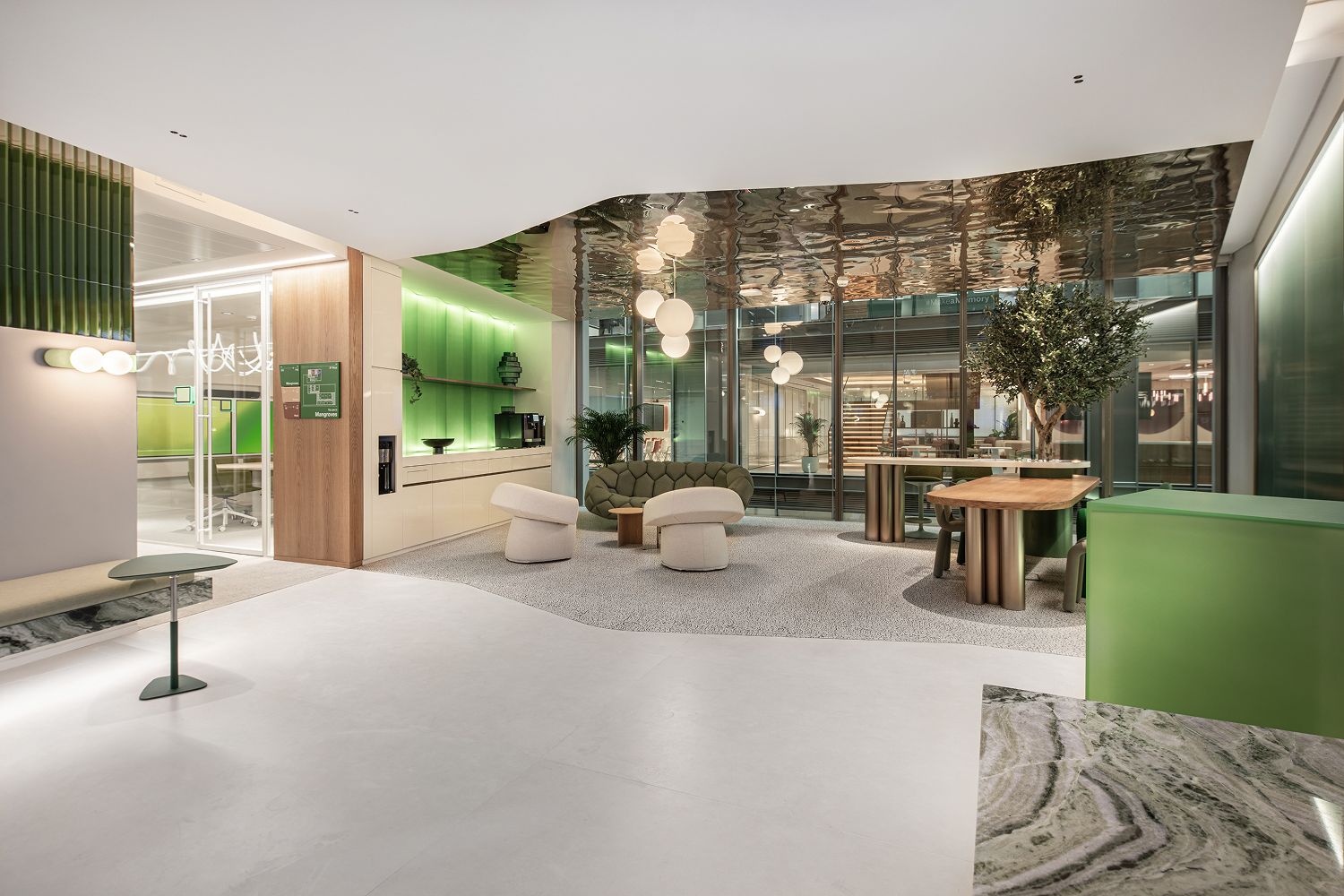 Subtly illuminated surfaces draw out the interior narrative in the reception where light was embedded within the vertical surfaces to reveal the organic depth of a palette inspired by mangroves. This focus on indirect lighting reduces reflections on the mirrored ceiling, leaving space for the decorative luminaires to form patterns on light.