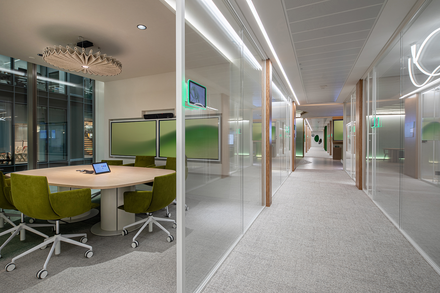 The lighting aesthetic shifts in the blue zone to soften the mood. Rectilinear light fittings were integrated within a wave-like acoustic ceiling, producing a soothing interplay of light and sound above the work areas.