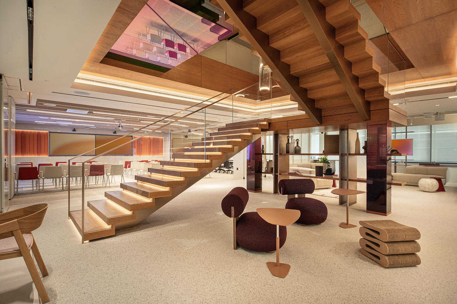 Entry DescriptionThis vibrant workplace features a conceptual design narrative inspired by the UAE’s rich and varied landscapes. Integrated lighting complements the colour-driven design story, enhancing the materiality and playfulness of each zone, while managing the flow between the different areas.