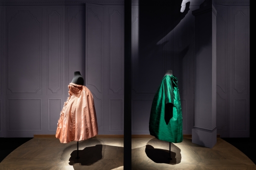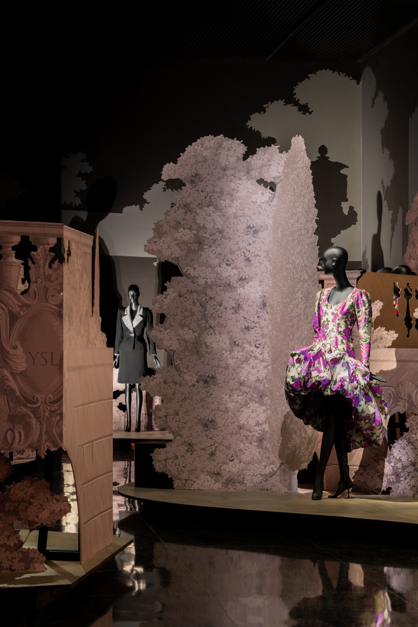 Moving into the next section, a magical garden where the Haute couture collections of House of Yves Saint Laurent are grouped from daywear to individual star commissions to the glamour of evening wear. Here we lit to animate the pieces as if in dialogue with each other. The scenography moves from day to night and we create elongated shadows and chinks of lights for a layered choreography of light and form.