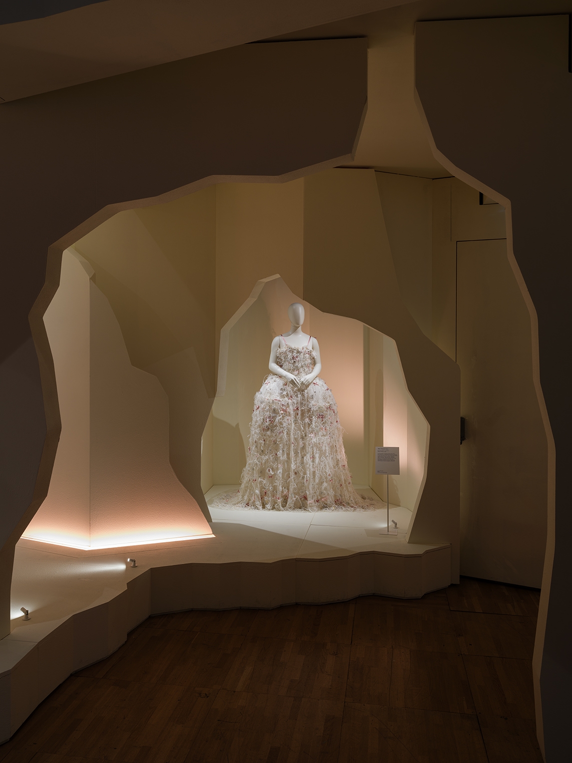 The show ends in a glowing contemporary fashion space inspired by grottos and lakes, set at dawn with pink light and reflections evoking morning sun on water, closing on a celebratory note.